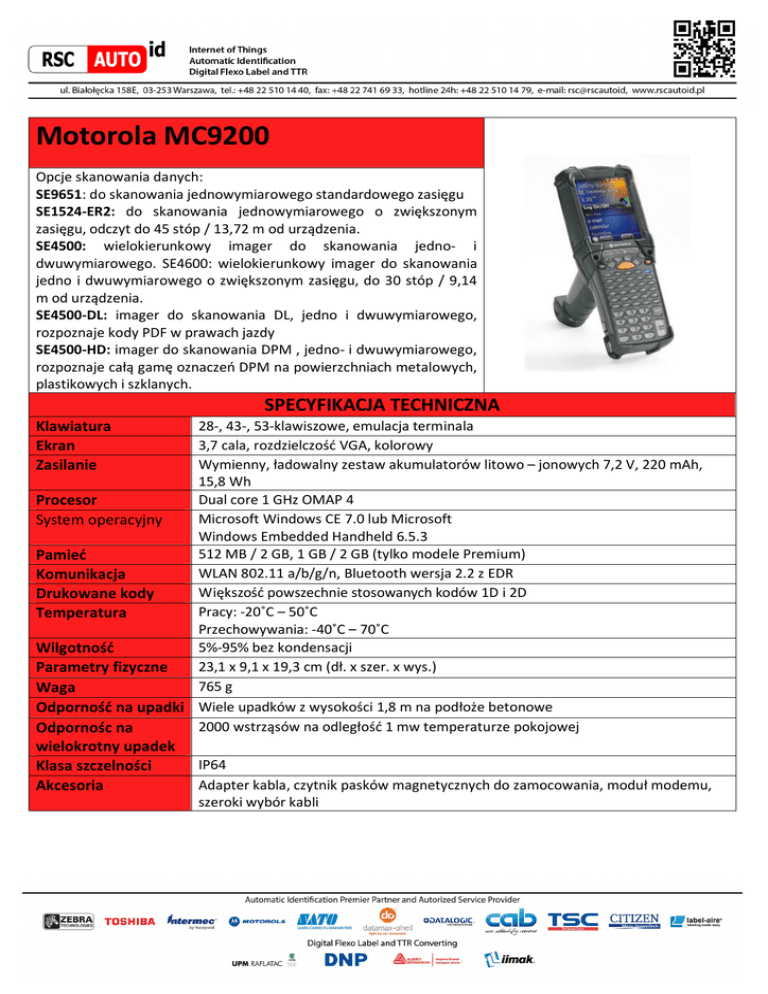Motorola MC9200 Opcje skanowania danych: SE9651: do skanowania jednowymiarowego standardowego zasięgu SE1524-ER2: do skanowania jednowymiarowego o zwiększonym zasięgu, odczyt do 45 stóp / 13,72 m od urządzenia. SE4500: wielokierunkowy imager do skanowania jedno- i dwuwymiarowego. SE4600: wielokierunkowy imager do skanowania jedno i dwuwymiarowego o zwiększonym zasięgu, do 30 stóp / 9,14 m od urządzenia. SE4500-DL: imager do skanowania DL, jedno i dwuwymiarowego, rozpoznaje kody PDF w prawach jazdy SE4500-HD: imager do skanowania DPM , jedno- i dwuwymiarowego, rozpoznaje całą gamę oznaczeń DPM na powierzchniach metalowych, plastikowych i szklanych. SPECYFIKACJA TECHNICZNA Klawiatura Ekran Zasilanie 28-, 43-, 53-klawiszowe, emulacja terminala 3,7 cala, rozdzielczość VGA, kolorowy Wymienny, ładowalny zestaw akumulatorów litowo – jonowych 7,2 V, 220 mAh, 15,8 Wh Dual core 1 GHz OMAP 4 Procesor Microsoft Windows CE 7.0 lub Microsoft System operacyjny Windows Embedded Handheld 6.5.3 512 MB / 2 GB, 1 GB / 2 GB (tylko modele Premium) Pamieć WLAN 802.11 a/b/g/n, Bluetooth wersja 2.2 z EDR Komunikacja Większość powszechnie stosowanych kodów 1D i 2D Drukowane kody Pracy: -20˚C – 50˚C Temperatura Przechowywania: -40˚C – 70˚C 5%-95% bez kondensacji Wilgotność 23,1 x 9,1 x 19,3 cm (dł. x szer. x wys.) Parametry fizyczne 765 g Waga Odporność na upadki Wiele upadków z wysokości 1,8 m na podłoże betonowe 2000 wstrząsów na odległość 1 mw temperaturze pokojowej Odpornośc na wielokrotny upadek Klasa szczelności Akcesoria IP64 Adapter kabla, czytnik pasków magnetycznych do zamocowania, moduł modemu, szeroki wybór kabli