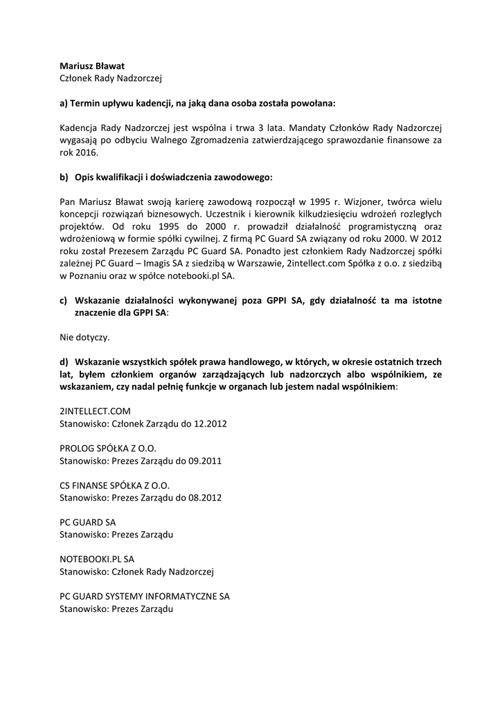 Mariusz Bławat Członek Rady Nadzorczej a) Termin upływu kadencji, na jaką dana osoba została powołana: Kadencja Rady Nadzorczej jest wspólna i trwa 3 lata. Mandaty Członków Rady Nadzorczej wygasają po odbyciu Walnego Zgromadzenia zatwierdzającego sprawozdanie finansowe za rok 2016. b) Opis kwalifikacji i doświadczenia zawodowego: Pan Mariusz Bławat swoją karierę zawodową rozpoczął w 1995 r. Wizjoner, twórca wielu koncepcji rozwiązań biznesowych. Uczestnik i kierownik kilkudziesięciu wdrożeń rozległych projektów. Od roku 1995 do 2000 r. prowadził działalność programistyczną oraz wdrożeniową w formie spółki cywilnej. Z firmą PC Guard SA związany od roku 2000. W 2012 roku został Prezesem Zarządu PC Guard SA. Ponadto jest członkiem Rady Nadzorczej spółki zależnej PC Guard – Imagis SA z siedzibą w Warszawie, 2intellect.com Spółka z o.o. z siedzibą w Poznaniu oraz w spółce notebooki.pl SA. c) Wskazanie działalności wykonywanej poza GPPI SA, gdy działalność ta ma istotne znaczenie dla GPPI SA: Nie dotyczy. d) Wskazanie wszystkich spółek prawa handlowego, w których, w okresie ostatnich trzech lat, byłem członkiem organów zarządzających lub nadzorczych albo wspólnikiem, ze wskazaniem, czy nadal pełnię funkcje w organach lub jestem nadal wspólnikiem: 2INTELLECT.COM Stanowisko: Członek Zarządu do 12.2012 PROLOG SPÓŁKA Z O.O. Stanowisko: Prezes Zarządu do 09.2011 CS FINANSE SPÓŁKA Z O.O. Stanowisko: Prezes Zarządu do 08.2012 PC GUARD SA Stanowisko: Prezes Zarządu NOTEBOOKI.PL SA Stanowisko: Członek Rady Nadzorczej PC GUARD SYSTEMY INFORMATYCZNE SA Stanowisko: Prezes Zarządu e) Informacje na temat prawomocnych wyroków, na mocy których zostałem skazany za przestępstwa oszustwa w okresie co najmniej ostatnich pięciu lat oraz wskazanie, czy w okresie co najmniej ostatnich pięciu lat otrzymałem sądowy zakaz działania jako członek organów zarządzających lub nadzorczych w spółkach prawa handlowego: Nie wystąpiły. f) Szczegóły wszystkich przypadków upadłości, zarządu komisarycznego lub likwidacji, w okresie co najmniej ostatnich pięciu lat, w odniesieniu do podmiotów, w których pełniłem funkcje członka organu zarządzającego lub nadzorczego: Nie dotyczy. g) Informacje, czy prowadzę działalność, która jest konkurencyjna w stosunku do działalności GPPI SA, oraz czy jestem wspólnikiem konkurencyjnej spółki cywilnej lub osobowej albo członkiem organu spółki kapitałowej lub członkiem organu jakiejkolwiek konkurencyjnej osoby prawnej: Nie prowadzi działalności, która jest konkurencyjna w stosunku do działalności emitenta, oraz nie jest wspólnikiem konkurencyjnej spółki cywilnej lub osobowej, ani też członkiem organu spółki kapitałowej lub członkiem organu jakiejkolwiek konkurencyjnej osoby prawnej. h) Informacje, czy figuruję w rejestrze dłużników niewypłacalnych, prowadzonym na podstawie ustawy z dnia 20 sierpnia 1997 r. o Krajowym Rejestrze Sądowym: Nie figuruje.