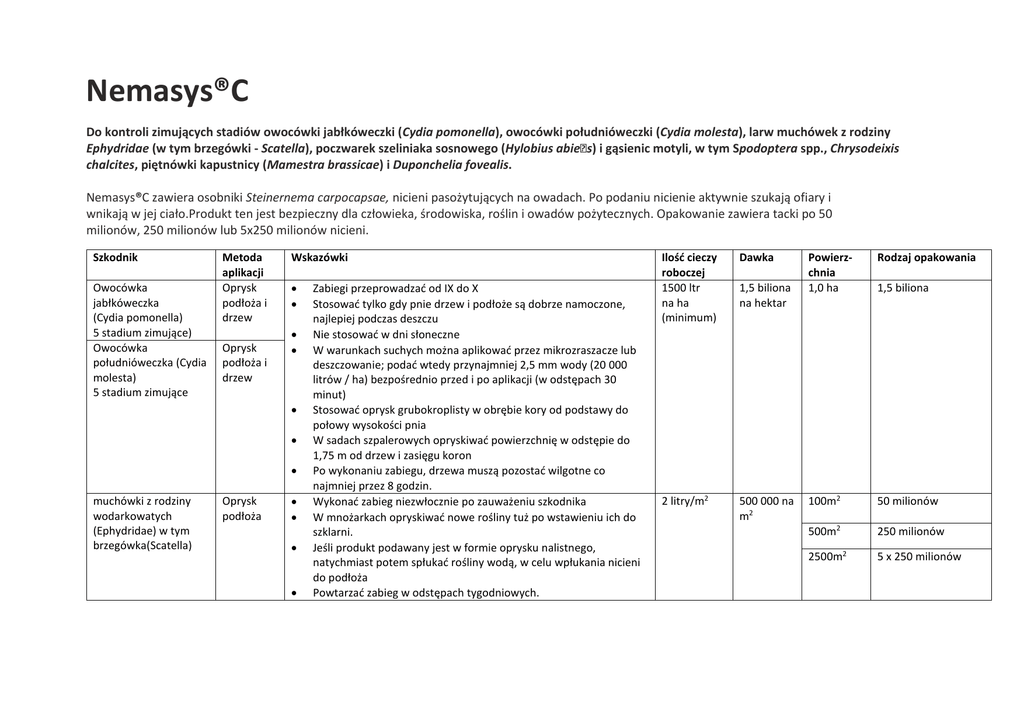 Nemasys®C Do kontroli zimujących stadiów owocówki jabłkóweczki (Cydia pomonella), owocówki południóweczki (Cydia molesta), larw muchówek z rodziny Ephydridae (w tym brzegówki ‐ Scatella), poczwarek szeliniaka sosnowego (Hylobius abie�s) i gąsienic motyli, w tym Spodoptera spp., Chrysodeixis chalcites, piętnówki kapustnicy (Mamestra brassicae) i Duponchelia fovealis. Nemasys®C zawiera osobniki Steinernema carpocapsae, nicieni pasożytujących na owadach. Po podaniu nicienie aktywnie szukają ofiary i wnikają w jej ciało.Produkt ten jest bezpieczny dla człowieka, środowiska, roślin i owadów pożytecznych. Opakowanie zawiera tacki po 50 milionów, 250 milionów lub 5x250 milionów nicieni. Szkodnik Owocówka jabłkóweczka (Cydia pomonella) 5 stadium zimujące) Owocówka południóweczka (Cydia molesta) 5 stadium zimujące Metoda aplikacji Oprysk podłoża i drzew Oprysk podłoża i drzew Wskazówki muchówki z rodziny wodarkowatych (Ephydridae) w tym brzegówka(Scatella) Oprysk podłoża Zabiegi przeprowadzać od IX do X Stosować tylko gdy pnie drzew i podłoże są dobrze namoczone, najlepiej podczas deszczu Nie stosować w dni słoneczne W warunkach suchych można aplikować przez mikrozraszacze lub deszczowanie; podać wtedy przynajmniej 2,5 mm wody (20 000 litrów / ha) bezpośrednio przed i po aplikacji (w odstępach 30 minut) Stosować oprysk grubokroplisty w obrębie kory od podstawy do połowy wysokości pnia W sadach szpalerowych opryskiwać powierzchnię w odstępie do 1,75 m od drzew i zasięgu koron Po wykonaniu zabiegu, drzewa muszą pozostać wilgotne co najmniej przez 8 godzin. Wykonać zabieg niezwłocznie po zauważeniu szkodnika W mnożarkach opryskiwać nowe rośliny tuż po wstawieniu ich do szklarni. Jeśli produkt podawany jest w formie oprysku nalistnego, natychmiast potem spłukać rośliny wodą, w celu wpłukania nicieni do podłoża Powtarzać zabieg w odstępach tygodniowych. Ilość cieczy roboczej 1500 ltr na ha (minimum) Dawka 2 litry/m2 500 000 na m2 1,5 biliona na hektar Powierzchnia 1,0 ha Rodzaj opakowania 100m2 50 milionów 500m2 250 milionów 2500m2 5 x 250 milionów 1,5 biliona Szeliniak sosnowy (Hylobius abietis) Oprysk pni po wyrębie Gąsienice motyli Noctuidae,Pyralidae: Spodoptera spp. Chrysodeixis chalcites Piętnówka kapustnica (Mamestra brassicae) Duponchelia fovealis Oprysk liści Oprysk podłoża Zabiegi wykonywać od V do VIII Stosować do zwalczania szkodników w miejscach wyrębu drzew Stosować w miejscach, w których wyrąb mieł miejsce do końca czerwca roku poprzedniego Upewnić się, że cały pniak został pokryty cieczą roboczą Wykonać zabieg niezwłocznie po zauważeniu szkodnika Przed wykonaniem zabiegu opryskać rośliny wodą Wykonywać zabieg wieczorem lub w pochmurny dzień Opryskiwać bezpośrednio widoczne szkodniki, gąsienice nie pokryte cieczą roboczą nie zostaną zlikwidowane W przypadku oprysku podłoża: w ciągu 2 tygodni po wykonaniu zabiegu utrzymać podłoże w stanie wilgotności W zależności od rodzaju szkodnika, zabieg powtarzać co 5-7 lub 714 dni 0,5 litra na pniak 3 500 000 na pniak 857 pniaków 3 biliony 1000 ltr na ha 500 000 na m2 100m2 50 milionów 500m2 250 milionów 100m2 50 milionów 500m2 250 milionów 3000 ltr na ha 500 000 na m2 Instrukcja stosowania: Usuń wszystkie filtry o otworach mniejszych niż 0,3 mm (300 micron/50msh). Częściowo napełnij zbiornik opryskiwacza czystą, zimną wodą. Włącz mieszadło i nie wyłączaj go aż do zakończenia wykonywania zabiegu. Zawartość opakowania przełóż do dużego wiadra, dodaj 10 l wody i dobrze rozmieszaj roztwór. Produkt musi być dobrze rozpuszczony. Wlej roztwór do zbiornika opryskiwacza i dolej wody. Przed i podczas opryskiwania wciąż utrzymuj roztwór w ruchu. Jeśli jest to potrzebne, dodaj do roztworu zwilżacz (sprawdź w tabeli, czy nie ma przeciwwskazań). Zużyj roztwór bezpośrednio po przygotowaniu. Przygotowanych roztworów nie wolno przechowywać. Środki ostrożności Zabieg nalistny wykonywać w temperaturze 14-30°C Zabieg na podłoże lub pnie stosować przy temperaturze 10-30°C W trakcie wykonywania zabiegu stale mieszać ciecz roboczą Nie stosować po upłynięciu terminu ważności lub jeśli produkt nie był przechowywany zgodnie z zaleceniami W celu uzyskania informacji o możliwości stosowania z innymi środkami, skontaktuj się z dystrybutorem Otwarte opakowanie należy od razu zużyć; nie przechowywać otwartych opakowań. Nie stosować dysz o otworach mniejszych niż 0,5 mm Nie przekraczać ciśnienia 300 psi/20 bar/2000 kPa Przechowywanie i utylizacja Przechowywanie: Produkt należy przechowywać w lodówce, w temperaturze 5°C. NIE ZAMRAŻAĆ. Jednorazowo zużyć całą zawartość opakowania. Nie dzielić zawartości opakowania, ponieważ zawiera ono określoną ilość nicieni. Nie przechowywać roztworu. Przechowywać w miejscu niedostępnym dla dzieci. Produkt zawiera żywe organizmy, wymagające specjalnego przechowywania i stosowania. Przestrzegaj instrukcji stosowania, w celu osiągnięcia optymalnych efektów. Utylizacja: opakowania i pozostałości lub niezużyty produkt można wyrzucać jako odpady przemysłowe zgodnie z obowiązującymi przepisami. Producent zapewnia zgodność produktu z opisem na opakowaniu. Ponieważ przechowywanie i stosowanie są poza zasięgiem naszej kontroli, ani producent ani dystrybutor, nie odpowiadają za żadne szkody powstałe w wyniku nie stosowania się do instrukcji.