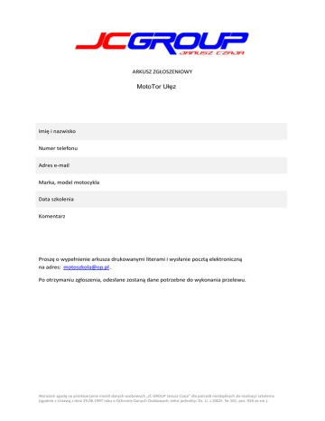 ARKUSZ ZGŁOSZENIOWY MotoTor Ułęz Imię i nazwisko Numer telefonu Adres e-mail Marka, model motocykla Data szkolenia Komentarz Proszę o wypełnienie arkusza drukowanymi literami i wysłanie pocztą elektroniczną na adres: [email protected] . 0TU U0T Po otrzymaniu zgłoszenia, odesłane zostaną dane potrzebne do wykonania przelewu. Wyrażam zgodę na przetwarzanie moich danych osobowych „JC GROUP Janusz Czaja” dla potrzeb niezbędnych do realizacji szkolenia (zgodnie z Ustawą z dnia 29.08.1997 roku o Ochronie Danych Osobowych; tekst jednolity: Dz. U. z 2002r. Nr 101, poz. 926 ze zm.).