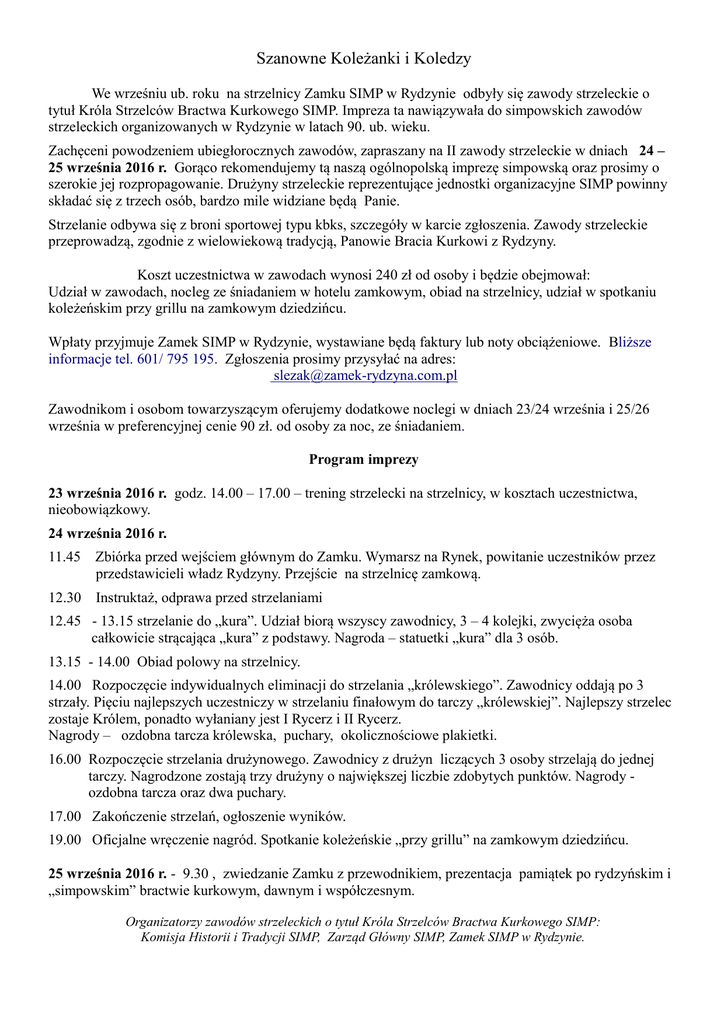 Szanowne Koleżanki i Koledzy We wrześniu ub. roku na strzelnicy Zamku SIMP w Rydzynie odbyły się zawody strzeleckie o tytuł Króla Strzelców Bractwa Kurkowego SIMP. Impreza ta nawiązywała do simpowskich zawodów strzeleckich organizowanych w Rydzynie w latach 90. ub. wieku. Zachęceni powodzeniem ubiegłorocznych zawodów, zapraszany na II zawody strzeleckie w dniach 24 – 25 września 2016 r. Gorąco rekomendujemy tą naszą ogólnopolską imprezę simpowską oraz prosimy o szerokie jej rozpropagowanie. Drużyny strzeleckie reprezentujące jednostki organizacyjne SIMP powinny składać się z trzech osób, bardzo mile widziane będą Panie. Strzelanie odbywa się z broni sportowej typu kbks, szczegóły w karcie zgłoszenia. Zawody strzeleckie przeprowadzą, zgodnie z wielowiekową tradycją, Panowie Bracia Kurkowi z Rydzyny. Koszt uczestnictwa w zawodach wynosi 240 zł od osoby i będzie obejmował: Udział w zawodach, nocleg ze śniadaniem w hotelu zamkowym, obiad na strzelnicy, udział w spotkaniu koleżeńskim przy grillu na zamkowym dziedzińcu. Wpłaty przyjmuje Zamek SIMP w Rydzynie, wystawiane będą faktury lub noty obciążeniowe. Bliższe informacje tel. 601/ 795 195. Zgłoszenia prosimy przysyłać na adres: [email protected] Zawodnikom i osobom towarzyszącym oferujemy dodatkowe noclegi w dniach 23/24 września i 25/26 września w preferencyjnej cenie 90 zł. od osoby za noc, ze śniadaniem. Program imprezy 23 września 2016 r. godz. 14.00 – 17.00 – trening strzelecki na strzelnicy, w kosztach uczestnictwa, nieobowiązkowy. 24 września 2016 r. 11.45 Zbiórka przed wejściem głównym do Zamku. Wymarsz na Rynek, powitanie uczestników przez przedstawicieli władz Rydzyny. Przejście na strzelnicę zamkową. 12.30 Instruktaż, odprawa przed strzelaniami 12.45 - 13.15 strzelanie do „kura”. Udział biorą wszyscy zawodnicy, 3 – 4 kolejki, zwycięża osoba całkowicie strącająca „kura” z podstawy. Nagroda – statuetki „kura” dla 3 osób. 13.15 - 14.00 Obiad polowy na strzelnicy. 14.00 Rozpoczęcie indywidualnych eliminacji do strzelania „królewskiego”. Zawodnicy oddają po 3 strzały. Pięciu najlepszych uczestniczy w strzelaniu finałowym do tarczy „królewskiej”. Najlepszy strzelec zostaje Królem, ponadto wyłaniany jest I Rycerz i II Rycerz. Nagrody – ozdobna tarcza królewska, puchary, okolicznościowe plakietki. 16.00 Rozpoczęcie strzelania drużynowego. Zawodnicy z drużyn liczących 3 osoby strzelają do jednej tarczy. Nagrodzone zostają trzy drużyny o największej liczbie zdobytych punktów. Nagrody ozdobna tarcza oraz dwa puchary. 17.00 Zakończenie strzelań, ogłoszenie wyników. 19.00 Oficjalne wręczenie nagród. Spotkanie koleżeńskie „przy grillu” na zamkowym dziedzińcu. 25 września 2016 r. - 9.30 , zwiedzanie Zamku z przewodnikiem, prezentacja pamiątek po rydzyńskim i „simpowskim” bractwie kurkowym, dawnym i współczesnym. Organizatorzy zawodów strzeleckich o tytuł Króla Strzelców Bractwa Kurkowego SIMP: Komisja Historii i Tradycji SIMP, Zarząd Główny SIMP, Zamek SIMP w Rydzynie.