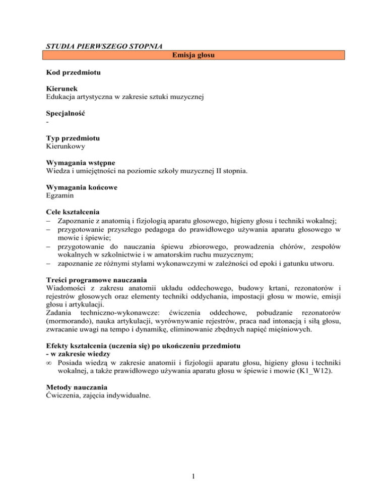 STUDIA PIERWSZEGO STOPNIA Emisja głosu Kod przedmiotu Kierunek Edukacja artystyczna w zakresie sztuki muzycznej Specjalność Typ przedmiotu Kierunkowy Wymagania wstępne Wiedza i umiejętności na poziomie szkoły muzycznej II stopnia. Wymagania końcowe Egzamin Cele kształcenia − Zapoznanie z anatomią i fizjologią aparatu głosowego, higieny głosu i techniki wokalnej; − przygotowanie przyszłego pedagoga do prawidłowego używania aparatu głosowego w mowie i śpiewie; − przygotowanie do nauczania śpiewu zbiorowego, prowadzenia chórów, zespołów wokalnych w szkolnictwie i w amatorskim ruchu muzycznym; − zapoznanie ze różnymi stylami wykonawczymi w zależności od epoki i gatunku utworu. Treści programowe nauczania Wiadomości z zakresu anatomii układu oddechowego, budowy krtani, rezonatorów i rejestrów głosowych oraz elementy techniki oddychania, impostacji głosu w mowie, emisji głosu i artykulacji. Zadania techniczno-wykonawcze: ćwiczenia oddechowe, pobudzanie rezonatorów (mormorando), nauka artykulacji, wyrównywanie rejestrów, praca nad intonacją i siłą głosu, zwracanie uwagi na tempo i dynamikę, eliminowanie zbędnych napięć mięśniowych. Efekty kształcenia (uczenia się) po ukończeniu przedmiotu - w zakresie wiedzy • Posiada wiedzą w zakresie anatomii i fizjologii aparatu głosu, higieny głosu i techniki wokalnej, a także prawidłowego używania aparatu głosu w śpiewie i mowie (K1_W12). Metody nauczania Ćwiczenia, zajęcia indywidualne. 1 Nakład pracy studenta potrzebny do osiągnięcia efektów uczenia się ROK SEMESTR I Punkty ECTS Ilość godzin w semestrze Rodzaj zaliczenia LEGENDA II III 1 2 3 4 0,5 0,5 0,5 0,5 7,5 7,5 7,5 7,5 zs zs zs egz 5 6 zal – zaliczony; zs – zaliczenie ze stopniem; egz – egzamin; ed – egzamin dyplomowy Kryteria oceny Podstawowym kryterium oceny jest nakład pracy studenta. Na koniec każdego semestru student zobowiązany jest do opanowania na pamięć dwóch utworów oraz wykonania ich zgodnie z wymogami techniki wokalnej i interpretacji artystycznej. Literatura (piśmiennictwo) Bregy W., Elementy techniki wokalnej, PWM, Kraków 1974 Marzecka-Kowalska M., Wybrane zagadnienia z metodyki nauczania śpiewu solowego, Zeszyt nr 59, COPSA, Warszawa 1962. Romaniszyn B., Z zagadnień sztuki i pedagogiki wokalnej, PWM, Kraków 1957. Zaleski T., Aparat głosotwórczy a technika wokalna, Zeszyt nr 61, COPSA, Warszawa 1962. Język wykładowy Polski Imię i nazwisko wykładowcy dr hab. Jolanta Gzella dr Stanisław Kierner dr Patrycja Krzeszowska-Kubit dr Bożena Wagner mgr Danuta Dudzińska-Wieczorek mgr Bernadetta Grabias 2