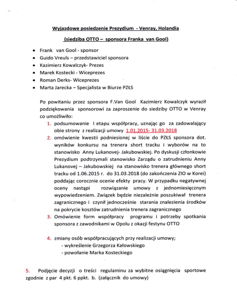 Wviazdowe posiedzenie Prezvdium (siedziba OTTO . o . . . . - - Venrav, Holandia sponsora Franka van Gool) Frank van Gool - sponsor Guido Vreuls - przedstawiciel sponsora Kazimierz Kowalczyk- Prezes Marek Kostecki - Wiceprezes Roman Derks- Wiceprezes Marta Jarecka - specjalista w Biurze PzŁs Po powitaniu przez sponsora F'Van Gool Kazimierz Kowalczyk wyraził podziękowania sponsorowi za zaproszenie do siedziby oTTo w Venray co umożliwiło: 1. podsumowanie l etapu Współpracy, uznając go za zadowalający obie strony z realizacji umowy 1.01.2015- 31.03.2018 2. omówienie kwestii podniesionej W liściedo PzŁs sponsora dot. wyników konkursu na trenera shoń tracku i wyboróW na to stanowisko Anny Lukanovei Jakubowskiej. Po dyskusji członkowie Prezydium podtrzymali stanowisko zarządu o zatrudnieniu Anny Lukanovej - Jakubowskiej na stanowisko trenera glóWnego short tracku od 1.06.20L5 r. do 31.03.2018 (do zakończenia Zlo w Korei) poddając corocznie ocenie efekty pracy. W przypadku negatywnej oceny nastąpi rozwiązanie umowy z jednomiesięcznym Wypowiedzeniem. Związek będzie niezależnie poszukiwał trenera zagranicznego i czynił jednocześnie starania znalezienia środków na pokrycie kosztóW zatrudnienia trenera zagranicznego 3_ omóWienie form współpracy programu sponsora z zawodnikamiw Opolu z i potrzeby spotkania okazjifestynu OTTO 4. zmiany osób współpracujących przy realizacji umowy; wykreślenie Grzegorza Kałowskiego - powofanie Marka Kosteckiego _ 5. Podjęcie decyzji o treściregulaminu za wybitne osiągnięcia spońowe zgodnie z par 4 pkt.6 ppkt. b. (załącznik do umowy) 6. Ustalenie form kontaktu na 7. Kontakty z zarządem oTTo linii sponsor PzŁs Polska _ Piotr Ambrozowicz 8. odwołanie ze strony PZŁs P' Grzegorza Kałowskiego do kontaktów z oTTo i powołanie w jego miejsce p. Marka Kosteckiego W częścill spotkania w składzie: . Kazimierz Kowalczyk- Prezes o . . Marek Kostecki - Wiceprezes Roman Derks- Wiceprezes Marta Jarecka - specjalista W Biurze PzŁs Prezydium podjęło niżej wymienione decyzje: l.Zatrudnienie trenera Anny Lukanovej- Jakubowskiej na stanowisku trenera głóWnego short tracku 2. Spotkanie sponsora szkolenia obu dyscyplin w Opolu z zawodnikami W kadry- grupy centralnego celu omówienia spraw bieźących praw iobowiązków oraz form współpracy z władzami Związku i Biura PzŁs 3. Poinformowanie zawodników shoń tracku o zmianach W organizacji szkolenia ST w sezonie 2015/2016 ; wprowadzenie centralnego szkolenia prowadzonego przez trenera głównego p. Anna Lukanova- Jakubowską _ 4. Prezydium W ramach poszukiwań w zorganizowaniu szkolenia na najWyższym śWiatowym poziomie trenera zagranicznego i po uwzględnieniu uWag sponsora, postanowilo zWrócić się o współpracę do Marca Gagnona- trenera centralnego szkolenia Kanady ( byiego wybitnego światowejsławyzawodnika) z trenerem głównym kadry narodowej toru krótkiego w Polsce - Anną LukanowąJakubowską.