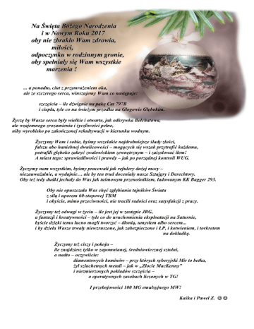 Na Święta Bożego Narodzenia i w Nowym Roku 2017 oby nie zbrakło Wam zdrowia, miłości, odpoczynku w rodzinnym gronie, oby spełniały się Wam wszystkie marzenia ! ... a ponadto, ciut z przymrużeniem oka, ale ze szczerego serca, winszujemy Wam co następuje: szczęścia – ile dźwignie na pakę Cat 797B i ciepła, tyle co na świeżym przodku na Głogowie Głębokim. Życzę by Wasze serca były wielkie i otwarte, jak odkrywka Bełchatowa, ale wzajemnego zrozumienia i życzliwości pełne, niby wyrobisko po zakończonej rekultywacji w kierunku wodnym. Życzymy Wam i sobie, byśmy wszelakie najdrobniejsze ślady złości, fałszu abo haniebnej dwulicowości – mogących się wszak przytrafić każdemu, potrafili głęboko zakryć zwałowiskiem zewnętrznym – i zaizolować iłem! A miast tego: sprawiedliwości i prawdy – jak po porządnej kontroli WUG. Życzymy nam wszystkim, byśmy pracowali jak refulery dużej mocy – niezauważalnie, a wydajnie… ale by ten trud doceniały nasze Sztajgry i Derechtory. Oby też tedy dudki jechały do Was jak taśmowym przenośnikiem, ładowanym KK Bagger 293. Oby nie opuszczała Was chęć zgłębiania tajników Świata z siłą i uporem 60-stopowej TBM i obyście, mimo przeciwności, nie tracili radości oraz satysfakcji z pracy. Życzymy też odwagi w życiu – ile jest jej w zastępie JRG, a fantazji i kreatywności – tyle co do uruchomienia eksploatacji na Saturnie, byście dzięki temu łacno mogli tworzyć – dłonią, umysłem albo sercem... i by dzieła Wasze trwały niewzruszone, jak zabezpieczone i ŁP, i kotwieniem, i torkretem na dokładkę. Życzymy też ciszy i pokoju – ile znajdziesz tylko w zapomnianej, średniowiecznej sztolni, a nadto – oczywiście: diamentowych kominów – przy których syberyjski Mir to betka, żył szlachetnych metali – jak w „Złocie MacKenny” i niezmierzonych pokładów szczęścia – o operatywnych zasobach liczonych w TG! I przebojowości 100 MG emulsyjnego MW! Kaśka i Paweł Z.