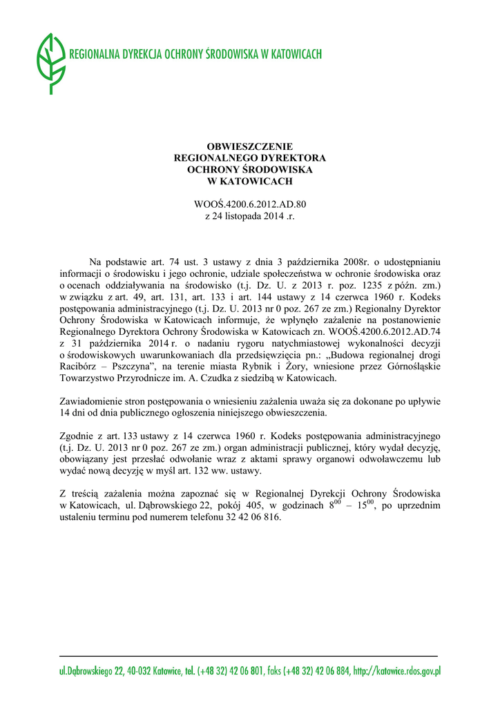OBWIESZCZENIE REGIONALNEGO DYREKTORA OCHRONY ŚRODOWISKA W KATOWICACH WOOŚ.4200.6.2012.AD.80 z 24 listopada 2014 .r. Na podstawie art. 74 ust. 3 ustawy z dnia 3 października 2008r. o udostępnianiu informacji o środowisku i jego ochronie, udziale społeczeństwa w ochronie środowiska oraz o ocenach oddziaływania na środowisko (t.j. Dz. U. z 2013 r. poz. 1235 z późn. zm.) w związku z art. 49, art. 131, art. 133 i art. 144 ustawy z 14 czerwca 1960 r. Kodeks postępowania administracyjnego (t.j. Dz. U. 2013 nr 0 poz. 267 ze zm.) Regionalny Dyrektor Ochrony Środowiska w Katowicach informuje, że wpłynęło zażalenie na postanowienie Regionalnego Dyrektora Ochrony Środowiska w Katowicach zn. WOOŚ.4200.6.2012.AD.74 z 31 października 2014 r. o nadaniu rygoru natychmiastowej wykonalności decyzji o środowiskowych uwarunkowaniach dla przedsięwzięcia pn.: „Budowa regionalnej drogi Racibórz – Pszczyna”, na terenie miasta Rybnik i Żory, wniesione przez Górnośląskie Towarzystwo Przyrodnicze im. A. Czudka z siedzibą w Katowicach. Zawiadomienie stron postępowania o wniesieniu zażalenia uważa się za dokonane po upływie 14 dni od dnia publicznego ogłoszenia niniejszego obwieszczenia. Zgodnie z art. 133 ustawy z 14 czerwca 1960 r. Kodeks postępowania administracyjnego (t.j. Dz. U. 2013 nr 0 poz. 267 ze zm.) organ administracji publicznej, który wydał decyzję, obowiązany jest przesłać odwołanie wraz z aktami sprawy organowi odwoławczemu lub wydać nową decyzję w myśl art. 132 ww. ustawy. Z treścią zażalenia można zapoznać się w Regionalnej Dyrekcji Ochrony Środowiska w Katowicach, ul. Dąbrowskiego 22, pokój 405, w godzinach 800 – 1500, po uprzednim ustaleniu terminu pod numerem telefonu 32 42 06 816.