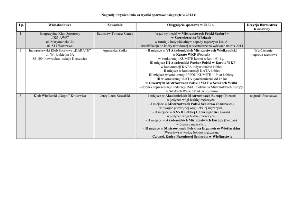 Nagrody i wyróżnienia za wyniki sportowe osiągnięte w 2013 r. Lp. Wnioskodawca Zawodnik Osiągnięcia sportowe w 2013 r. 1. Integracyjny Klub Sportowy „IKS-AWF” ul. Marymoncka 34 01-813 Warszawa Inowrocławski Klub Sportowy „KARATE” ul. Wł. Łokietka 6A 88-100 Inowrocław- sekcja Kruszwica Radosław Tomasz Stanek Klub Wioślarski „Gopło” Kruszwica Jerzy Leon Kowalski - brązowy medal w Mistrzostwach Polski Seniorów w Szermierce na Wózkach w turnieju indywidualnym szpady mężczyzn kat. A - kwalifikacja do kadry narodowej w szermierce na wózkach na rok 2014 - II miejsce w VI Akademickich Mistrzostwach Wielkopolski w Karate WKF (Poznań) w konkurencji KUMITE kobiet w kat. - 61 kg, - III miejsce III Akademicki Puchar Polski w Karate WKF w konkurencji KATA indywidualne kobiet - II miejsce w konkurencji KATA kobiet, III miejsce w konkurencji IPPON KUMITE +19 lat kobiety, III w konkurencji KATA synchroniczne od 16 lat w Otwartych Mistrzostwach Polski IMAF w Sztukach Walki - członek reprezentacji Federacji IMAF Polska na Mistrzostwach Europy w Sztukach Walki IMAF w Rumunii - I miejsce w Akademickich Mistrzostwach Europy (Poznań) w jedynce wagi lekkiej mężczyzn, - I miejsce w Mistrzostwach Polski Seniorów (Kruszwica) w dwójce podwójnej wagi lekkiej mężczyzn, - II miejsce w XXVII Letniej Uniwersjadzie (Kazań) w jedynce wagi lekkiej mężczyzn, - II miejsce w Akademickich Mistrzostwach Europy (Poznań) w ósemce mężczyzn, - III miejsce w Mistrzostwach Polski na Ergometrze Wioślarskim (Wrocław) w wadze lekkiej mężczyzn, - Członek Kadry Narodowej Seniorów w Wioślarstwie 2. 3. Agnieszka Zadka Decyzja Burmistrza Kruszwicy ---- Wyróżnienie - nagroda rzeczowa nagroda finansowa 4. Klub Wioślarski „Gopło” Kruszwica Artur Mikołajczewski 5. Klub Wioślarski „Gopło” Kruszwica Mateusz Kościński 6. Klub Wioślarski „Gopło” Kruszwica Bogumił Maciej Łyczak 7. Klub Wioślarski „Gopło” Kruszwica Jakub Piotr Wiśniewski 8. Klub Wioślarski „Gopło” Kruszwica Michał Ostrowski 9. Klub Wioślarski „Gopło” Kruszwica Bartosz Januszek - I miejsce w Mistrzostwa Polski na Ergometrze Wioślarskim (Wrocław) w wadze lekkiej mężczyzn, - I miejsce w jedynce wagi lekkiej mężczyzn i I miejsce w dwójce podwójnej wagi lekkiej mężczyzn Mistrzostwa Polski Seniorów (Kruszwica) - I miejsce w Pucharze Świata Seniorów (Eton – Anglia) w dwójce podwójnej wagi lekkiej mężczyzn, - V miejsce w Pucharze Świata (Lucerna - Szwajcaria) w dwójce podwójnej wagi lekkiej mężczyzn, - VIII miejsce w Mistrzostwach Świata Seniorów (Chungiu, Republika Koreii) w dwójce podwójnej wagi lekkiej mężczyzn, - VII miejsce w dwójce podwójnej wagi lekkiej mężczyzn – Mistrzostwa Europy Seniorów Sewilla - Hiszpania, - Członek Kadry Narodowej Seniorów w wioślarstwie – I miejsce w Mistrzostwach Województwa Kujawsko-Pomorskiego w Wioślarstwie (Bydgoszcz) w czwórce juniorów nagroda finansowa – III miejsce w Ogólnopolskiej Olimpiadzie Młodzieży w Wioślarstwie (Kruszwica) w jedynce juniorów młodszych – I miejsce w Mistrzostwach Województwa Kujawsko-Pomorskiego w Wioślarstwie (Bydgoszcz) w czwórce juniorów nagroda finansowa - I miejsce w Mistrzostwach Województwa Kujawsko-Pomorskiego (Bydgoszcz) w czwórce juniorów – I miejsce w Mistrzostwach Województwa Kujawsko-Pomorskiego (Bydgoszcz) w czwórce juniorów nagroda finansowa nagroda finansowa nagroda finansowa nagroda finansowa 10. Inowrocławski Klub Sportowy „KARATE” ul. Wł. Łokietka 6A 88-100 Inowrocław Leon Staszak - I miejsce Mistrzostwa Europy Federacji IMAF (Rumunia) w konkurencji Kenjutsu – chłopcy 10-12 lat - I miejsce Mistrzostwa Polski IMAF w Sztukach Walki (Słupsk) w konkurencji KATA indywidualne chłopców 10 -12 lat - II miejsce w Mistrzostwa Polski IMAF w Sztukach Walki (Słupsk) w konkurencji KATA drużynowe grupa młodsza - III miejsce w Mistrzostwach Europy Federacji IMAF Rumunia w kategorii kata drużynowe grupa młodsza - Międzynarodowy Turniej Karate WKF „CENTARL EUROPE OPEN” Polska Bydgoszcz – II miejsce – kumite indywidualne chłopców 10-11 lat - XII Ogólnopolskie Mistrzostwa Pomorza i Kujaw w Karate Dzieci i Kadetów - II i III miejsce kumite indywidualne chłopców 10-11 lat Wyróżnienie - nagroda rzeczowa 11. Kruszwickie Stowarzyszenie Ludowe Zespoły Sportowe Kruszwickie Stowarzyszenie Ludowe Zespoły Sportowe Kinga Dreliszak - III miejsce w Halowych Mistrzostwach Województwa Młodzików w skoku w wzwyż - I miejsce w II Mistrzostwach Województwa KujawskoPomorskiego w LA Dzieci (Białe Błota) w biegu na 300 m wyróżnienie -nagroda rzeczowa wyróżnienie - nagroda rzeczowa - I miejsce w II Mistrzostwach Województwa KujawskoPomorskiego w LA Dzieci (Białe Błota) w biegu na 300 m - I miejsce w I Halowych Mistrzostwach Województwa KujawskoPomorskiego Dzieci w Lekkiej Atletyce (Bydgoszcz) w biegu na 600 m. wyróżnienie -nagroda rzeczowa 12. Adam Piotr Zieliński 13. Kruszwickie Stowarzyszenie Ludowe Zespoły Sportowe Bartłomiej Sobczak 14. Kruszwickie Stowarzyszenie Ludowe Zespoły Sportowe Sylwester Zieliński Kruszwickie Stowarzyszenie Ludowe Zespoły Sportowe Kruszwickie Stowarzyszenie Ludowe Zespoły Sportowe Artur Szczudliński Kruszwickie Stowarzyszenie Ludowe Zespoły Sportowe Natalia Gałęzewska 15. 16. 17. nagroda finansowa Powołany do kadry narodowej PZLA Klasa mistrzowska PZLA w pchnięciu kulą Oliwia Witczak nagroda finansowa Powołany do kadry narodowej PZLA III miejsce w II Mistrzostwach Województwa Kujawsko-Pomorskiego w LA Dzieci (Białe Błota) w skoku wzwyż III miejsce w II Mistrzostwach Województwa Kujawsko-Pomorskiego w LA Dzieci (Białe Błota) w skoku wzwyż wyróżnienie - nagroda rzeczowa wyróżnienie - nagroda rzeczowa 18. Kruszwickie Stowarzyszenie Ludowe Zespoły Sportowe Zuzanna Kaczmarek 19. Kruszwickie Stowarzyszenie Ludowe Zespoły Sportowe Michał Frejliszek 20. Kruszwickie Stowarzyszenie Ludo
