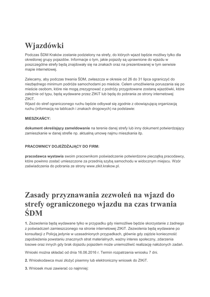 Wjazdówki Podczas ŚDM Kraków zostanie podzielony na strefy, do których wjazd będzie możliwy tylko dla określonej grupy pojazdów. Informacje o tym, jakie pojazdy są uprawnione do wjazdu w poszczególne strefy będą znajdowały się na znakach oraz na prezentowanej w tym serwisie mapie internetowej. Zalecamy, aby podczas trwania ŚDM, zwłaszcza w okresie od 26 do 31 lipca ograniczyć do niezbędnego minimum podróże samochodami po mieście. Celem umożliwienia poruszania się po mieście osobom, które nie mogą zrezygnować z podróży przygotowane zostaną wjazdówki, które zależnie od typu, będą wydawane przez ZIKiT lub będą do pobrania ze strony internetowej ZIKiT. Wjazd do stref ograniczonego ruchu będzie odbywał się zgodnie z obowiązującą organizacją ruchu (informacją na tablicach i znakach drogowych) na podstawie: MIESZKAŃCY: dokument określający zameldowanie na terenie danej strefy lub inny dokument potwierdzający zamieszkanie w danej strefie np. aktualną umowę najmu mieszkania itp. PRACOWNICY DOJEŻDŻAJĄCY DO FIRM: pracodawca wystawia swoim pracownikom poświadczenie potwierdzone pieczątką pracodawcy, które powinno zostać umieszczone za przednią szybą samochodu w widocznym miejscu. Wzór zaświadczenia do pobrania ze strony www.zikit.krakow.pl. Zasady przyznawania zezwoleń na wjazd do strefy ograniczonego wjazdu na czas trwania ŚDM 1. Zezwolenia będą wydawane tylko w przypadku gdy niemożliwe będzie skorzystanie z żadnego z poświadczeń zamieszczonego na stronie internetowej ZIKiT. Zezwolenia będą wydawane po konsultacji z Policją jedynie w uzasadnionych przypadkach, głównie gdy zajdzie konieczność zapobieżenia powstaniu znacznych strat materialnych, ważny interes społeczny, zdarzenia losowe oraz innych gdy brak dojazdu pojazdem może uniemożliwić realizację nałożonych zadań. Wnioski można składać od dnia 16.06.2016 r. Termin rozpatrzenia wniosku 7 dni. 2. Wnioskodawca musi złożyć pisemny lub elektroniczny wniosek do ZIKiT. 3. Wniosek musi zawierać co najmniej: a. Dane wnioskodawcy : imię, nazwisko, telefon kontaktowy, miejsce zameldowania, miejsce zamieszkania (dowód osobisty do wglądu) b. Dane samochodu: typ, model, numer rejestracyjny (dowód rejestracyjny do wglądu) c. Wyczerpujące uzasadnienie wniosku poparte odpowiednimi zaświadczeniami lub dokumentami. 4. W przypadku wniosków składanych przez pełnomocnika zgodnie z art. 1 ust. 1 pkt 2 ustawy z dnia 16 listopada 2006 r. o opłacie skarbowej (Dz. U. Dz.U.2015.783 ze zm.) należy dołączyć potwierdzenie uiszczenia opłaty skarbowej w wysokości 17 zł. Wpłaty opłaty skarbowej od pełnomocnictwa można dokonać w kasie Urzędu Miasta Krakowa - ul. Wielicka 28a (parter) lub dokonując przelewu na konto: PKO Bank Polski S.A. 49 1020 2892 2276 3005 0000 0000. Zwolnione z opłaty skarbowej jest pełnomocnictwo udzielone małżonkowi, wstępnemu, zstępnemu lub rodzeństwu.5. Odbiór zezwolenia następuje w siedzibie ZIKiT na os. Złotej Jesieni 14 po wcześniejszym telefonicznym uzgodnieniu terminu i po okazaniu dowodu tożsamości. Komunikacja Miejska Podczas trwania Światowych Dni Młodzieży komunikacja miejska, rowery i podróże piesze będą podstawową formą przemieszczania się po Krakowie. Aby dostosować funkcjonowanie krakowskiej komunikacji do potrzeb użytkowników zostaną wprowadzone zmiany, które można podzielić na kilka grup: 1) Wyznaczone zostaną dodatkowe buspasy, które ułatwią przemieszczanie się między poszczególnymi strefami, w których ruch samochodów będzie ograniczony. Buspasy pojawią się między innymi na Opolskiej, Nowohuckiej czy Konopnickiej. 2) Pojawią się linie specjalne i zmiany w trasach i częstotliwościach linii stałych. Informacje o zmianach w funkcjonowaniu komunikacji należy szukać na stronie kmkrakow.pl. Zachęcamy też do skorzystania z wyszukiwarki połączeń www.krakow.jakdojade.pl 3) Zwiększona będzie też ilość kursów.