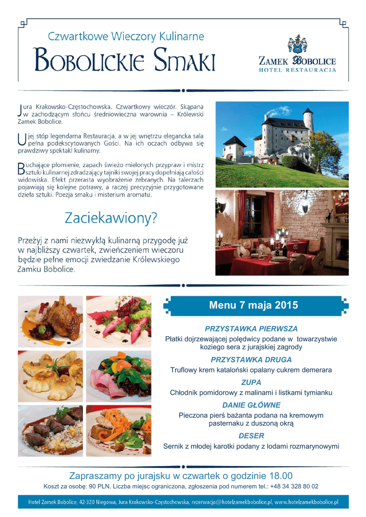 Menu 7 maja 2015 PRZYSTAWKA PIERWSZA Płatki dojrzewającej polędwicy podane w towarzystwie koziego sera z jurajskiej zagrody PRZYSTAWKA DRUGA Truflowy krem kataloński opalany cukrem demerara ZUPA Chłodnik pomidorowy z malinami i listkami tymianku DANIE GŁÓWNE Pieczona pierś bażanta podana na kremowym pasternaku z duszoną okrą DESER Sernik z młodej karotki podany z lodami rozmarynowymi Zapraszamy po jurajsku w czwartek o godzinie 18.00 Koszt za osobę: 90 PLN. Liczba miejsc ograniczona, zgłoszenia pod numerem tel.: +48 34 328 80 02