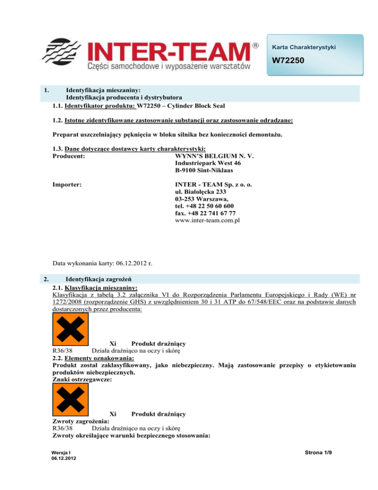 Karta Charakterystyki W72250 1. Identyfikacja mieszaniny: Identyfikacja producenta i dystrybutora 1.1. Identyfikator produktu: W72250 – Cylinder Block Seal 1.2. Istotne zidentyfikowane zastosowanie substancji oraz zastosowanie odradzane: Preparat uszczelniający pęknięcia w bloku silnika bez konieczności demontażu. 1.3. Dane dotyczące dostawcy karty charakterystyki: Producent: WYNN’S BELGIUM N. V. Industriepark West 46 B-9100 Sint-Niklaas Importer: INTER - TEAM Sp. z o. o. ul. Białołęcka 233 03-253 Warszawa, tel. +48 22 50 60 600 fax. +48 22 741 67 77 www.inter-team.com.pl Data wykonania karty: 06.12.2012 r. 2. Identyfikacja zagrożeń 2.1. Klasyfikacja mieszaniny: Klasyfikacja z tabelą 3.2 załącznika VI do Rozporządzenia Parlamentu Europejskiego i Rady (WE) nr 1272/2008 (rozporządzenie GHS) z uwzględnieniem 30 i 31 ATP do 67/548/EEC oraz na podstawie danych dostarczonych przez producenta: Xi Produkt drażniący R36/38 Działa drażniąco na oczy i skórę 2.2. Elementy oznakowania: Produkt został zaklasyfikowany, jako niebezpieczny. Mają zastosowanie przepisy o etykietowaniu produktów niebezpiecznych. Znaki ostrzegawcze: Xi Produkt drażniący Zwroty zagrożenia: R36/38 Działa drażniąco na oczy i skórę Zwroty określające warunki bezpiecznego stosowania: Wersja I 06.12.2012 Strona 1/9 Karta Charakterystyki W72250 S2 S26 S37/39 S46 Chronić przed dziećmi Zanieczyszczone oczy przemyć natychmiast dużą ilością wody i zasięgnąć porady lekarza Nosić odpowiednie rękawice ochronne i okulary lub ochronę twarzy W razie połknięcia niezwłocznie zasięgnij porady lekarza - pokaż opakowanie lub etykietę Inne zagrożenia: Brak 3. Skład/informacja o składnikach 3.1. Substancje: Nie dotyczy. 3.2. Mieszaniny: Klasyfikację substancji zawartych w produkcie podano zgodnie z tabelą 3.1 oraz 3.2 załącznika VI do Rozporządzenia Parlamentu Europejskiego i Rady (WE) nr 1272/2008 (rozporządzenie GHS) z uwzględnieniem 30 i 31 ATP do 67/548/EEC oraz na podstawie danych dostarczonych przez producenta. Nazwa niebezpiecznej substancji Zakres stężeń Numer CAS Numer indeksowy Numer WE 2-aminoetanol; etanoloamina ≤1% 141-43-5 603-030-00-8 205-483-3 Symbole niebezpieczeństwa Xn: R20/21/22 C: R34 GHS05; GHS07 Niebezpieczeństwo SkinCorr1B: H314 AcuteTox4: H302 AcuteTox4: H312 AcuteTox4: H332 Xi: R36/37/38 Fosforan trisodu 1-<2,5 % 10101-89-0 brak Krzemian sodu 20%< ÷ <25% 1344-09-8 Brak 231-509-8 215-687-4 GHS07 Uwaga SkinIrrit2: H315 EyeIrrit2: H319 STOT SE3: H335 Xi: R36/38 GHS07 Uwaga Skin Irrit. 2; H315 Eye Irrit. 2: H319 STOT SE 3: H335 Brzmienie użytych zwrotów – patrz p. 16. 4. Środki pierwszej pomocy 4.1. Opis środków pierwszej pomocy: 4.1.1 Wytyczne dotyczące pierwszej pomocy wg istotnych dróg narażenia: Kartę Charakterystyki okazać lekarzowi udzielającemu pomocy. W przypadku narażenia na pary i aerozole zwrócić się o produktu osobę poszkodowaną przenieść do dobrze wentylowanego pomieszczenia Wersja I 06.12.2012 Strona 2/9 Karta Charakterystyki W72250 pomoc lekarską a) drogi oddechowe: osobę poszkodowaną natychmiast przenieść do dobrze wentylowanego pomieszczenia; osobę poszkodowaną umieścić w pozycji półleżącej, rozluźnić ubranie, upewnić się czy w ustach osoby poszkodowanej nie zalegają przedmioty lub wydzielina utrudniające oddychanie; jeżeli poszkodowany nie oddycha – wykonać sztuczne oddychanie; niezwłocznie zwrócić się o pomoc lekarską. b) skóra: zdjąć zanieczyszczone ubranie; zabrudzoną skórę przemyć dużą ilością wody z mydłem; do mycia skóry nie używać żadnych rozpuszczalników ani rozcieńczalników; niezwłocznie skonsultować z lekarzem, jeżeli wystąpi podrażnienie c) oczy: zanieczyszczone oczy płukać, przy otwartych powiekach, ciągłym strumieniem bieżącej wody przez 10 ÷ 15 minut; unikać silnego strumienia wody, który może stworzyć ryzyko uszkodzenia rogówki; w przypadku utrzymującego się pieczenia lub podrażnienia skonsultować się z lekarzem; nie używać żadnych płynów do przemywania oczu ani żadnych maści przed konsultacją lekarską; w przypadku, gdy osoba poszkodowana nosi szkła kontaktowe zdjąć je, jeżeli to możliwe; niezwłocznie skonsultować z lekarzem, jeżeli wystąpi podrażnienie d) przewód pokarmowy: wypłukać usta dużą ilością bieżącej wody; nie powodować wymiotów; niezwłocznie skonsultować z lekarzem - pokazać lekarzowi Etykietę lub Kartę Charakterystyki 4.1.2. Inne: Brak. 4.2. Najważniejsze ostre i opóźnione objawy oraz skutki narażenia: Objawy ostre: Brak Objawy opóźnione: Brak 4.3. Wskazania dotyczące wszelkiej natychmiastowej pomocy lekarskiej i szczególnego postępowania z poszkodowanym: W przypadku spożycia lub dostania się produktu do oczu należy niezwłocznie skonsultować się z lekarzem. 5. Postępowanie w przypadku pożaru 5.1. Środki gaśnicze: a) Zalecane środki gaśnicze: Rozproszone prądy wodne, gaśnice proszkowe, piana odporna na alkohol. b) Niezalecane środki gaśnicze: Unikać silnych prądów wodnych, które mogą rozprzestrzenić ogień. 5.2. Szczególne zagrożenia związane z substancją: Wydziela toksyczne gazy w warunkach pożaru. 5.3. Informacje dla straży pożarnej: Należy nosić niezależny aparat do oddychania i odpowiednią odzież ochronną. 6. Postępowanie w przypadku niezamierzonego uwolnienia do środowiska 6.1. Indywidualne środki ostrożności, wyposażenie ochronne i procedury w sytuacjach awaryjnych: 6.1.1. Dla osób nienależących do personelu udzielającego pomocy: - podczas usuwania materiału należy używać ubrania ochronnego, rękawic ochronnych, okularów ochronnych oraz maski przeciwpyłowej 6.1.2. Dla osób udzielających pomocy: - podczas usuwania unikać tworzenia się i wdychania par i aerozoli produktu - używać dobrze dopasowanych i przylegających okularów ochronnych, rękawic ochronnych oraz ubrania ochronnego 6.2. Środki ostrożności w zakre