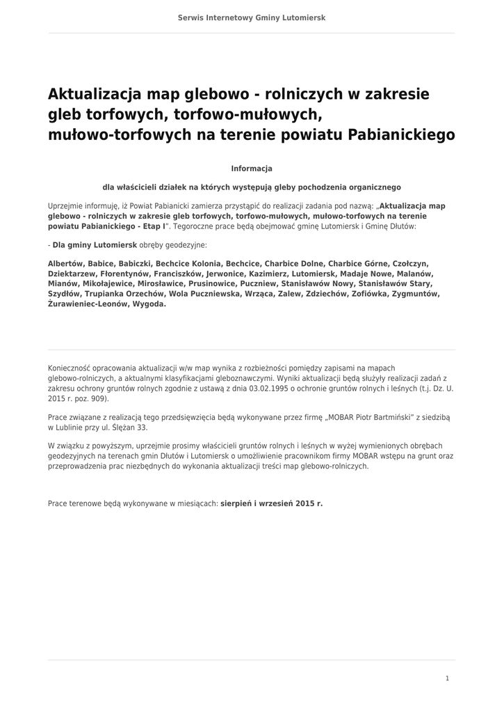 Serwis Internetowy Gminy Lutomiersk Aktualizacja map glebowo - rolniczych w zakresie gleb torfowych, torfowo-mułowych, mułowo-torfowych na terenie powiatu Pabianickiego Informacja dla właścicieli działek na których występują gleby pochodzenia organicznego Uprzejmie informuję, iż Powiat Pabianicki zamierza przystąpić do realizacji zadania pod nazwą: „Aktualizacja map glebowo - rolniczych w zakresie gleb torfowych, torfowo-mułowych, mułowo-torfowych na terenie powiatu Pabianickiego - Etap I”. Tegoroczne prace będą obejmować gminę Lutomiersk i Gminę Dłutów: - Dla gminy Lutomiersk obręby geodezyjne: Albertów, Babice, Babiczki, Bechcice Kolonia, Bechcice, Charbice Dolne, Charbice Górne, Czołczyn, Dziektarzew, Fłorentynów, Franciszków, Jerwonice, Kazimierz, Lutomiersk, Madaje Nowe, Malanów, Mianów, Mikołajewice, Mirosławice, Prusinowice, Puczniew, Stanisławów Nowy, Stanisławów Stary, Szydłów, Trupianka Orzechów, Wola Puczniewska, Wrząca, Zalew, Zdziechów, Zofiówka, Zygmuntów, Żurawieniec-Leonów, Wygoda. Konieczność opracowania aktualizacji w/w map wynika z rozbieżności pomiędzy zapisami na mapach glebowo-rolniczych, a aktualnymi klasyfikacjami gleboznawczymi. Wyniki aktualizacji będą służyły realizacji zadań z zakresu ochrony gruntów rolnych zgodnie z ustawą z dnia 03.02.1995 o ochronie gruntów rolnych i leśnych (t.j. Dz. U. 2015 r. poz. 909). Prace związane z realizacją tego przedsięwzięcia będą wykonywane przez firmę „MOBAR Piotr Bartmiński” z siedzibą w Lublinie przy ul. Ślężan 33. W związku z powyższym, uprzejmie prosimy właścicieli gruntów rolnych i leśnych w wyżej wymienionych obrębach geodezyjnych na terenach gmin Dłutów i Lutomiersk o umożliwienie pracownikom firmy MOBAR wstępu na grunt oraz przeprowadzenia prac niezbędnych do wykonania aktualizacji treści map glebowo-rolniczych. Prace terenowe będą wykonywane w miesiącach: sierpień i wrzesień 2015 r. 1