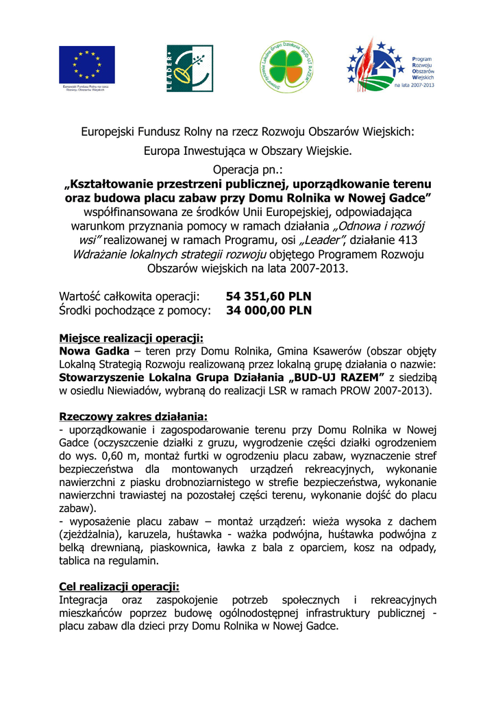 Europejski Fundusz Rolny na rzecz Rozwoju Obszarów Wiejskich: Europa Inwestująca w Obszary Wiejskie. Operacja pn.: „Kształtowanie przestrzeni publicznej, uporządkowanie terenu oraz budowa placu zabaw przy Domu Rolnika w Nowej Gadce” współfinansowana ze środków Unii Europejskiej, odpowiadająca warunkom przyznania pomocy w ramach działania „Odnowa i rozwój wsi” realizowanej w ramach Programu, osi „Leader”, działanie 413 Wdrażanie lokalnych strategii rozwoju objętego Programem Rozwoju Obszarów wiejskich na lata 2007-2013. Wartość całkowita operacji: Środki pochodzące z pomocy: 54 351,60 PLN 34 000,00 PLN Miejsce realizacji operacji: Nowa Gadka – teren przy Domu Rolnika, Gmina Ksawerów (obszar objęty Lokalną Strategią Rozwoju realizowaną przez lokalną grupę działania o nazwie: Stowarzyszenie Lokalna Grupa Działania „BUD-UJ RAZEM” z siedzibą w osiedlu Niewiadów, wybraną do realizacji LSR w ramach PROW 2007-2013). Rzeczowy zakres działania: - uporządkowanie i zagospodarowanie terenu przy Domu Rolnika w Nowej Gadce (oczyszczenie działki z gruzu, wygrodzenie części działki ogrodzeniem do wys. 0,60 m, montaż furtki w ogrodzeniu placu zabaw, wyznaczenie stref bezpieczeństwa dla montowanych urządzeń rekreacyjnych, wykonanie nawierzchni z piasku drobnoziarnistego w strefie bezpieczeństwa, wykonanie nawierzchni trawiastej na pozostałej części terenu, wykonanie dojść do placu zabaw). - wyposażenie placu zabaw – montaż urządzeń: wieża wysoka z dachem (zjeżdżalnia), karuzela, huśtawka - ważka podwójna, huśtawka podwójna z belką drewnianą, piaskownica, ławka z bala z oparciem, kosz na odpady, tablica na regulamin. Cel realizacji operacji: Integracja oraz zaspokojenie potrzeb społecznych i rekreacyjnych mieszkańców poprzez budowę ogólnodostępnej infrastruktury publicznej placu zabaw dla dzieci przy Domu Rolnika w Nowej Gadce.