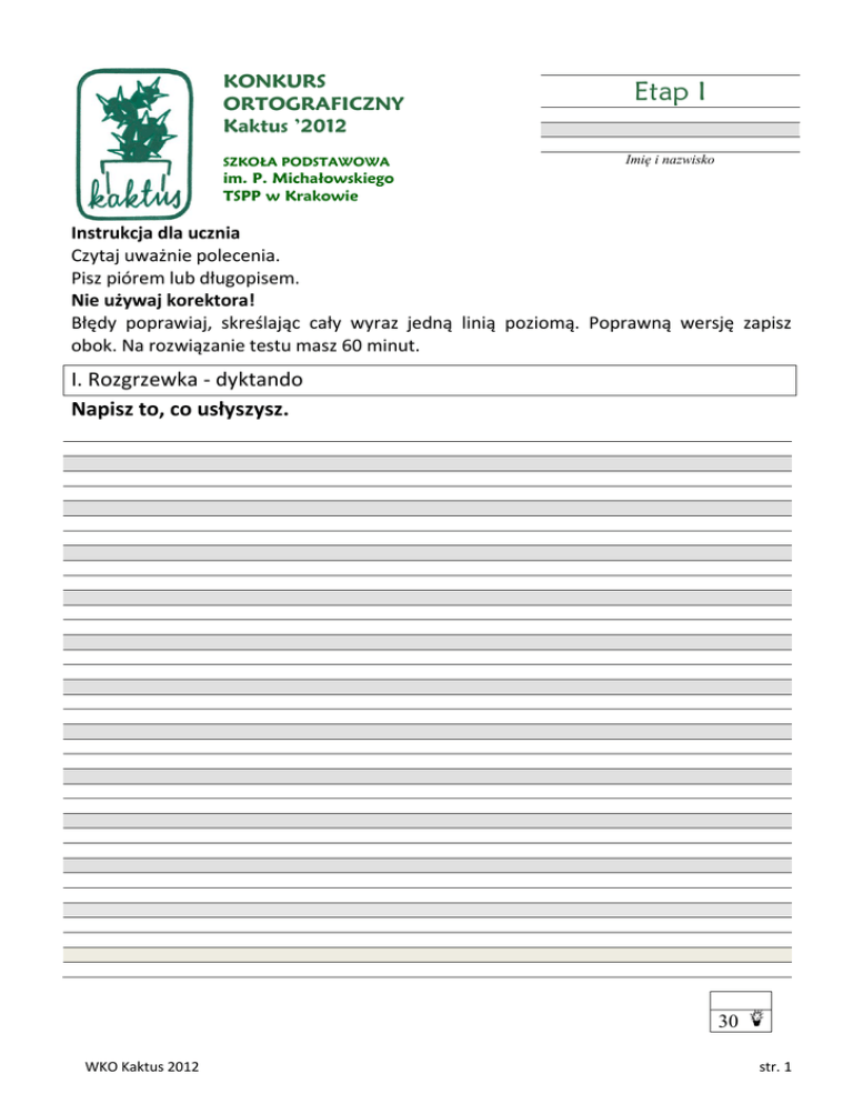 KONKURS ORTOGRAFICZNY Kaktus ’2012 SZKOŁA PODSTAWOWA Etap I Imię i nazwisko im. P. Michałowskiego TSPP w Krakowie Instrukcja dla ucznia Czytaj uważnie polecenia. Pisz piórem lub długopisem. Nie używaj korektora! Błędy poprawiaj, skreślając cały wyraz jedną linią poziomą. Poprawną wersję zapisz obok. Na rozwiązanie testu masz 60 minut. I. Rozgrzewka - dyktando Napisz to, co usłyszysz. 30 WKO Kaktus 2012 str. 1 II. Królestwo kaktusów, czyli wyrazy z u i ó Rozwiąż krzyżówkę 1. 1. W białej szacie, straszy 2. w zamku. 3. 2. Inaczej auto. 4. 5. 3. Mieszkała u nich Królewna Śnieżka. 6. 4. Przechowujemy w niej 7. produkty, które łatwo się psują. 8. 5. Kolega kredek, łatwo 9. go wymazad. 10. 11. 6. Dwunasta w nocy. 12. 13. 7. W kierpcach i z ciupagą. 14. 15. 8. Kwaśna, zielonkawa zupa, zrobiona z kiszonego warzywa. 9. W wesołym miasteczku, kręci się dookoła. 10. Wewnątrz jajka, otoczone białkiem. 11. Zakładasz je na nogi. 12. Może byd długa, z falbanami, balowa. 13. Drobinka chleba, bułki lub ciasteczka. 14. Piękny kwiat z kolcami. 15. Wkręcasz ją do lampy. 15 WKO Kaktus 2012 str. 2 III. Zabawa w „chowanego”, czyli wyrazy z „h” i „ch” Kaktus zasłonił literę „h” lub „ch”. Przepisz obok wyrazy, uzupełniając je. łodna erbata urtownia bla y e o na ali pe owe s ody arakterystyka bo atera 10 IV. Żarty kaktusa, czyli wyrazy z rz i ż W okienka wpisz rz lub ż. Czarny uraw tepoce skydłami w kałuy, a wokół się kuy. Rozma ona mija wygewa się na kywym dewie. 10 Razem: WKO Kaktus 2012 65 str. 3