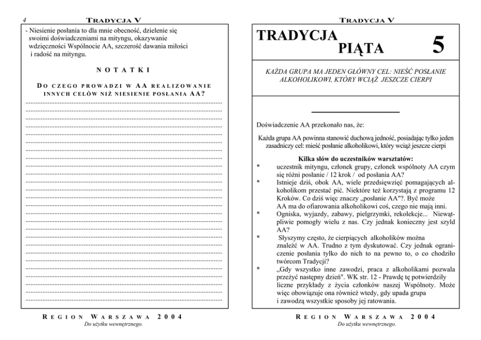 4 TRADYCJA V - Niesienie posłania to dla mnie obecność, dzielenie się swoimi doświadczeniami na mityngu, okazywanie wdzięczności Wspólnocie AA, szczerość dawania miłości i radość na mityngu. TRADYCJA V TRADYCJA PIĄTA N O T A T K I KAŻDA GRUPA MA JEDEN GŁÓWNY CEL: NIEŚĆ POSŁANIE ALKOHOLIKOWI, KTÓRY WCIĄŻ JESZCZE CIERPI DO CZEGO PROWADZI W AA REALIZOWANIE INNYCH CELÓW NIŻ NIESIENIE POSŁANIA AA? ................................................................................................................... ................................................................................................................... ................................................................................................................... ................................................................................................................... ................................................................................................................... ................................................................................................................... ................................................................................................................... ................................................................................................................... ................................................................................................................... ................................................................................................................... ................................................................................................................... ................................................................................................................... ................................................................................................................... ................................................................................................................... ................................................................................................................... ................................................................................................................... ................................................................................................................... ................................................................................................................... ................................................................................................................... ................................................................................................................... ................................................................................................................... ................................................................................................................... ................................................................................................................... ................................................................................................................... ................................................................................................................... ................................................................................................................... R E G I O N W A R S Z A W A Do użytku wewnętrznego. 2 0 0 4 5 ______________ Doświadczenie AA przekonało nas, że: Każda grupa AA powinna stanowić duchową jedność, posiadając tylko jeden zasadniczy cel: mieść posłanie alkoholikowi, który wciąż jeszcze cierpi * * * * * Kilka słów do uczestników warsztatów: uczestnik mityngu, członek grupy, członek wspólnoty AA czym się różni posłanie / 12 krok / od posłania AA? Istnieje dziś, obok AA, wiele przedsięwzięć pomagających alkoholikom przestać pić. Niektóre też korzystają z programu 12 Kroków. Co dziś więc znaczy „posłanie AA"?. Być może AA ma do ofiarowania alkoholikowi coś, czego nie mają inni. Ogniska, wyjazdy, zabawy, pielgrzymki, rekolekcje... Niewątpliwie pomogły wielu z nas. Czy jednak konieczny jest szyld AA? Słyszymy często, że cierpiących alkoholików można znaleźć w AA. Trudno z tym dyskutować. Czy jednak ograniczenie posłania tylko do nich to na pewno to, o co chodziło twórcom Tradycji? „Gdy wszystko inne zawodzi, praca z alkoholikami pozwala przeżyć następny dzień". WK str. 12 - Prawdę tę potwierdziły liczne przykłady z życia członków naszej Wspólnoty. Może więc obowiązuje ona również wtedy, gdy upada grupa i zawodzą wszystkie sposoby jej ratowania. R E G I O N W A R S Z A W A Do użytku wewnętrznego. 2 0 0 4 2 TRADYCJA V KILKA MYŚLI Z NASZEJ LITERATURY ______________ * Tragedią naszego życia jest to, jak głęboko musimy cierpieć, nim nauczymy się prostych prawd, według których należy żyć. "Anonimowi Alkoholicy wkraczają w dojrzałość" str. 331 * Lepiej robić jedną rzecz znakomicie, niż wiele rzeczy kiepsko. Oto istota Piątej Tradycji. Na niej opiera się jedność naszej wspólnoty. Samo istnienie wspólnoty zależy od przestrzegania tej zasady. „12x12” str. 150 * Alkoholicy z łatwością przekazują sobie wzajemnie doświadczenia związane z chorobą i zdrowieniem. Jest to dar Boży dla nas, a przekazywanie go innym, nam podobnym, jest tym właśnie celem, który ożywia Anonimowych Alkoholików na całym świecie. „12x12” str. 151 * Istnieje jeszcze jeden powód, dla którego AA ma tylko jeden cel. Wspaniały paradoks AA polega na tym, iż zdajemy sobie sprawę, że nie zdołamy utrzymać na dłużej cennego daru trzeźwości, jeżeli nie będziemy przekazywać go dalej. str. 150 * Dlatego też nasza społeczność będzie rozsądnie trwała przy jej jedynym celu: niesieniu posłania alkoholikowi, który wciąż jeszcze cierpi. Dajmy odpór dumnemu z