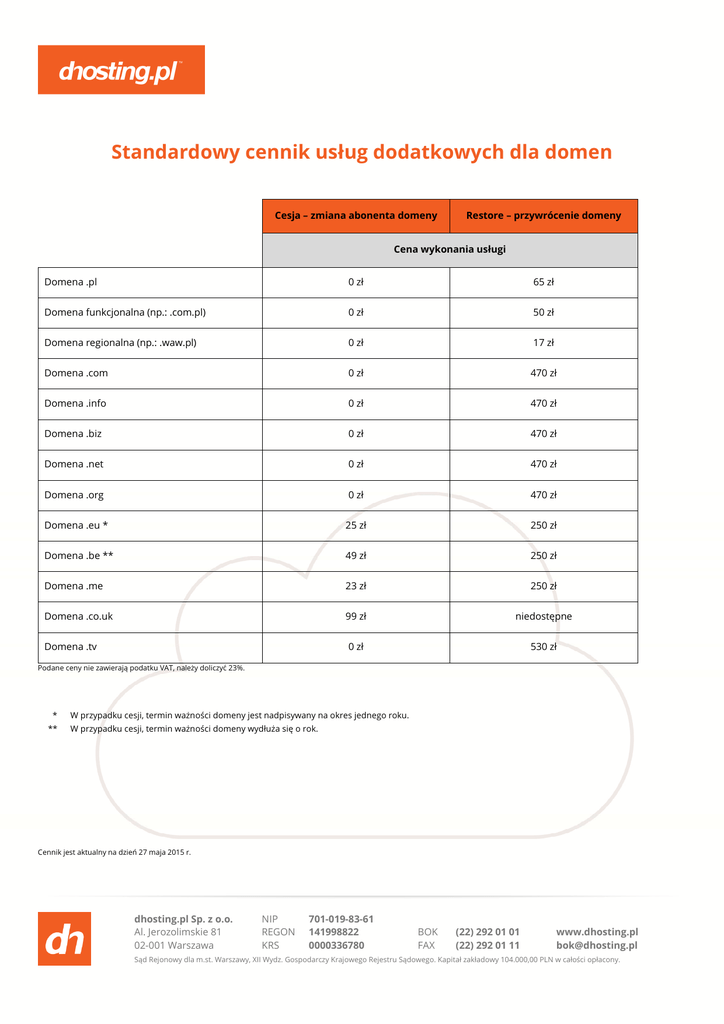 Standardowy cennik usług dodatkowych dla domen Cesja – zmiana abonenta domeny Restore – przywrócenie domeny Cena wykonania usługi Domena .pl 0 zł 65 zł Domena funkcjonalna (np.: .com.pl) 0 zł 50 zł Domena regionalna (np.: .waw.pl) 0 zł 17 zł Domena .com 0 zł 470 zł Domena .info 0 zł 470 zł Domena .biz 0 zł 470 zł Domena .net 0 zł 470 zł Domena .org 0 zł 470 zł Domena .eu * 25 zł 250 zł Domena .be ** 49 zł 250 zł Domena .me 23 zł 250 zł Domena .co.uk 99 zł niedostępne Domena .tv 0 zł 530 zł Podane ceny nie zawierają podatku VAT, należy doliczyć 23%. * ** W przypadku cesji, termin ważności domeny jest nadpisywany na okres jednego roku. W przypadku cesji, termin ważności domeny wydłuża się o rok. Cennik jest aktualny na dzień 27 maja 2015 r. dhosting.pl Sp. z o.o. Al. Jerozolimskie 81 02-001 Warszawa NIP REGON KRS 701-019-83-61 141998822 0000336780 BOK FAX (22) 292 01 01 (22) 292 01 11 www.dhosting.pl [email protected] Sąd Rejonowy dla m.st. Warszawy, XII Wydz. Gospodarczy Krajowego Rejestru Sądowego. Kapitał zakładowy 104.000,00 PLN w całości opłacony.