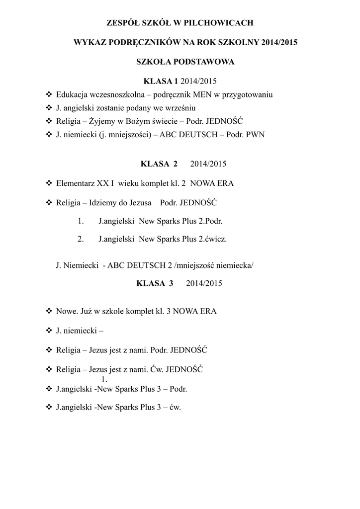 ZESPÓŁ SZKÓŁ W PILCHOWICACH WYKAZ PODRĘCZNIKÓW NA ROK SZKOLNY 2014/2015 SZKOŁA PODSTAWOWA KLASA 1 2014/2015 Edukacja wczesnoszkolna – podręcznik MEN w przygotowaniu J. angielski zostanie podany we wrześniu Religia – Żyjemy w Bożym świecie – Podr. JEDNOŚĆ J. niemiecki (j. mniejszości) – ABC DEUTSCH – Podr. PWN KLASA 2 2014/2015 Elementarz XX I wieku komplet kl. 2 NOWA ERA Religia – Idziemy do Jezusa Podr. JEDNOŚĆ 1. J.angielski New Sparks Plus 2.Podr. 2. J.angielski New Sparks Plus 2.ćwicz. J. Niemiecki - ABC DEUTSCH 2 /mniejszość niemiecka/ KLASA 3 2014/2015 Nowe. Już w szkole komplet kl. 3 NOWA ERA J. niemiecki – Religia – Jezus jest z nami. Podr. JEDNOŚĆ Religia – Jezus jest z nami. Ćw. JEDNOŚĆ 1. J.angielski -New Sparks Plus 3 – Podr. J.angielski -New Sparks Plus 3 – ćw. WYKAZ PODRĘCZNIKÓW DO SZKOŁY PODSTWOWEJ W PILCHOWICACH KLASA 4 2014/2015 J. polski –Słowa na start podr.. Kszt. Liter. – kult. N. ERA J. polski – Słowa na start. podr.Kszt. język.. Cz.1, Cz.2N. E. Matematyka – Podr. GWO Matematyka – Ćw. 1, 2, 3 GWO Przyroda – Na tropach przyrody Podr. NOWA ERA Przyroda – Na tropach przyrody Ćw. NOWA ERA Historia – Wczoraj i dziś. Podr. NOWA ERA Historia – Wczoraj i dziś.Ćwicz. NOWA ERA Historia - Atlas NOWA ERA J. niemiecki – WIR NEU 1. Podr. LEKTOR KLETT J. niemiecki – WIR NEU 1. Ćw. LEKTOR KLETT J.Angielski-LOOK 1 Podr. J.Angielski-LOOK 1 ćwicz Plastyka – Lubię tworzyć .Podr. MAC / Plastyka - Lubię tworzyć . Ćwicz. MAC Muzyka –Muzyczny świat.Podr. MAC Muzyka – Muzyczny świat ćwiczenia MAC Religia –Miejce pełne BOGActw . Podr. JEDNOŚĆ Religia – Miejce pełne BOGActw . Ćw. JEDNOŚĆ Technika – Technika 4-6 część komunikacyjna. OPERON. WYKAZ PODRĘCZNIKÓW DO SZKOŁY PODSTWOWEJ W PILCHOWCACH KLASA 5 2014/2015 J. polski – Kształcenie liter. – kult. Podr. Słowa na start.N. Era J. polski – Kształcenie językowe. Ćw.1,2 Słowa na start.N. Era Matematyka – Podr. GWO Matematyka – Ćw. 1, 2, 3 GWO Przyroda – Na tropach przyrody. Podr. N. Era Przyroda – Na tropach przyrody. Ćw. 1,2 N. Era Historia – Wczoraj i dziś. Podr NOWA ERA Historia – Wczoraj i dziś. Ćw. NOWA ERA J. Angielski- LOOK 2 . Podr. J. Angielski- LOOK 2 Ćwicz. Muzyka – Muzyczny świat. Podr. MAC Muzyka -Muzyczny świat . Ćwicz. MAC Plastyka – Lubię tworzyć . Podr. MAC Technika . Odkrywamy na nowo cz. II OPERON J. Niemiecki- kontynuacja Spotkania uBOGA cające Podr. JEDNOŚĆ Spotkania uBOGA cające Podr. JEDNOŚĆ WYKAZ PODRĘCZNIKÓW DO SZKOŁY PODSTWOWEJ W PILCHOWCACH KLASA 6 2014/2015 J. polski – Kształcenie liter. – kult. Podr. Słowa na start.N. Era /nowość/ J. polski – Kształcenie językowe. Ćw.1,2 Słowa na start.N. Era /nowość/ Matematyka – Podr. GWO /nowość/ Matematyka – Ćw. 1, 2, 3 GWO/nowośc/ Przyroda – Na tropach przyrody. Podr. N. Era /nowość/ Przyroda – Na tropach przyrody. Ćw.1,2 N. Era /nowość/ Historia – Wczoraj i dziś. Podr NOWA ERA /nowość/ J. niemiecki – WIR NEU 3. Podr. LEKTOR KLETT/nowość/ J. niemiecki – WIR NEU 3. Ćw. LEKTOR KLETTnowość/ J. angielski – kontynuacja z kl. V Muzyka – Muzyczny świat Podr. MAC/nowość/ Muzyka -Muzyczny świat .ćwicz. MAC/nowość/ Plastyka – Lubię tworzyć Podr. MAC/nowość/ Religia /JEDNOŚĆ, /stary podr./