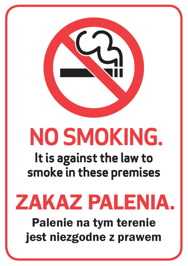 NO SMOKING. It is against the law to smoke in these premises ZAKAZ PALENIA. Palenie na tym terenie jest niezgodne z prawem
