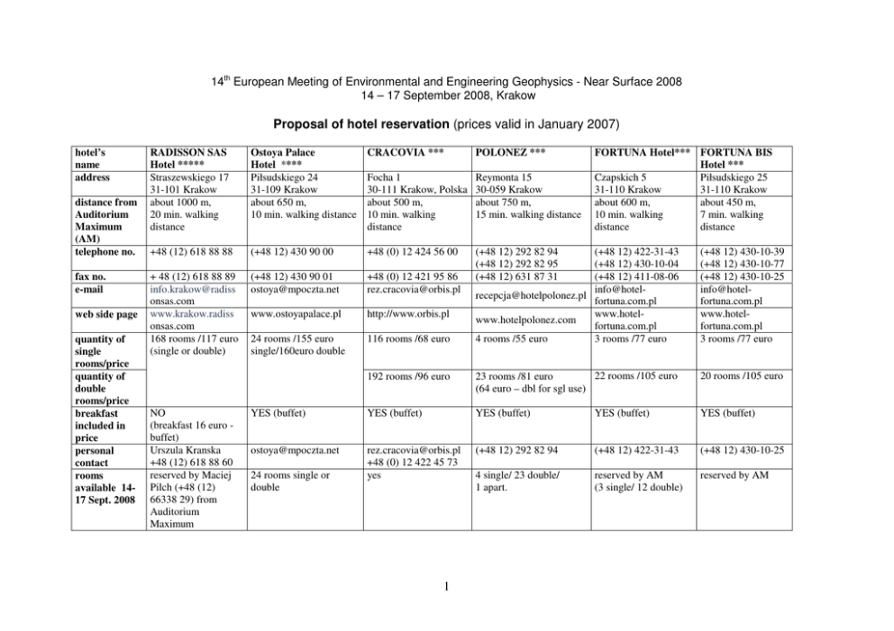 14th European Meeting of Environmental and Engineering Geophysics - Near Surface 2008 14 – 17 September 2008, Krakow Proposal of hotel reservation (prices valid in January 2007) hotel’s name address distance from Auditorium Maximum (AM) telephone no. fax no. e-mail web side page quantity of single rooms/price quantity of double rooms/price breakfast included in price personal contact rooms available 1417 Sept. 2008 RADISSON SAS Hotel ***** Straszewskiego 17 31-101 Krakow about 1000 m, 20 min. walking distance Ostoya Palace Hotel **** Piłsudskiego 24 31-109 Krakow about 650 m, 10 min. walking distance +48 (12) 618 88 88 + 48 (12) 618 88 89 info.krakow@radiss onsas.com www.krakow.radiss onsas.com 168 rooms /117 euro (single or double) NO (breakfast 16 euro buffet) Urszula Kranska +48 (12) 618 88 60 reserved by Maciej Pilch (+48 (12) 66338 29) from Auditorium Maximum CRACOVIA *** POLONEZ *** Focha 1 30-111 Krakow, Polska about 500 m, 10 min. walking distance Reymonta 15 30-059 Krakow about 750 m, 15 min. walking distance (+48 12) 430 90 00 +48 (0) 12 424 56 00 (+48 12) 430 90 01 [email protected] +48 (0) 12 421 95 86 [email protected] (+48 12) 292 82 94 (+48 12) 292 82 95 (+48 12) 631 87 31 www.ostoyapalace.pl http://www.orbis.pl 24 rooms /155 euro single/160euro double 116 rooms /68 euro (+48 12) 422-31-43 (+48 12) 430-10-04 (+48 12) 411-08-06 info@[email protected] fortuna.com.pl www.hotelwww.hotelpolonez.com fortuna.com.pl 4 rooms /55 euro 3 rooms /77 euro (+48 12) 430-10-39 (+48 12) 430-10-77 (+48 12) 430-10-25 [email protected] www.hotelfortuna.com.pl 3 rooms /77 euro 192 rooms /96 euro 22 rooms /105 euro 23 rooms /81 euro (64 euro – dbl for sgl use) 20 rooms /105 euro YES (buffet) YES (buffet) YES (buffet) YES (buffet) YES (buffet) [email protected] [email protected] +48 (0) 12 422 45 73 yes (+48 12) 292 82 94 (+48 12) 422-31-43 (+48 12) 430-10-25 4 single/ 23 double/ 1 apart. reserved by AM (3 single/ 12 double) reserved by AM 24 rooms single or double 1 FORTUNA Hotel*** FORTUNA BIS Hotel *** Czapskich 5 Piłsudskiego 25 31-110 Krakow 31-110 Krakow about 600 m, about 450 m, 10 min. walking 7 min. walking distance distance hotel’s name address distance from Auditorium Maximum telephone no. fax no. e-mail LOGOS *** ALEXANDER *** Szujskiego 5 31-123 Krakow about 450 m, 6 min. walking distance (+48 12) 632 33 33 (+48 12) 631 62 00 (+48 12) 632 42 10 Garbarska 18 31-131 Krakow about 850 m, 15 min. walking distance (+48 12) 422-96-60 Dom AGH SIENKIEWICZOWKA** Piłsudskiego 16 31-110 Krakow about 550 m, 10 min. walking distance +48 (012) 617 38 21 (+48 12) 422-97-61 [email protected] +48 (012) 422 06 76 - Student’s Hotel "ALFA" Reymonta 17 30-059 Krakow about 800 m, 15 min. walking distance +48 (012) 617 34 71 +48 (012) 617 35 00 +48 (012) 637 24 16 [email protected] Student’s Hotel NAWOJKA Reymonta 11 Krakow about 650 m, 12 min. walking distance Student’s Hotel ZACZEK 3 Maja 5 30-063 Krakow about 500 m, 10 min. walking distance +48 (12) 633-39-36 +48 (12) 622-11-02 +48 (12) 633-55-48 [email protected] w.pl http://nawojka.bratniak.k rakow.pl 5 rooms / 23 euro +48 (12) 632-87-35 [email protected] web side page www.hotel-logos.pl alexhotel.pl - quantity of single rooms/price quantity of double rooms/price breakfast included in price personal contact 9 rooms /68 euro 25 rooms/80 euro single/100 euro double 10/34-44 euro http://www.miasteczko. agh.edu.pl 370 rooms /15 euro 7/59-67 euro 330 rooms /21-24 euro 10 rooms/ 28 euro 39 rooms/ 36 euro YES (continental breakfast) NO (possible in rest. in adjacent building or catering) Marta Staniszewska marta.staniszewska@ agh.edu.pl +48 (012) 617 34 71 +48 (012) 637 43 25 yes NO (breakfast: 1,54-3,08 euro) +48 (12) 633-58-77, 63352-05 (Mon.-Fri. 8.0016.00) NO (breakfast: 2,06-3,08 euro) reserved by AM yes rooms available 1417 Sept. 2008 36 rooms /95 euro YES (buffet) YES (buffet) Joanna Wojdan [email protected] (+48 12) 631 62 04 rezerwacja@alexhote Halina Pawelska, l.pl Marian Pawelski (+48 12) 422-96-60 +48 (012) 617 38 21 +48 (012) 422 06 76 20 double rooms reserved by AM (25 rooms single or double) yes 2 http://www.zaczek.bratniak. krakow.pl 4 rooms / 22 euro +48 (12) 622-13-00 +48 (12) 633-19-14 (Mon.Fri 8.00-16.00)