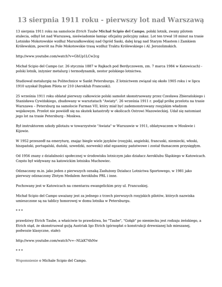 13 sierpnia 1911 roku - pierwszy lot nad Warszawą 13 sierpnia 1911 roku na samolocie Etrich Taube Michał Scipio del Campo, polski lotnik, zwany pilotem stulecia, odbył lot nad Warszawą, nieświadomie łamiąc oficjalny policyjny zakaz. Lot ten trwał 18 minut na trasie Lotnisko Mokotowskie wzdłuż Marszałkowskiej nad Ogród Saski, dalej krąg nad Starym Miastem i Zamkiem Królewskim, powrót na Pole Mokotowskie trasą wzdłuż Traktu Królewskiego i Al. Jerozolimskich. http://www.youtube.com/watch?v=GhUp1LCw2cg Michał Scipio del Campo (ur. 26 stycznia 1887 w Rajkach pod Berdyczowem, zm. 7 marca 1984 w Katowicach) polski lotnik, inżynier metalurg i termodynamik, nestor polskiego lotnictwa. Studiował metalurgię na Politechnice w Sankt Petersburgu. Z lotnictwem związał się około 1905 roku i w lipcu 1910 uzyskał Dyplom Pilota nr 210 (Aeroklub Francuski). 25 września 1911 roku oblatał pierwszy całkowicie polski samolot skonstruowany przez Czesława Zbierańskiego i Stanisława Cywińskiego, zbudowany w warsztatach "Awiaty". 26 września 1911 r. podjął próbę przelotu na trasie Warszawa – Petersburg na samolocie Farman VII, który miał być zademonstrowany rosyjskim władzom wojskowym. Przelot nie powiódł się na skutek katastrofy w okolicach Ostrowi Mazowieckiej. Udał się natomiast jego lot na trasie Petersburg - Moskwa. Był instruktorem szkoły pilotażu w towarzystwie "Awiata" w Warszawie w 1911, oblatywaczem w Moskwie i Kijowie. W 1952 przeszedł na emeryturę, znając biegle wiele języków (rosyjski, angielski, francuski, niemiecki, włoski, hiszpański, portugalski, duński, szwedzki, norweski) zdał egzaminy państwowe i został tłumaczem przysięgłym. Od 1956 znany z działalności społecznej w środowisku lotniczym jako działacz Aeroklubu Śląskiego w Katowicach. Często był widywany na katowickim lotnisku Muchowiec. Odznaczony m.in. jako jeden z pierwszych oznaką Zasłużony Działacz Lotnictwa Sportowego, w 1981 jako pierwszy odznaczony Złotym Medalem Aeroklubu PRL i inne. Pochowany jest w Katowicach na cmentarzu ewangelickim przy ul. Francuskiej. Michał Scipio del Campo uważany jest za jednego z trzech pierwszych rosyjskich pilotów, których nazwiska umieszczone są na tablicy honorowej w domu lotnika w Petersburgu. *** prawdziwy Etrich Taube, a właściwie to prawdziwa, bo "Taube", "Gołąb" po niemiecku jest rodzaju żeńskiego, a Etrich stąd, że skonstruował go/ją Austriak Igo Etrich (górnopłat o konstrukcji drewnianej lub mieszanej, podwozie klasyczne, stałe): http://www.youtube.com/watch?v=--NLkK74hNw *** Wspomnienie o Michale Scipio del Campo.
