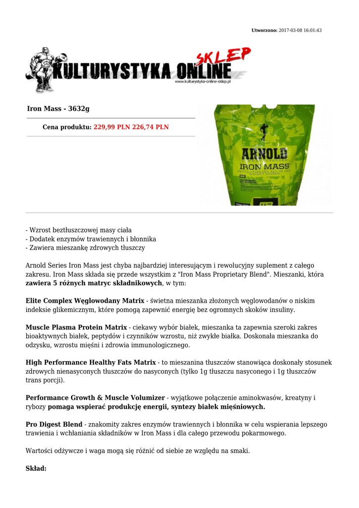 Utworzono: 2017-03-08 16:01:43 Iron Mass - 3632g Cena produktu: 229,99 PLN 226,74 PLN - Wzrost beztłuszczowej masy ciała - Dodatek enzymów trawiennych i błonnika - Zawiera mieszankę zdrowych tłuszczy Arnold Series Iron Mass jest chyba najbardziej interesującym i rewolucyjny suplement z całego zakresu. Iron Mass składa się przede wszystkim z "Iron Mass Proprietary Blend". Mieszanki, która zawiera 5 różnych matryc składnikowych, w tym: Elite Complex Węglowodany Matrix - świetna mieszanka złożonych węglowodanów o niskim indeksie glikemicznym, które pomogą zapewnić energię bez ogromnych skoków insuliny. Muscle Plasma Protein Matrix - ciekawy wybór białek, mieszanka ta zapewnia szeroki zakres bioaktywnych białek, peptydów i czynników wzrostu, niż zwykłe białka. Doskonała mieszanka do odzysku, wzrostu mięśni i zdrowia immunologicznego. High Performance Healthy Fats Matrix - to mieszanina tłuszczów stanowiąca doskonały stosunek zdrowych nienasyconych tłuszczów do nasyconych (tylko 1g tłuszczu nasyconego i 1g tłuszczów trans porcji). Performance Growth & Muscle Volumizer - wyjątkowe połączenie aminokwasów, kreatyny i rybozy pomaga wspierać produkcję energii, syntezy białek mięśniowych. Pro Digest Blend - znakomity zakres enzymów trawiennych i błonnika w celu wspierania lepszego trawienia i wchłaniania składników w Iron Mass i dla całego przewodu pokarmowego. Wartości odżywcze i waga mogą się różnić od siebie ze względu na smaki. Skład: Porcja: 95 g Porcji w opakowaniu: 38 Opakowanie: 3632 g Wartość odżywcza w 1 porcji Calories 485 Calories From Fat 190 Total Fat 21 g Saturated Fat 1g Trans Fat 1g Cholesterol 2 mg Sodium 240 mg Potassium 550 mg Total Carbohydrate 34 g - Sugars 4g Dietary Fiber 1g Protein 40 g Iron Mass Propriatery Blend : 71500 mg Elite Complex Carbohydrates Matrix : Sweet Potato Powder, Barley Starch. Muscle Plasma Protein Matrix : Hydrolyzed Beef Protein, Lactoferrin. High Perfomance Healthy Fats Matrix : Sunflower Oil powder, Whipped Cream Powder, MCT Powder (Medium-Chain Triglycerides from Coconut). Perfomance Growth & Muscle Volumizer : Creatine Monohydrate, L-Glycine, BCAA Nitrates (Leucine, Isoleucine, Valine) (3.1.2 Patent Pending Ratio), D-Ribose. Pro-Digest Blend : Protease, Lactase, Amylase, Lipase, Inulin, Fructooligosaccharides (FOS). Dawkowanie: Wymieszać jedną porcję (2 miarki = 95g) Iron Massa z 200-250ml w zimnej wody. Spożywać od 1 do 3 razy dziennie. Adres: http://www.ko.sklep.pl/ Telefon: kom. 782 010 880 Email: [email protected]