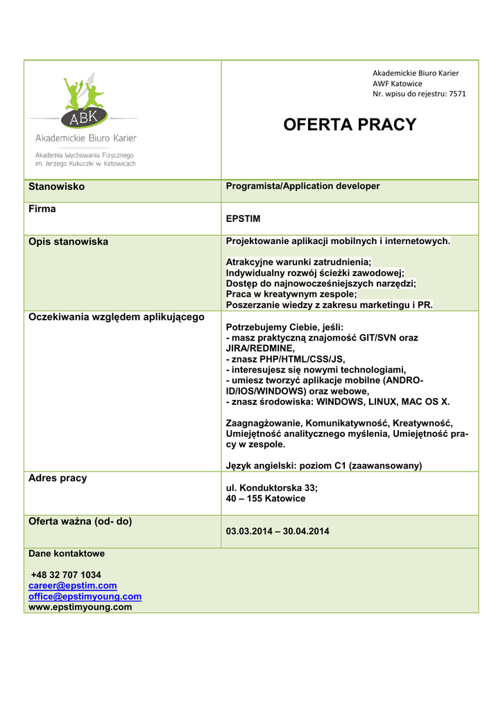 Akademickie Biuro Karier AWF Katowice Nr. wpisu do rejestru: 7571 OFERTA PRACY Stanowisko Programista/Application developer Firma EPSTIM Opis stanowiska Projektowanie aplikacji mobilnych i internetowych. Atrakcyjne warunki zatrudnienia; Indywidualny rozwój ścieżki zawodowej; Dostęp do najnowocześniejszych narzędzi; Praca w kreatywnym zespole; Poszerzanie wiedzy z zakresu marketingu i PR. Oczekiwania względem aplikującego Potrzebujemy Ciebie, jeśli: - masz praktyczną znajomość GIT/SVN oraz JIRA/REDMINE, - znasz PHP/HTML/CSS/JS, - interesujesz się nowymi technologiami, - umiesz tworzyć aplikacje mobilne (ANDROID/IOS/WINDOWS) oraz webowe, - znasz środowiska: WINDOWS, LINUX, MAC OS X. Zaagnagżowanie, Komunikatywność, Kreatywność, Umiejętność analitycznego myślenia, Umiejętność pracy w zespole. Język angielski: poziom C1 (zaawansowany) Adres pracy ul. Konduktorska 33; 40 – 155 Katowice Oferta ważna (od- do) Dane kontaktowe +48 32 707 1034 [email protected] [email protected] www.epstimyoung.com 03.03.2014 – 30.04.2014