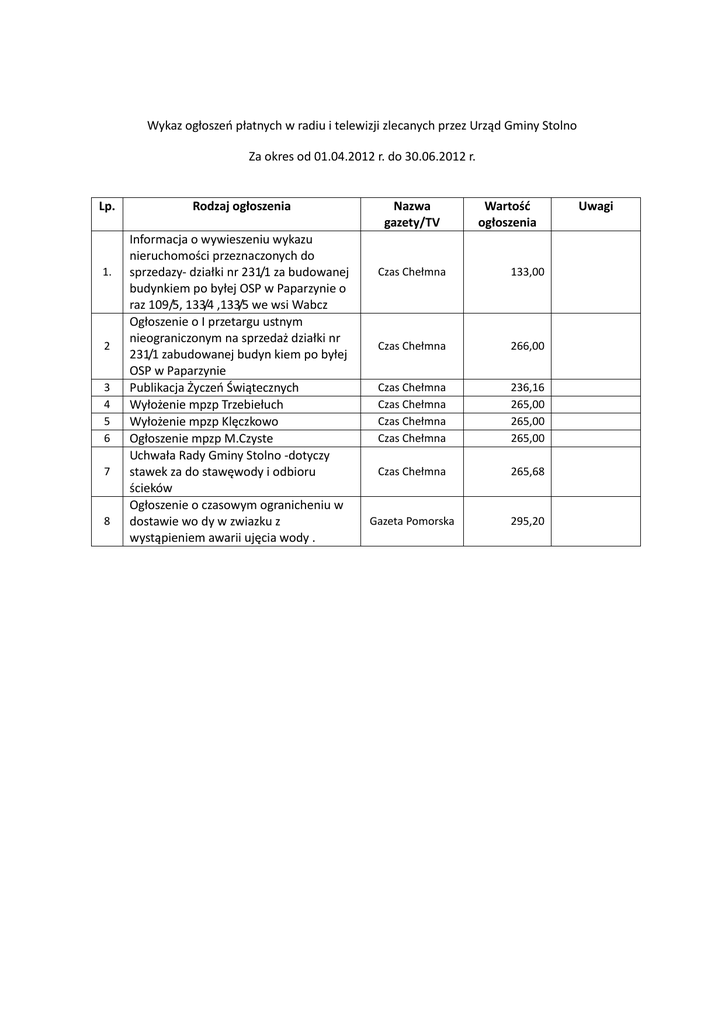 Wykaz ogłoszeń płatnych w radiu i telewizji zlecanych przez Urząd Gminy Stolno Za okres od 01.04.2012 r. do 30.06.2012 r. Lp. 1. 2 3 4 5 6 7 8 Rodzaj ogłoszenia Informacja o wywieszeniu wykazu nieruchomości przeznaczonych do sprzedazy- działki nr 231/1 za budowanej budynkiem po byłej OSP w Paparzynie o raz 109/5, 133/4 ,133/5 we wsi Wabcz Ogłoszenie o I przetargu ustnym nieograniczonym na sprzedaż działki nr 231/1 zabudowanej budyn kiem po byłej OSP w Paparzynie Publikacja Życzeń Świątecznych Wyłożenie mpzp Trzebiełuch Wyłożenie mpzp Klęczkowo Ogłoszenie mpzp M.Czyste Uchwała Rady Gminy Stolno -dotyczy stawek za do stawęwody i odbioru ścieków Ogłoszenie o czasowym ogranicheniu w dostawie wo dy w zwiazku z wystąpieniem awarii ujęcia wody . Nazwa gazety/TV Wartość ogłoszenia Czas Chełmna 133,00 Czas Chełmna 266,00 Czas Chełmna Czas Chełmna Czas Chełmna Czas Chełmna 236,16 265,00 265,00 265,00 Czas Chełmna 265,68 Gazeta Pomorska 295,20 Uwagi