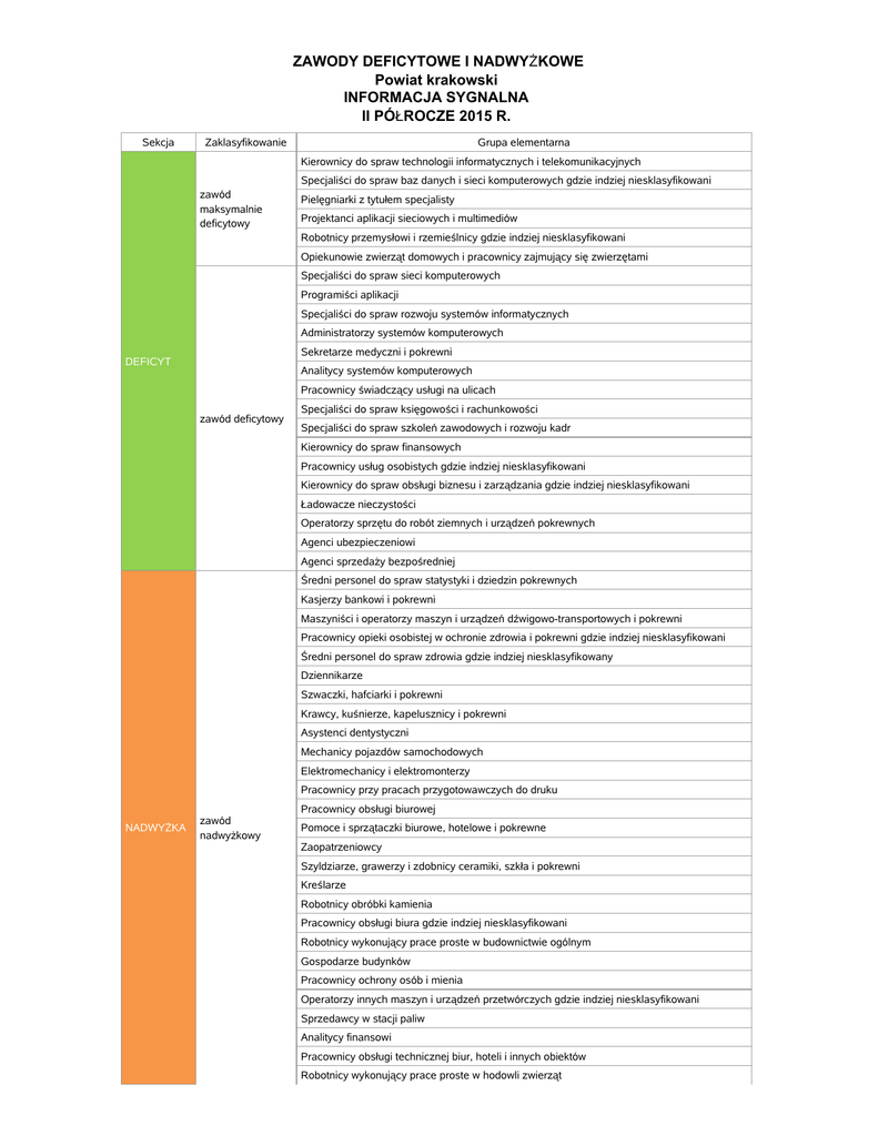 ZAWODY DEFICYTOWE I NADWYŻKOWE Powiat krakowski INFORMACJA SYGNALNA II PÓŁROCZE 2015 R. Sekcja Zaklasyfikowanie Grupa elementarna Kierownicy do spraw technologii informatycznych i telekomunikacyjnych zawód maksymalnie deficytowy Specjaliści do spraw baz danych i sieci komputerowych gdzie indziej niesklasyfikowani Pielęgniarki z tytułem specjalisty Projektanci aplikacji sieciowych i multimediów Robotnicy przemysłowi i rzemieślnicy gdzie indziej niesklasyfikowani Opiekunowie zwierząt domowych i pracownicy zajmujący się zwierzętami Specjaliści do spraw sieci komputerowych Programiści aplikacji Specjaliści do spraw rozwoju systemów informatycznych Administratorzy systemów komputerowych Sekretarze medyczni i pokrewni DEFICYT Analitycy systemów komputerowych Pracownicy świadczący usługi na ulicach zawód deficytowy Specjaliści do spraw księgowości i rachunkowości Specjaliści do spraw szkoleń zawodowych i rozwoju kadr Kierownicy do spraw finansowych Pracownicy usług osobistych gdzie indziej niesklasyfikowani Kierownicy do spraw obsługi biznesu i zarządzania gdzie indziej niesklasyfikowani Ładowacze nieczystości Operatorzy sprzętu do robót ziemnych i urządzeń pokrewnych Agenci ubezpieczeniowi Agenci sprzedaży bezpośredniej Średni personel do spraw statystyki i dziedzin pokrewnych Kasjerzy bankowi i pokrewni Maszyniści i operatorzy maszyn i urządzeń dźwigowo-transportowych i pokrewni Pracownicy opieki osobistej w ochronie zdrowia i pokrewni gdzie indziej niesklasyfikowani Średni personel do spraw zdrowia gdzie indziej niesklasyfikowany Dziennikarze Szwaczki, hafciarki i pokrewni Krawcy, kuśnierze, kapelusznicy i pokrewni Asystenci dentystyczni Mechanicy pojazdów samochodowych Elektromechanicy i elektromonterzy Pracownicy przy pracach przygotowawczych do druku NADWYŻKA zawód nadwyżkowy Pracownicy obsługi biurowej Pomoce i sprzątaczki biurowe, hotelowe i pokrewne Zaopatrzeniowcy Szyldziarze, grawerzy i zdobnicy ceramiki, szkła i pokrewni Kreślarze Robotnicy obróbki kamienia Pracownicy obsługi biura gdzie indziej niesklasyfikowani Robotnicy wykonujący prace proste w budownictwie ogólnym Gospodarze budynków Pracownicy ochrony osób i mienia Operatorzy innych maszyn i urządzeń przetwórczych gdzie indziej niesklasyfikowani Sprzedawcy w stacji paliw Analitycy finansowi Pracownicy obsługi technicznej biur, hoteli i innych obiektów Robotnicy wykonujący prace proste w hodowli zwierząt Sekcja Zaklasyfikowanie zawód nadwyżkowy Grupa elementarna Sprzedawcy na targowiskach i bazarach Filozofowie, historycy i politolodzy Kaletnicy, rymarze i pokrewni Maszyniści kotłów parowych i pokrewni Operatorzy maszyn do produkcji obuwia i pokrewni Biolodzy i pokrewni NADWYŻKA zawód maksymalnie nadwyżkowy Rolnicy upraw polowych Jubilerzy, złotnicy i pokrewni Inżynierowie górnictwa i metalurgii Planiści produkcyjni Technicy górnictwa, metalurgii i pokrewni Technicy technologii chemicznej i pokrewni Konduktorzy i pokrewni Kierownicy w instytucjach finansowych i ubezpieczeniowych Takielarze i monterzy konstrukcji linowych *Monitoring zawodów deficytowych i nadwyżkowych został wykonany według nowej metodologii przygotowanej w ramach projektu współfinansowanego ze środków UE w ramach EFS „Opracowanie nowych zaleceń metodycznych prowadzenia monitoringu zawodów deficytowych i nadwyżkowych na lokalnym rynku pracy".
