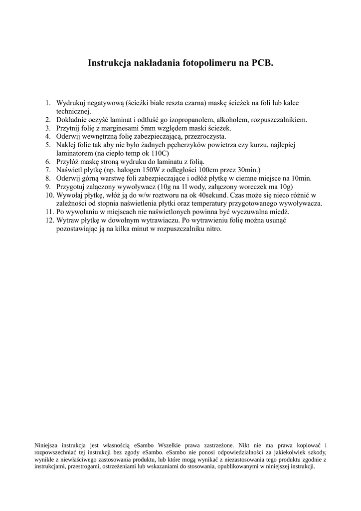 Instrukcja nakładania fotopolimeru na PCB. 1. Wydrukuj negatywową (ścieżki białe reszta czarna) maskę ścieżek na foli lub kalce technicznej. 2. Dokładnie oczyść laminat i odtłuść go izopropanolem, alkoholem, rozpuszczalnikiem. 3. Przytnij folię z marginesami 5mm względem maski ścieżek. 4. Oderwij wewnętrzną folię zabezpieczającą, przezroczysta. 5. Naklej folie tak aby nie było żadnych pęcherzyków powietrza czy kurzu, najlepiej laminatorem (na ciepło temp ok 110C) 6. Przyłóż maskę stroną wydruku do laminatu z folią. 7. Naświetl płytkę (np. halogen 150W z odległości 100cm przez 30min.) 8. Oderwij górną warstwę foli zabezpieczające i odłóż płytkę w ciemne miejsce na 10min. 9. Przygotuj załączony wywoływacz (10g na 1l wody, załączony woreczek ma 10g) 10. Wywołaj płytkę, włóż ją do w/w roztworu na ok 40sekund. Czas może się nieco różnić w zależności od stopnia naświetlenia płytki oraz temperatury przygotowanego wywoływacza. 11. Po wywołaniu w miejscach nie naświetlonych powinna być wyczuwalna miedź. 12. Wytraw płytkę w dowolnym wytrawiaczu. Po wytrawieniu folię można usunąć pozostawiając ją na kilka minut w rozpuszczalniku nitro. Niniejsza instrukcja jest własnością eSambo Wszelkie prawa zastrzeżone. Nikt nie ma prawa kopiować i rozpowszechniać tej instrukcji bez zgody eSambo. eSambo nie ponosi odpowiedzialności za jakiekolwiek szkody, wynikłe z niewłaściwego zastosowania produktu, lub które mogą wynikać z niezastosowania tego produktu zgodnie z instrukcjami, przestrogami, ostrzeżeniami lub wskazaniami do stosowania, opublikowanymi w niniejszej instrukcji.