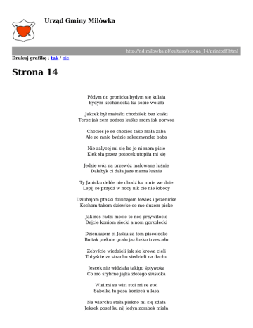 Urząd Gminy Milówka http://nd.milowka.pl/kultura/strona_14/printpdf.html Drukuj grafikę : tak / nie Strona 14 Pódym do gronicka bydym się kulała Bydym kochanecka ku sobie wołała Jakzek był maluśki chodziłek bez kuśki Teroz jak zem podros kuśke mom jak porwoz Chocios jo se chocios tako mała zaba Ale ze mnie bydzie sakramyncko baba Nie zalycoj mi się bo jo ni mom pisie Kiek sła przez potocek utopiła mi się Jedzie wóz na przewóz malowane luśnie Dałabyk ci dała jaze mama łuśnie Ty Janicku deble nie chodź ku mnie we dnie Lepij se przydź w nocy nik cie nie łobocy Dziubajom ptaski dziubajom łowies i pszenicke Kochom takom dziewke co mo duzom picke Jak nos radzi mocie to nos przywitocie Dejcie koniom siecki a nom gorzołecki Dzienkujem ci Jaśku za tom piscołecke Bo tak pieknie grało jaz łozko trzescało Zebyście wiedzieli jak się krowa cieli Tobyście ze strachu siedzieli na dachu Jescek nie widziała takigo śpiywoka Co mo srybrne jajka złotego siusioka Wisi mi se wisi stoi mi se stoi Sabelka łu pasa konicek u lasa Na wierchu stała piekno mi się zdała Jekzek poseł ku nij jedyn zombek miała Kiebyk jo był ksiyndzem to byk śluby dawoł Które ładne dziywce sobie byk zostawioł Kiedy jo był mały nie kciała mi broda róś A teroz mi na starość cała dupa kce łobroś Gorzołecko ciotko miołek cie nie pijać Alek se pomyśloł na co bydym zbierać Piła jo se piła słodkom gorzołecke Dejze mi chłopoku chocioz kwaterecke Biedo moja biedo jakbyś dupe miała To byk ci nakopoł jaz by ci scarniała Puści pod pierzyne przytuli do siebie Wtedy bydzies myśloł ześ jes w siódmym niebie Z tego palca na tyn palec dej mi cipki dom ci jajec Cicho cicho cichusieńko leko leko lekusieńko Miała baba konia i chłopa łysonia I krowe krasule i córke pierdule Pijem jo se pijem jescek nie pijany Cy gorzołka płono cy kielusek mały Dupcy stary dupcy siuśka mu się kurcy Przystawił se stolek dupcy jak parobek Jako tez to dobro gorzołecka z miodem Pijali jom chłopcy za nasym łogrodem Gorzołecka ci ci wlazła mi do rzici A z rzici do głowy waryjot gotowy Ni ma tez to ni ma jako chłopu z gronia Zjedzie se na dupie nie trzeba mu konia Lecioł pies przez łowies suka przez krzoki I wypina dupe na taki śpiywoki Popłaces Jasinku nie jednom godzine Pokiel cie Hanusia puści pod pierzyne