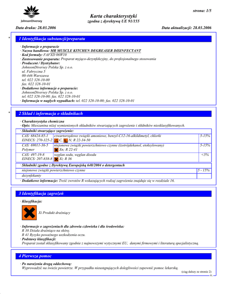 DR strona: 1/5 Karta charakterystyki zgodna z dyrektywą UE 91/155 Data druku: 28.03.2006 * Data aktualizacji: 28.03.2006 1 Identyfikacja substancji/preparatu · Informacje o preparacie · Nazwa handlowa: MR MUSCLE KITCHEN DEGREASER DISINFECTANT · Kod formuły: FAFXD 06W10 · Zastosowanie preparatu: Preparat myjąco-dezynfekcyjny, do profesjonalnego stosowania · Producent / Dystrybutor: JohnsonDiversey Polska Sp. z o.o. ul. Fabryczna 5 00-446 Warszawa tel. 022 328-10-00 fax. 022 328-10-01 · Dodatkowe informacje o preparacie: JohnsonDiversey Polska Sp. z o.o. tel. 022 328-10-00; fax. 022 328-10-01 · Informacja w nagłych wypadkach: tel. 022 328-10-00; fax. 022 328-10-01 * 2 Skład i informacja o składnikach · Charakterystyka chemiczna · Opis: Mieszanina niŜej wymienionych składników stwarzających zagroŜenie i skłdników niesklasyfikowanych. · Składniki stwarzające zagroŜenie: CAS: 68424-85-1 czwartorzędowe związki amoniowe, benzyl-C12-16-alkildimetyl, chlorki EINECS: 270-325-2 C, N; R 22-34-50 CAS: 69011-36-5 niejonowe związki powierzchniowo czynne (izotrójdekanol, etoksylowany) Polymer Xn; R 22-41 CAS: 497-19-8 węglan sodu, węglan disodu EINECS: 207-838-8 Xi; R 36 · Składniki zgodne z Dyrektywą Europejską 648/2004 o detergentach niejonowe związki powierzchniowo czynne dezynfekanty · Dodatkowe informacje: Treść zwrotów R wskazujących rodzaj zagroŜenia znajduje się w rozdziale 16. 5-15% 5-15% <5% 5 - 15% 3 Identyfikacja zagroŜeń · Klasyfikacja: Xi Produkt draŜniący · Informacje o zagroŜeniach dla zdrowia człowieka i dla środowiska: R 38 Działa draŜniąco na skórę. R 41 Ryzyko powaŜnego uszkodzenia oczu. · Podstawy klasyfikacji: Preparat został sklasyfikowany zgodnie z najnowszymi wytycznymi EU, danymi firmowymi i literaturą specjalistyczną. 4 Pierwsza pomoc · Po naraŜeniu drogą oddechową: Wyprowadzić na świeŜe powietrze. W przypadku nieustępujących dolegliwości zapewnić pomoc lekarską. (ciąg dalszy ze stronie 2) PL DR strona: 2/5 Karta charakterystyki zgodna z dyrektywą UE 91/155 Data druku: 28.03.2006 Data aktualizacji: 28.03.2006 Nazwa handlowa: MR MUSCLE KITCHEN DEGREASER DISINFECTANT (ciąg dalszy od strony 1) · Po zanieczyszczeniu skóry: Natychmiast zmyć wodą. W przypadku nieustępujących dolegliwości zapewnić pomoc lekarską. · Po zanieczyszczeniu oczu: Płukać oczy z otwartą powieką przez kilka minut pod bieŜącą wodą i zapewnić pomoc lekarską. · Po naraŜeniu drogą pokarmową: Wypłukać usta wodą, pić duŜe ilości wody. W przypadku nieustępujących dolegliwości zasięgnąć porady lekarskiej. 5 Postępowanie w przypadku poŜaru · Odpowiednie środki gaśnicze: CO2, proszek gaśniczy lub woda. Większy poŜar gasić strumieniem wody lub pianą odporną na działanie alkoholu. · Środki ochrony: śadne specjalne środki nie są konieczne. 6 Postępowanie w przypadku niezamierzonego uwolnienia do środowiska · Środki ostroŜności dotyczące bezpieczeństwa osób: Nie są wymagane. · Środki dotyczące ochrony środowiska: Zapobiec przenikaniu do ścieków, wód powierzchniowych i wód gruntowych. · Zbieranie / usuwanie: Zebrać za pomocą materiału wiąŜącego ciecze (piasek, ziemia okrzemkowa, materiał wiąŜący uniwersalny, trociny). Materiał zebrany usunąć zgodnie z obowiązującymi przepisami. 7 Postępowanie z substancją / preparatem i jej / jego magazynowanie · Postępowanie · Informacje dotyczące bezpiecznego postępowania: Podczas pracy z preparatem przestrzegać ogólnie przyjętych zasad BHP obowiązujących przy pracy z chemikaliami. · Informacje dotyczące bezpieczeństwa poŜarowego i wybuchowego: śadne szczególne środki ostroŜności nie są wymagane. · Magazynowanie · Wymagania dotyczące pomieszczeń magazynowych i opakowań: Magazynować tylko w oryginalnych opakowaniach. Zgodnie z lokalnym prawem. · Informacje dotyczące wspólnego magazynowania: Zgodnie z lokalnym prawem. · Dodatkowe informacje dotyczące warunków magazynowania: Brak. 8 Kontrola naraŜenia i środki ochrony indywidualnej · Dodatkowe informacje dla wykonania urządzeń technicznych: Brak dodatkowych informacji, patrz pkt. 7. · Wymagające kontroli w miejscu pracy składniki szkodliwe dla zdrowia i ich dopuszczalne stęŜenia: Preparat nie zawiera składników szkodliwych dla zdrowia, wymagających kontroli ich stęŜenia w miejscu pracy. · Dodatkowe informacje: Podstawę stanowią aktualnie obowiązujące wykazy. · Środki ochrony indywidualnej · Ogólne zasady ochrony indywidualnej: Trzymać z dala od produktów spoŜywczych, napojów i pasz. OdzieŜ zanieczyszczoną preparatem natychmiast zdjąć Myć ręce przed przerwą i po pracy z preparatem. Unikać kontaktu z oczami i skórą. · Ochrona układu oddechowego: Nie jest wymagana przy normalnym uŜyciu. (ciąg dalszy ze stronie 3) PL DR strona: 3/5 Karta charakterystyki zgodna z dyrektywą UE 91/155 Data druku: 28.03.2006 Data aktualizacji: 28.03.2006 Nazwa handlowa: MR MUSCLE KITCHEN DEGREASER DISINFECTANT (ciąg dalszy od strony 2) · Ochrona rąk: Rękawice ochronne Materiał, z którego wykonane są rękawice musi być nieprzepuszczalny i odporny na działanie preparatu. · Materiał, z którego powinny być wykonane rękawice: Guma nitrylowa, NBR · Czas przenikania dla materiału, z którego wykonane są rękawice: Od producenta rękawic naleŜy uzyskać dokładną informację o czasie przenikania i go przestrzegać. · Ochrona oczu: Ściśle przylegające okulary ochronne * 9 Właściwości fizykochemiczne · Informacje ogólne Stan fizyczny: Kolor: Zapach: Ciecz Przeźroczysty Charakterystyczny · Zmiana warunków: Temperatura topnienia / Zakres topnienia: Nie jest określona. Nie jest określona. Temperatura wrzenia / Zakres wrzenia: Nie stosuje się. · Temperatura zapłonu: Nie ulega samozapłonowi. · Temperatura samozapłonu: Preparat nie jest wybuchowy. · Niebezpieczeństwo wybuchu: 1,050 g/cm3 · Gęstość w 