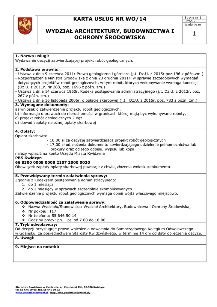 KARTA USŁUG NR WO/14 WYDZIAŁ ARCHITEKTURY, BUDOWNICTWA I OCHRONY ŚRODOWISKA Strona nr 1 Stron 2 Wydanie nr 1 1. Nazwa usługi: Wydawanie decyzji zatwierdzającej projekt robót geologicznych. 2. Podstawa prawna: - Ustawa z dnia 9 czerwca 2011r.Prawo geologiczne i górnicze (j.t. Dz.U. z 2015r.poz.196 z późn.zm.) - Rozporządzenie Ministra Środowiska z dnia 20 grudnia 2011r. w sprawie szczegółowych wymagań dotyczących projektów robót geologicznych, w tym robót, których wykonywanie wymaga koncesji (Dz.U. z 2011r. Nr 288, poz. 1696 z późn. zm.) - Ustawa z dnia 14 czerwca 1960r. Kodeks postępowania administracyjnego (j.t. Dz.U. z 2013r. poz. 267 z późn. zm.) - Ustawa z dnia 16 listopada 2006r. o opłacie skarbowej (j.t. Dz.U. z 2015r. poz. 783 z późn. zm.) 3. Wymagane dokumenty: a) wniosek o zatwierdzenie projektu robót geologicznych, b) informacja o prawach do nieruchomości w granicach której mają być wykonywane roboty, c) projekt robót geologicznych 2 egz. d) dowód zapłaty należnej opłaty skarbowej 4. Opłaty: Opłata skarbowa: - 10,00 zł za decyzję zatwierdzającą projekt robót geologicznych - 17,00 zł od złożenia dokumentu stwierdzającego udzielenie pełnomocnictwa lub prokury oraz od jego odpisu, wypisu lub kopii należy wpłacić na konto Urzędu Miasta Kwidzyna PBS Kwidzyn 66 8300 0009 0008 2107 2000 0020 Obowiązek zapłaty opłaty skarbowej powstaje z chwilą złożenia wniosku/dokumentu. 5. Przewidywany termin załatwienia sprawy: Zgodnie z Kodeksem postępowania administracyjnego: 1. do 1 miesiąca 2. do 2 miesięcy w sprawach szczególnie skomplikowanych. Zatwierdzenie projektu robót geologicznych wymaga opinii wójta właściwego miejscowo. 6. Odpowiedzialność za załatwienie sprawy: Nazwa Wydziału/Stanowiska: Wydział Architektury, Budownictwa i Ochrony Środowiska, Nr pokoju: 117 Nr telefonu: 55 646 50 14 Godziny pracy: pn. - pt. od 7.00 do 16.00 7. Tryb odwoławczy: Od decyzji przysługuje prawo wniesienia odwołania do Samorządowego Kolegium Odwoławczego w Gdańsku, za pośrednictwem Starosty Kwidzyńskiego, w terminie 14 dni od daty doręczenia decyzji. 8. Uwagi: 9. Miejsce na notatki: Starostwo Powiatowe w Kwidzynie, ul. Kościuszki 29b, 82-500 Kwidzyn, tel. 55 646 50 00, fax. 55 646 50 02 www.powiatkwidzynski.pl ; http://bip.powiatkwidzynski.pl/ Strona nr 2 Stron 2 Wydanie nr KARTA USŁUG NR WO/14 WYDZIAŁ ARCHITEKTURY, BUDOWNICTWA I OCHRONY ŚRODOWISKA 1 Imię i nazwisko Podpis 1) Autor Dorota Kerner ................................. 2) Zatwierdził: Andrzej Wróblewicz ................................. Nr wydania 1. Przyczyna wydania Pierwsze wydanie Data 06.11.2015r. UWAGA: Oryginał karty usługi znajduje się na stanowisku ds. promocji i kontaktów z mediami. Zabrania się kopiowania dokumentu bez konsultacji z pracownikiem ww. stanowiska. Starostwo Powiatowe w Kwidzynie, ul. Kościuszki 29b, 82-500 Kwidzyn, tel. 55 646 50 00, fax. 55 646 50 02 www.powiatkwidzynski.pl ; http://bip.powiatkwidzynski.pl/
