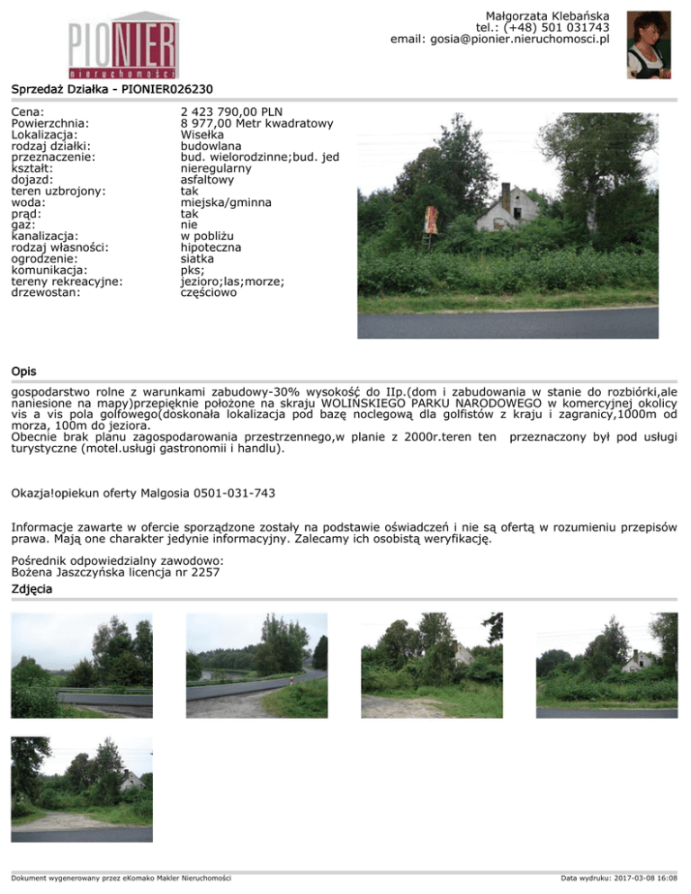 Małgorzata Klebańska tel.: (+48) 501 031743 email: [email protected] Sprzedaż Działka - PIONIER026230 Cena: Powierzchnia: Lokalizacja: rodzaj działki: przeznaczenie: kształt: dojazd: teren uzbrojony: woda: prąd: gaz: kanalizacja: rodzaj własności: ogrodzenie: komunikacja: tereny rekreacyjne: drzewostan: 2 423 790,00 PLN 8 977,00 Metr kwadratowy Wisełka budowlana bud. wielorodzinne;bud. jednorodzinne; nieregularny asfaltowy tak miejska/gminna tak nie w pobliżu hipoteczna siatka pks; jezioro;las;morze; częściowo Opis gospodarstwo rolne z warunkami zabudowy-30% wysokość do IIp.(dom i zabudowania w stanie do rozbiórki,ale naniesione na mapy)przepięknie położone na skraju WOLIŃSKIEGO PARKU NARODOWEGO w komercyjnej okolicy vis a vis pola golfowego(doskonała lokalizacja pod bazę noclegową dla golfistów z kraju i zagranicy,1000m od morza, 100m do jeziora. Obecnie brak planu zagospodarowania przestrzennego,w planie z 2000r.teren ten przeznaczony był pod usługi turystyczne (motel.usługi gastronomii i handlu). Okazja!opiekun oferty Malgosia 0501-031-743 Informacje zawarte w ofercie sporządzone zostały na podstawie oświadczeń i nie są ofertą w rozumieniu przepisów prawa. Mają one charakter jedynie informacyjny. Zalecamy ich osobistą weryfikację. Pośrednik odpowiedzialny zawodowo: Bożena Jaszczyńska licencja nr 2257 Zdjęcia Dokument wygenerowany przez eKomako Makler Nieruchomości Data wydruku: 2017-03-08 16:08