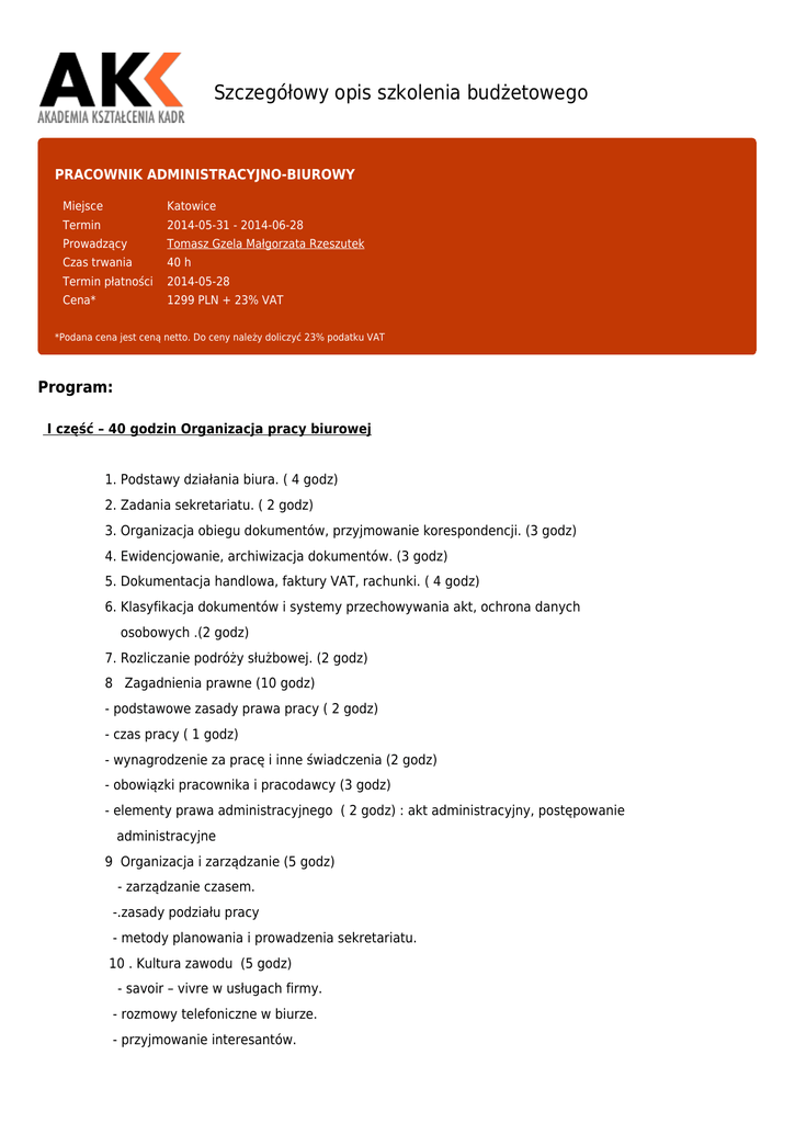 Szczegółowy opis szkolenia budżetowego PRACOWNIK ADMINISTRACYJNO-BIUROWY Miejsce Katowice Termin 2014-05-31 - 2014-06-28 Prowadzący Tomasz Gzela Małgorzata Rzeszutek Czas trwania 40 h Termin płatności 2014-05-28 Cena* 1299 PLN + 23% VAT *Podana cena jest ceną netto. Do ceny należy doliczyć 23% podatku VAT Program: I część – 40 godzin Organizacja pracy biurowej 1. Podstawy działania biura. ( 4 godz) 2. Zadania sekretariatu. ( 2 godz) 3. Organizacja obiegu dokumentów, przyjmowanie korespondencji. (3 godz) 4. Ewidencjowanie, archiwizacja dokumentów. (3 godz) 5. Dokumentacja handlowa, faktury VAT, rachunki. ( 4 godz) 6. Klasyfikacja dokumentów i systemy przechowywania akt, ochrona danych osobowych .(2 godz) 7. Rozliczanie podróży służbowej. (2 godz) 8 Zagadnienia prawne (10 godz) - podstawowe zasady prawa pracy ( 2 godz) - czas pracy ( 1 godz) - wynagrodzenie za pracę i inne świadczenia (2 godz) - obowiązki pracownika i pracodawcy (3 godz) - elementy prawa administracyjnego ( 2 godz) : akt administracyjny, postępowanie administracyjne 9 Organizacja i zarządzanie (5 godz) - zarządzanie czasem. -.zasady podziału pracy - metody planowania i prowadzenia sekretariatu. 10 . Kultura zawodu (5 godz) - savoir – vivre w usługach firmy. - rozmowy telefoniczne w biurze. - przyjmowanie interesantów. Dla kogo: osoby, które chcą zdobywać nowe kwalifikacje lub podwyższać już posiadane z zakresu administracji i organizacji pracy biura Cel: zdobycie podstawowej wiedzy z zakresu: zasad funkcjonowania biura i organizacji pracy biurowej, praktycznych umiejętności samodzielnego prowadzenia biura. Celem kształcenia będzie zapoznanie z organizacją pracy biura, przepływem informacji w zarządzaniu biurem, zasadami efektywnej komunikacji, kultury zawodu, zagadnieniami prawnymi i prawem pracy, oraz zapoznanie z obsługą urządzeń biurowych, kasy fiskalnej jak również z modułem praktycznej obsługi komputera (MS Office) Korzyści: podstawowa korzyscią z udziału w kursie jest kompleksowe , praktyczne przygotowanie do pracy biurowej. Wykładowca: Tomasz Gzela Małgorzata Rzeszutek Tomasz Gzela Prawnik, absolwent studiów podyplomowych w zakresie finansów i rachunkowości podatkowej. Były Kierownik oddziału w izbie skarbowej specjalizujący się w problematyce spraw karnych skarbowych, prania pieniędzy, nieujawnionych źródeł dochodu, prawa dewizowego i kontroli podatkowej. Do jego zadań należał nadzór nad podległymi urzędami skarbowymi w zakresie prawidłowości rozstrzygnięć w pierwszej instancji w zakresie podatków bezpośrednich i spraw karnych; zwalczanie przestępczości podatkowej, zjawiska prania brudnych pieniędzy; nielegalnego obrotu dewizowego. Otrzymał nagrodę Ogólnopolskiego Stowarzyszenia Pracowników Urzędów i Izb Skarbowych w Warszawie. Wykładowca szkół wyższych publicznych i niepublicznych, promotor i recenzent prac dyplomowych, członek komisji egzaminacyjnych /szkoły, konkursy na stanowiska, cywilna służba przygotowawcza/. Prelegent na szkoleniach organizowanych przez korporacje prawnicze w ramach których prowadził cykl wykładów i szkoleń m.in. dla prokuratorów, radców prawnych, sędziów, doradców podatkowych, członków zarządów i rad nadzorczych, księgowych, pracowników administracji rządowej i samorządowej. Autor licznych publikacji na łamach prasy fachowej. Małgorzata Rzeszutek Doradca podatkowy, absolwentka Uniwersytetu Ekonomicznego we Wrocławiu, właściciel kancelarii podatkowej, audytor podatkowy. Specjalizuje się w zakresie prawa podatkowego oraz w dziedzinach pokrewnych. Ekspert w zakresie podatku VAT, CIT i PIT. Wieloletnia praktyka w spółkach audytorskich oraz prowadzenie audytów w jednostkach sektora publicznego i prywatnego pozwoliły naszemu ekspertowi na uzyskanie rozległej i rzetelnej wiedzy w zakresie szeroko rozumianego prawa podatkowego zarówno w jego aspektach teoretycznych jak i przede wszystkim praktycznych. Trener z wieloletnim doświadczeniem szkoleniowym, który gwarantuje przystępne przekazanie wiedzy, a ponadto proponuje niestandardowe rozwiązania problemów, z którymi spotykają się pracownicy działów finansowo-księgowych. Szczegóły organizacyjne: Koszt uczestnictwa: • jednej osoby 1299 plus 23% VAT, razem 1597.77 • VAT- zw. –obowiązuje jednostki budżetowe składające oświadczenie o rodzaju środków finansowych. • kolejnych osób - prosimy o kontakt Uwaga: Promocje i rabaty nie łączą się. Uwaga: Możecie Państwo zwracać się z wnioskiem o dofinansowanie szkolenia z Krajowego Funduszu Szkoleniowego, Cena obejmuje: • -uczestnictwo w szkoleniu • -serwis kawowy,obiad • -materiały szkoleniowe • -certyfikat ukończenia Płatności: • Prosimy realizować na konto 40 1320 1537 1869 7872 2000 0001 po otrzymaniu faktury. Miejsce szkolenia: • Szkolenie jest realizowane w centrum konferencyjnym zlokalizowanym w centrum miasta, • Nazwa i adres zostanie Państwu przekazana w zaproszeniu. Zaproszenie zawiera: • -temat szkolenia • -miejsce • -godziny realizacji Informacje: • Tel. 601-955-320 • Fax. (46)8332636 • e-mail. [email protected]; www.akkonline.pl