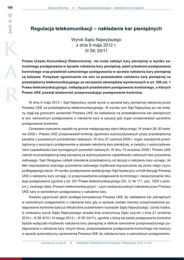106 Bożena Marciniak Regulacja telekomunikacyjna – nakładanie kar pieniężnych Bożena Marciniak Regulacja telekomunikacji – nakładanie kar pieniężnych Wyrok Sądu Najwyższego z dnia 9 maja 2012 r. III SK 35/11 Prezes Urzędu Komunikacji Elektronicznej nie może nałożyć kary pieniężnej w wyniku samoistnego postępowania w sprawie nałożenia kary pieniężnej, jeżeli przedmiot postępowania kontrolnego oraz przedmiot samoistnego postępowania w sprawie nałożenia kary pieniężnej są tożsame. Powyższe ograniczenie nie stoi na przeszkodzie nałożeniu kary pieniężnej na przedsiębiorcę telekomunikacyjnego za naruszenia obowiązków wymienionych w art. 209 ust. 1 Prawa telekomunikacyjnego, niebędących przedmiotem postępowania kontrolnego, o których Prezes UKE powziął wiadomość przeprowadzając postępowanie kontrolne. W dniu 9 maja 2012 r. Sąd Najwyższy wydał wyrok w sprawie kary pieniężnej nałożonej przez Prezesa UKE na przedsiębiorcę telekomunikacyjnego. W wyroku tym Sąd Najwyższy po raz kolejny zajął się granicami uprawnień Prezesa UKE do nakładania na przedsiębiorców kar pieniężnych w tzw. samoistnym postępowaniu o nałożenie kary w sytuacji gdy organ przeprowadził uprzednio postępowanie kontrolne. Omawiane orzeczenie zapadło na gruncie następującego stanu faktycznego. W dniach 28–30 kwietnia 2008 r. Prezes UKE przeprowadził kontrolę zgodności wykorzystywanych przez przedsiębiorcę kanałów z posiadanym pozwoleniem radiowym. W dniu 27 czerwca 2008 r. organ zawiadomił przedsiębiorcę o wszczęciu postępowania w sprawie nałożenia kary pieniężnej, w związku z wykorzystywaniem częstotliwości bez wymaganych pozwoleń radiowych. W dniu 15 września 2008 r. Prezes UKE nałożył na przedsiębiorcę karę pieniężną za wykorzystywanie częstotliwości radiowych bez pozwolenia radiowego. Sąd Okręgowy oddalił odwołanie przedsiębiorcy od decyzji o nałożeniu kary uznając, że fakt nieposiadania ważnego pozwolenia radiowego implikował dopuszczenie się przez niego czynu podlegającego karze. W wyniku postępowania apelacyjnego Sąd Apelacyjny uchylił decyzję Prezesa UKE o nałożeniu kary uznając, iż przeprowadzenie postępowania kontrolnego i niewyczerpanie toku tego postępowania zgodnie z art. 201 Prawa telekomunikacyjnego (Dz. U. Nr 171, poz. 1800 z późn. zm.), zwanego dalej „Prawem telekomunikacyjnym”, czyni niedopuszczalnym nałożenie przez Prezesa UKE kary w samoistnym postępowaniu o nałożenie kary. Kwestia ograniczeń jakim podlega kompetencja Prezesa UKE do nakładania kar pieniężnych w samoistnym postępowaniu o nałożenie kary gdy w sprawie zostało również przeprowadzone postępowanie kontrolne była już kilkukrotnie przedmiotem rozważań Sądu Najwyższego. Uznać trzeba, iż omawiany wyrok Sądu Najwyższego utrwala linię orzeczniczą Sądu (wyroki z dnia 21 września 2010 r., III SK 8/10 i 14 lutego 2012 r., III SK 24/11), zgodnie z którą nie każde postępowanie kontrolne będzie wyłączało możliwość nałożenia kary pieniężnej w efekcie samoistnie przeprowadzonego postępowania o nałożenie kary. Innymi słowy, przeprowadzenie postępowania kontrolnego nie niweczy w sposób automatyczny uprawnienia Prezesa UKE do nałożenia kary w samoistnym postępowaniu. www.ikar.wz.uw.edu.pl internetowy Kwartalnik Antymonopolowy i Regulacyjny 2012, nr 5(2) 107 Bożena Marciniak Regulacja telekomunikacyjna – nakładanie kar pieniężnych Sąd przyjął pogląd, iż p������������������������������������������������������������������������� odstawowe znaczenie dla możliwości nałożenia przez Prezesa UKE kary w postępowaniu samoistnym ma fakt czy przedmiot postępowania kontrolnego i samoistnego są tożsame. W ocenie Sądu Najwyższego, w przedmiotowej sprawie z ustaleń faktycznych wyroku Sądu Okręgowego nie wynika aby przedsiębiorca został ukarany za zachowanie, którego dotyczyło postępowanie kontrolne. Innymi słowy, Sąd Najwyższy nie stwierdził aby w sprawie zachodziła tożsamość przedmiotowa postępowania kontrolnego i samoistnego. Przedmiotem postępowania kontrolnego było bowiem zbadanie czy częstotliwości radiowe są wykorzystywane przez przedsiębiorcę w sposób zgodny z posiadanymi uprawnieniami. W wyniku tego postępowania Prezes UKE powziął wiadomość o czynie zagrożonym karą tj. o wykorzystywaniu częstotliwości radiowych bez posiadanych do tego uprawnień i wszczął samoistne postępowanie o nałożenie kary pieniężnej. Przedmiotem tego postępowania było wykorzystywanie częstotliwości radiowych bez wymaganych uprawnień. Podsumowując, w omawianej sprawie związek miedzy postępowaniem kontrolnym a postępowaniem samoistnym sprowadzał się jedynie do tego, iż w wyniku przeprowadzonego postępowania kontrolnego Prezes UKE powziął wiadomość o czynie, za który został ukarany przedsiębiorca w postępowaniu samoistnym. W omawianym orzeczeniu Sąd Najwyższy dokonał ponadto oceny relacji pomiędzy przepisami Prawa telekomunikacyjnego dotyczącymi nakładania kar pieniężnych a przepisami prawa wspólnotowego. Zdaniem Sądu Najwyższego, art. 10 ust. 3 dyrektywy 2002/20/WE w pierwotnym brzmieniu wyznaczał unijny standard postępowania krajowych organów regulacyjnych tylko w odniesieniu do naruszeń określonych obowiązków ciążących na przedsiębiorcach. W szczególności, ten standard procedowania dotyczy wyłącznie warunków towarzyszących pozwoleniu radiowemu lub zasad jego udzielenia. Nie dotyczy natomiast samego obowiązku uzyskania pozwolenia na używanie urządzenia radiowego. W związku z tym, w ocenie Sądu, powołany przepis dyrektywy nie mógł być przeszkodą dla przeprowadzenia samoistnego postępowania w sprawie nałożenia kary. Wyrażony w omawianym orzeczeni