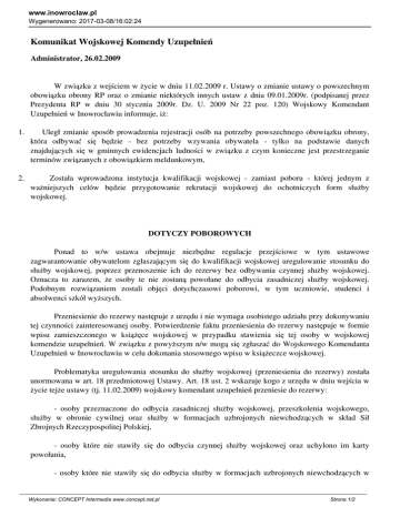 www.inowroclaw.pl Wygenerowano: 2017-03-08/16:02:24 Komunikat Wojskowej Komendy Uzupełnień Administrator, 26.02.2009 W związku z wejściem w życie w dniu 11.02.2009 r. Ustawy o zmianie ustawy o powszechnym obowiązku obrony RP oraz o zmianie niektórych innych ustaw z dnia 09.01.2009r. (podpisanej przez Prezydenta RP w dniu 30 stycznia 2009r. Dz. U. 2009 Nr 22 poz. 120) Wojskowy Komendant Uzupełnień w Inowrocławiu informuje, iż: 1. Uległ zmianie sposób prowadzenia rejestracji osób na potrzeby powszechnego obowiązku obrony, która odbywać się będzie - bez potrzeby wzywania obywatela - tylko na podstawie danych znajdujących się w gminnych ewidencjach ludności w związku z czym konieczne jest przestrzeganie terminów związanych z obowiązkiem meldunkowym, 2. Została wprowadzona instytucja kwalifikacji wojskowej - zamiast poboru - której jednym z ważniejszych celów będzie przygotowanie rekrutacji wojskowej do ochotniczych form służby wojskowej. DOTYCZY POBOROWYCH Ponad to w/w ustawa obejmuje niezbędne regulacje przejściowe w tym ustawowe zagwarantowanie obywatelom zgłaszającym się do kwalifikacji wojskowej uregulowanie stosunku do służby wojskowej, poprzez przenoszenie ich do rezerwy bez odbywania czynnej służby wojskowej. Oznacza to zarazem, że osoby te nie zostaną powołane do odbycia zasadniczej służby wojskowej. Podobnym rozwiązaniem zostali objęci dotychczasowi poborowi, w tym uczniowie, studenci i absolwenci szkół wyższych. Przeniesienie do rezerwy następuje z urzędu i nie wymaga osobistego udziału przy dokonywaniu tej czynności zainteresowanej osoby. Potwierdzenie faktu przeniesienia do rezerwy następuje w formie wpisu zamieszczonego w książęce wojskowej w przypadku stawienia się tej osoby w wojskowej komendzie uzupełnień. W związku z powyższym n/w mogą się zgłaszać do Wojskowego Komendanta Uzupełnień w Inowrocławiu w celu dokonania stosownego wpisu w książeczce wojskowej. Problematyka uregulowania stosunku do służby wojskowej (przeniesienia do rezerwy) została unormowana w art. 18 przedmiotowej Ustawy. Art. 18 ust. 2 wskazuje kogo z urzędu w dniu wejścia w życie tejże ustawy (tj. 11.02.2009) wojskowy komendant uzupełnień przeniesie do rezerwy: - osoby przeznaczone do odbycia zasadniczej służby wojskowej, przeszkolenia wojskowego, służby w obronie cywilnej oraz służby w formacjach uzbrojonych niewchodzących w skład Sił Zbrojnych Rzeczypospolitej Polskiej, - osoby które nie stawiły się do odbycia czynnej służby wojskowej oraz uchylono im karty powołania, - osoby które nie stawiły się do odbycia służby w formacjach uzbrojonych niewchodzących w Wykonanie: CONCEPT Intermedia www.concept.net.pl Strona 1/2 www.inowroclaw.pl Wygenerowano: 2017-03-08/16:02:24 skład Sił Zbrojnych RP oraz uchylono im karty skierowania do tej służby, - osoby korzystające z odroczenia zasadniczej służby wojskowej, bez względu na tytuł tego odroczenia, - osoby będące absolwentami szkół wyższych niepowołanymi do odbycia przeszkolenia wojskowego, - osoby nie stawiające się na wezwania terenowych organów administracji wojskowej, -osoby przeznaczone do służby zastępczej i nieskierowane do odbycia tej służby, w tym osoby, którym odroczono jej odbywanie lub nie stawiły się do jej odbycia. Wykonanie: CONCEPT Intermedia www.concept.net.pl Strona 2/2