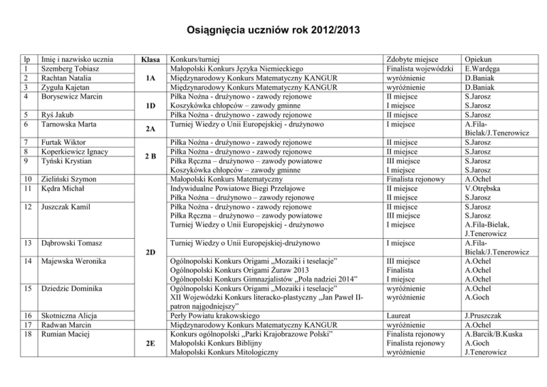 Osiągnięcia uczniów rok 2012/2013 lp 1 2 3 4 Imię i nazwisko ucznia Szemberg Tobiasz Rachtan Natalia Zyguła Kajetan Borysewicz Marcin Klasa 1A 1D 5 6 Ryś Jakub Tarnowska Marta 7 8 9 Furtak Wiktor Koperkiewicz Ignacy Tyński Krystian 10 11 Zieliński Szymon Kędra Michał 12 Juszczak Kamil 13 Dąbrowski Tomasz 14 Majewska Weronika 15 Dziedzic Dominika 16 17 18 Skotniczna Alicja Radwan Marcin Rumian Maciej 2A 2B Konkurs/turniej Małopolski Konkurs Języka Niemieckiego Międzynarodowy Konkurs Matematyczny KANGUR Międzynarodowy Konkurs Matematyczny KANGUR Piłka Nożna - drużynowo - zawody rejonowe Koszykówka chłopców – zawody gminne Piłka Nożna - drużynowo - zawody rejonowe Turniej Wiedzy o Unii Europejskiej - drużynowo Zdobyte miejsce Finalista wojewódzki wyróżnienie wyróżnienie II miejsce I miejsce II miejsce I miejsce Piłka Nożna - drużynowo - zawody rejonowe Piłka Nożna - drużynowo - zawody rejonowe Piłka Ręczna – drużynowo – zawody powiatowe Koszykówka chłopców – zawody gminne Małopolski Konkurs Matematyczny Indywidualne Powiatowe Biegi Przełajowe Piłka Nożna – drużynowo – zawody rejonowe Piłka Nożna - drużynowo - zawody rejonowe Piłka Ręczna – drużynowo – zawody powiatowe Turniej Wiedzy o Unii Europejskiej - drużynowo II miejsce II miejsce III miejsce I miejsce Finalista rejonowy II miejsce II miejsce II miejsce III miejsce I miejsce Turniej Wiedzy o Unii Europejskiej-drużynowo I miejsce Ogólnopolski Konkurs Origami „Mozaiki i teselacje” Ogólnopolski Konkurs Origami Żuraw 2013 Ogólnopolski Konkurs Gimnazjalistów „Pola nadziei 2014” Ogólnopolski Konkurs Origami „Mozaiki i teselacje” XII Wojewódzki Konkurs literacko-plastyczny „Jan Paweł IIpatron najgodniejszy” Perły Powiatu krakowskiego Międzynarodowy Konkurs Matematyczny KANGUR Konkurs ogólnopolski „Parki Krajobrazowe Polski” Małopolski Konkurs Biblijny Małopolski Konkurs Mitologiczny III miejsce Finalista I miejsce wyróżnienie wyróżnienie Opiekun E.Wardęga D.Baniak D.Baniak S.Jarosz S.Jarosz S.Jarosz A.FilaBielak/J.Tenerowicz S.Jarosz S.Jarosz S.Jarosz S.Jarosz A.Ochel V.Otrębska S.Jarosz S.Jarosz S.Jarosz A.Fila-Bielak, J.Tenerowicz A.FilaBielak/J.Tenerowicz A.Ochel A.Ochel A.Ochel A.Ochel A.Goch Laureat wyróżnienie Finalista rejonowy Finalista rejonowy wyróżnienie J.Pruszczak A.Ochel A.Barcik/B.Kuska A.Goch J.Tenerowicz 2D 2E 19 Zieliński Maciej Konkurs ogólnopolski „Parki Krajobrazowe Polski” Turniej Wiedzy o Unii Europejskiej - drużynowo Finalista rejonowy I miejsce 20 21 22 Puchała Bartłomiej Dworniak Krzysztof Dudek Jakub Małopolski Konkurs Biblijny Koszykówka chłopców – zawody gminne Małopolskie Mistrzostwa Dzieci i Młodzików w Łucznictwiekategoria Młodzik starszy III Runda Pucharu Małopolski-kategoria Młodzik starszy Mistrzostwa Województwa Małopolskiego-IOR FITA juniorów młodszych, łuków klasycznych Konkurs Fotograficzny „Najpiękniejsze drzewo w okolicy” Małopolski Konkurs Geograficzny Małopolski Konkurs Matematyczny Ogólnopolska Olimpiada Matematyczna Gimnazjalistów Małopolski Konkurs Fizyczny Ogólnopolski Konkurs „Film na horyzoncie” Małopolski Konkurs Matematyczny Małopolski Konkurs Języka Angielskiego Piłka Ręczna – drużynowo – zawody powiatowe Piłka Ręczna – drużynowo – zawody powiatowe Koszykówka chłopców – zawody gminne Piłka Ręczna – drużynowo – zawody powiatowe Piłka Ręczna – drużynowo – zawody powiatowe Koszykówka chłopców – zawody gminne Małopolski Konkurs Języka Angielskiego Małopolski Konkurs Języka Angielskiego Ogólnopolski Konkurs „Film na horyzoncie” Ogólnopolski Konkurs „Film na horyzoncie” Ogólnopolski Konkurs „Film na horyzoncie” Ogólnopolski Konkurs „Film na horyzoncie” Ogólnopolski Konkurs „Film na horyzoncie” Małopolski Konkurs Matematyczny Ogólnopolska Olimpiada Matematyczna Gimnazjalistów Małopolski Konkurs Matematyczny Międzynarodowy Konkurs Matematyczny KANGUR Małopolski Konkurs Geograficzny Finalista rejonowy I miejsce II miejsce 23 24 25 Olkuska Aleksandra Drzymała Adrianna Mazur Aleksandra 26 27 Piłat Aleksandra Wardęga Grzegorz 28 Gędłek Filip 29 30 Czepiec Konrad Kudełko Piotr 31 32 Surdziel Grzegorz Pędrys Olga 33 34 35 36 37 Bajor Karolina Bajor Monika Milewska Emma Chrzanowska Malwina Fatuła Daniel 38 Homan Marek 39 Dziedzic Karolina 3A 3B A.Barcik/B.Kuska A.FilaBielak/J.Tenerowicz A.Goch S.Jarosz ------- I miejsce I miejsce wyróżnienie Finalista rejonowy Laureat Finalista wojewódzki Finalista wojewódzki Laureat Finalista rejonowy Finalista wojewódzki III miejsce III miejsce I miejsce III miejsce III miejsce I miejsce Finalista wojewódzki Finalista wojewódzki Laureat Laureat Laureat Laureat Laureat Finalista wojewódzki Finalista wojewódzki Finalista rejonowy wyróżnienie Finalista rejonowy A.Sternak A.Barcik A.Ochel A.Ochel M.Zaprzelski R.Pędrys A.Ochel A.Brudkiewicz S.Jarosz S.Jarosz S.Jarosz S.Jarosz S.Jarosz S.Jarosz A.Brudkiewicz A.Brudkiewicz R.Pędrys R.Pędrys R.Pędrys R.Pędrys R.Pędrys A.Ochel A.Ochel A.Ochel A.Ochel A.Barcik 40 Ryczek Michał 41 42 Kamil Tomala Mateusz Kołacz 43 44 45 Dziedzic Wioletta Stec Kamil Gałaś Dominika 46 47 48 49 50 51 Zbroja Mateusz Sendor Bartłomiej Suwaj Agnieszka Surma Olga Gąsior Karolina Bator Marcin 52 Achtel Andrzej 53 54 Rutkowska Natalia Kędra Piotr 55 Obal Filip 56 57 58 Bodziony Kamil Świerk Konrad Burdek Magdalena 3C 3D 3E Małopolski Konkurs Matematyczny Małopolski Konkurs Fizyczny Małopolski Konkurs Geograficzny Małopolski Konkurs Fizyczny Małopolski Konkurs Informatyczny Międzynarodowy Konkurs Matematyczny KANGUR Ogólnopolski Konkurs Origami „Mozaiki i teselacje” Piłka Nożna - drużynowo - zawody rejonowe Małopolski Konkurs Języka Angielskiego Finalista wojewódzki Finalista rejonowy Finalista rejonowy Laureat Finalista wojewódzki wyróżnienie I miejsce II miejsce Finalista rej