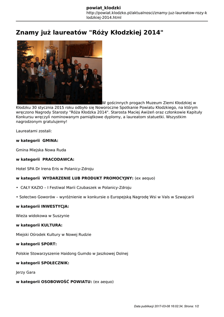powiat_klodzki http://powiat.klodzko.pl/aktualnosci/znamy-juz-laureatow-rozy-k lodzkiej-2014.html Znamy już laureatów "Róży Kłodzkiej 2014" W gościnnych progach Muzeum Ziemi Kłodzkiej w Kłodzku 30 stycznia 2015 roku odbyło się Noworoczne Spotkanie Powiatu Kłodzkiego, na którym wręczono Nagrody Starosty "Róża Kłodzka 2014". Starosta Maciej Awiżeń oraz członkowie Kapituły Konkursu wręczyli nominowanym pamiątkowe dyplomy, a laureatom statuetki. Wszystkim nagrodzonym gratulujemy! Laureatami zostali: w kategorii GMINA: Gmina Miejska Nowa Ruda w kategorii PRACODAWCA: Hotel SPA Dr Irena Eris w Polanicy-Zdroju w kategorii WYDARZENIE LUB PRODUKT PROMOCYJNY: (ex aequo) • CAŁY KAZIO – I Festiwal Marii Czubaszek w Polanicy-Zdroju • Sołectwo Goworów – wyróżnienie w konkursie o Europejską Nagrodę Wsi w Vals w Szwajcarii w kategorii INWESTYCJA: Wieża widokowa w Suszynie w kategorii KULTURA: Miejski Ośrodek Kultury w Nowej Rudzie w kategorii SPORT: Polskie Stowarzyszenie Haidong Gumdo w Jaszkowej Dolnej w kategorii SPOŁECZNIK: Jerzy Gara w kategorii OSOBOWOŚĆ POWIATU: (ex aequo) Data publikacji 2017-03-08 16:02:34, Strona: 1/2 powiat_klodzki http://powiat.klodzko.pl/aktualnosci/znamy-juz-laureatow-rozy-k lodzkiej-2014.html • Monika Wielichowska • prof. dr hab. dr h.c. Kazimierz Kobus Data publikacji 2017-03-08 16:02:34, Strona: 2/2