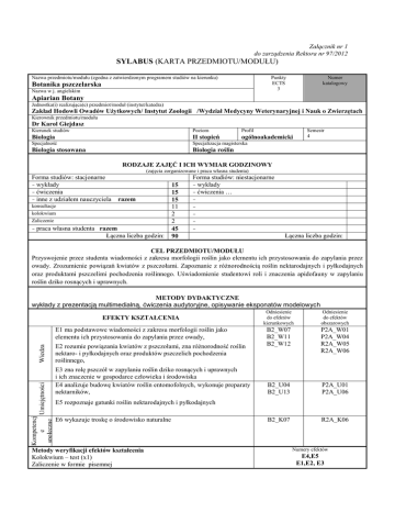 Załącznik nr 1 do zarządzenia Rektora nr 97/2012 SYLABUS (KARTA PRZEDMIOTU/MODUŁU) Nazwa przedmiotu/modułu (zgodna z zatwierdzonym programem studiów na kierunku) Punkty ECTS 3 Botanika pszczelarska Nazwa w j. angielskim Numer katalogowy Apiarian Botany Jednostka(i) realizująca(e) przedmiot/moduł (instytut/katedra) Zakład Hodowli Owadów Użytkowych/ Instytut Zoologii /Wydział Medycyny Weterynaryjnej i Nauk o Zwierzętach Kierownik przedmiotu/modułu Dr Karol Giejdasz Kierunek studiów Poziom Profil Biologia II stopień ogólnoakademicki Specjalność Specjalizacja magisterska Biologia stosowana Biologia roślin Semestr 4 RODZAJE ZAJĘĆ I ICH WYMIAR GODZINOWY (zajęcia zorganizowane i praca własna studenta) Forma studiów: stacjonarne wykłady ćwiczenia inne z udziałem nauczyciela razem konsultacje kolokwium Zaliczenie praca własna studenta razem Łączna liczba godzin: 15 15 15 11 2 2 45 90 Forma studiów: niestacjonarne wykłady ćwiczenia … Łączna liczba godzin: CEL PRZEDMIOTU/MODUŁU Przyswojenie przez studenta wiadomości z zakresu morfologii roślin jako elementu ich przystosowania do zapylania przez owady. Zrozumienie powiązań kwiatów z pszczołami. Zapoznanie z różnorodnością roślin nektarodajnych i pyłkodajnych oraz produktami pszczelimi pochodzenia roślinnego. Uświadomienie studentowi roli i znaczenia apidofauny w zapylaniu roślin dziko rosnących i uprawnych. METODY DYDAKTYCZNE wykłady z prezentacją multimedialną, ćwiczenia audytoryjne, opisywanie eksponatów modelowych EFEKTY KSZTAŁCENIA Kompetencj e Umiejętności społeczne Wiedza E1 ma podstawowe wiadomości z zakresu morfologii roślin jako elementu ich przystosowania do zapylania przez owady, E2 rozumie powiązania kwiatów z pszczołami, zna różnorodność roślin nektaro- i pyłkodajnych oraz produktów pszczelich pochodzenia roślinnego, E3 zna rolę pszczół w zapylaniu roślin dziko rosnących i uprawnych i ich znaczenie w gospodarce człowieka i środowiska E4 analizuje budowę kwiatów roślin entomofolnych, wykonuje preparaty nektarników, Odniesienie do efektów kierunkowych Odniesienie do efektów obszarowych B2_W07 B2_W11 B2_W12 P2A_W01 P2A_W04 R2A_W05 R2A_W06 B2_U04 B2_U13 P2A_U01 P2A_U06 B2_K07 R2A_K06 E5 rozpoznaje gatunki roślin nektarodajnych i pyłkodajnych E6 wykazuje troskę o środowisko naturalne Metody weryfikacji efektów kształcenia Kolokwium – test (x1) Zaliczenie w formie pisemnej Numery efektów E4,E5 E1,E2, E3 TREŚCI KSZTAŁCENIA Wykłady: Znaczenie pszczół w zapylaniu roślin. Przystosowania roślin do zapylania przez owady. Surowce roślinne zbierane i wykorzystywane przez pszczoły. Nektar a właściwości miodów. Rodzaje pożytków pszczelich. Entomofilne rośliny uprawne i ich owady zapylające. Ćwiczenia: Morfologia kwiatu a dostępność kwiatu dla owada. Nektarniki jako atraktanty pokarmowe, pierwszego stopnia. Atraktanty drugiego rzędu - powabność kwiatów, barwa i zapach. Obfitość nektarowania i miododajność roślin. Wydajność pastwiska pszczelego. Gatunki roślin pyłkodajnych i miododajnych. Formy i kryteria zaliczenia przedmiotu/modułu Test – ćwiczenia Zaliczenie w formie pisemnej Procentowy udział w końcowej ocenie 50% 50% WYKAZ LITERATURY Literatura podstawowa 1. Banaszak J. (1987) Pszczoły i zapylanie, PWRiL Poznań 2. Jabłoński B. (1997) Potrzeby zapylania i wartość pszczelarska owadopylnych roślin uprawnych, Oddział Pszczelnictwa ISK Puławy 3. Lipiński M. (2010) Pożytki pszczele, PWRiL Warszawa Literatura uzupełniająca 1. Jabłoński B. (1993) Ogródek pszczelarski, Oddział Pszczelnictwa ISK Puławy 2. Kołtowski Z. (2006) Wielki atlas roślin miododajnych, Przedsiębiorstwo Wydawnicze Rzeczpospolita 3. Prabucki J red. (1998) Pszczelnictwo , Wydawnictwo Promocyjne „Albatros”