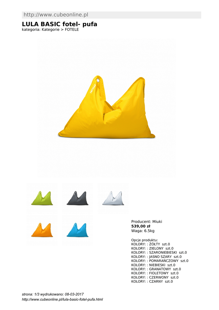 http://www.cubeonline.pl LULA BASIC fotel- pufa kategoria: Kategorie > FOTELE Producent: Miuki 539,00 zł Waga: 6.5kg strona: 1/3 wydrukowano: 08-03-2017 http://www.cubeonline.pl/lula-basic-fotel-pufa.html Opcje produktu: KOLORY: : ŻÓŁTY szt.0 KOLORY: : ZIELONY szt.0 KOLORY: : SZARONIEBIESKI szt.0 KOLORY: : JASNO SZARY szt.0 KOLORY: : POMARAŃCZOWY szt.0 KOLORY: : NIEBIESKI szt.0 KOLORY: : GRANATOWY szt.0 KOLORY: : FIOLETOWY szt.0 KOLORY: : CZERWONY szt.0 KOLORY: : CZARNY szt.0 Kod QR: LULA to duża poducha, mebel wielofunkcyjny, puf do siedzenia z podparciem pod plecy, materac do leżenia, jak i puf dla dzieci do skakania i szaleństw. Pufy są bardzo lekkie i wygodne w użytkowaniu. Dzięki wypełnieniu z granulatu - mebel dopasowuje się do każdej pozycji, którą w danej chwili chcemy przyjąć kolorowe i proste w formie idealnie odpowiedzą na młodzieżowe gusta. Lula, jajo, mumu to także idealne pufy rehabilitacyjne. Uchwyt ułatwia przenoszenie. strona: 2/3 wydrukowano: 08-03-2017 http://www.cubeonline.pl/lula-basic-fotel-pufa.html Miły mebel składa się z dwóch warstw: zewnętrznego pokrowca, który można prać w pralce i wewnętrznego wkładu z granulatem, każdy puf zaopatrzony jest w długi zamek błyskawiczny umożliwiający wyjęcie wkładu z granulatem Poducha wymaga okresowego uzupełniania granulatu. MATERIAŁ: pokrycie: tkanina wkład: granulat polistyrenowy WYMIARY (cm): wysokość - 170 szerokość - 130 UWAGI: czyszczenie: pokrowiec prać w pralce strona: 3/3 wydrukowano: 08-03-2017 http://www.cubeonline.pl/lula-basic-fotel-pufa.html