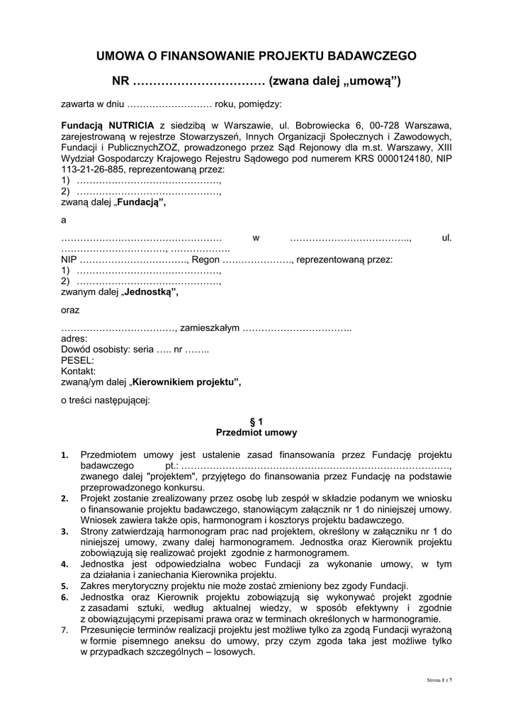 UMOWA O FINANSOWANIE PROJEKTU BADAWCZEGO NR …………………………… (zwana dalej „umową”) zawarta w dniu ……………………… roku, pomiędzy: Fundacją NUTRICIA z siedzibą w Warszawie, ul. Bobrowiecka 6, 00-728 Warszawa, zarejestrowaną w rejestrze Stowarzyszeń, Innych Organizacji Społecznych i Zawodowych, Fundacji i PublicznychZOZ, prowadzonego przez Sąd Rejonowy dla m.st. Warszawy, XIII Wydział Gospodarczy Krajowego Rejestru Sądowego pod numerem KRS 0000124180, NIP 113-21-26-885, reprezentowaną przez: 1) ………………………………………, 2) ………………………………………, zwaną dalej „Fundacją”, a …………………………………………… w ……………………………….., ……………………………, ………………. NIP ……………………………., Regon …………………., reprezentowaną przez: 1) ………………………………………, 2) ………………………………………, zwanym dalej „Jednostką”, ul. oraz ………………………………, zamieszkałym …………………………….. adres: Dowód osobisty: seria ….. nr …….. PESEL: Kontakt: zwaną/ym dalej „Kierownikiem projektu”, o treści następującej: §1 Przedmiot umowy 1. 2. 3. 4. 5. 6. 7. Przedmiotem umowy jest ustalenie zasad finansowania przez Fundację projektu badawczego pt.: …………………………………………………………………………., zwanego dalej "projektem", przyjętego do finansowania przez Fundację na podstawie przeprowadzonego konkursu. Projekt zostanie zrealizowany przez osobę lub zespół w składzie podanym we wniosku o finansowanie projektu badawczego, stanowiącym załącznik nr 1 do niniejszej umowy. Wniosek zawiera także opis, harmonogram i kosztorys projektu badawczego. Strony zatwierdzają harmonogram prac nad projektem, określony w załączniku nr 1 do niniejszej umowy, zwany dalej harmonogramem. Jednostka oraz Kierownik projektu zobowiązują się realizować projekt zgodnie z harmonogramem. Jednostka jest odpowiedzialna wobec Fundacji za wykonanie umowy, w tym za działania i zaniechania Kierownika projektu. Zakres merytoryczny projektu nie może zostać zmieniony bez zgody Fundacji. Jednostka oraz Kierownik projektu zobowiązują się wykonywać projekt zgodnie z zasadami sztuki, według aktualnej wiedzy, w sposób efektywny i zgodnie z obowiązującymi przepisami prawa oraz w terminach określonych w harmonogramie. Przesunięcie terminów realizacji projektu jest możliwe tylko za zgodą Fundacji wyrażoną w formie pisemnego aneksu do umowy, przy czym zgoda taka jest możliwe tylko w przypadkach szczególnych – losowych. Strona 1 z 7 §2 Zobowiązania Jednostki 1. 2. Przy realizacji umowy Jednostka zobowiązuje się w szczególności do: 1) badania raportów, o których mowa w § 6 umowy, w celu zweryfikowania ich zgodności z harmonogramem, przed przekazaniem ich Fundacji; 2) sprawowania nadzoru nad realizacją projektu i niezwłocznego informowania Fundacji o każdym zdarzeniu mającym wpływ na realizację projektu; 3) przekazywania wszelkich informacji związanych z wykonaniem umowy, o które poprosi Fundacja; 4) czuwania nad realizacją projektu zgodnie z umową, prawem oraz podstawowymi zasadami etycznymi i standardami naukowymi. Dodatkowe obowiązki Jednostki zostały określone w oświadczeniu, stanowiącym załącznik nr 2 do niniejszej umowy. §3 Zasady finansowania oraz kontrola wydatkowania środków 1. 2. 3. 4. 5. 6. 7. 8. 9. Finansowaniu podlegają wyłącznie koszty kwalifikowane, o których mowa w ust. 2, w zakresie określonym w kosztorysie. Koszty kwalifikowane, o których mowa w ust. 1, stanowią koszty poniesione w ramach realizacji projektu, które muszą spełniać następujące kryteria, aby mogły być uznane za kwalifikowane: 1) muszą zostać rzeczywiście poniesione przez Jednostkę w okresie realizacji projektu; 2) mogą zostać poniesione wyłącznie dla osiągnięcia celów projektu, z zachowaniem zasad gospodarności, skuteczności i wydajności; 3) muszą zostać ustalone zgodnie z zasadami rachunkowości i zarządzania oraz praktykami danej Jednostki. Procedury rachunkowe używane do księgowania kosztów i wpływów muszą być zgodne z przepisami o rachunkowości; 4) muszą zostać zaksięgowane w księgach rachunkowych Jednostki; 5) muszą zostać wskazane w szacunkowym kosztorysie, stanowiącym załącznik nr 1 do Umowy. Koszty niekwalifikowane, stanowią w szczególności następujące koszty: 1) rezerwy na poczet przyszłych strat lub obciążeń; 2) straty wynikające z ujemnych różnic kursowych, koszty związane ze zwrotem z kapitału; 3) koszty aparatury i specjalistycznego sprzętu niezbędnego do realizacji projektu;. 4) koszty zadeklarowane lub poniesione, lub zwrócone w związku z innym projektem finansowanym przez Fundację; 5) wydatki nadmierne lub lekkomyślne. Koszty, o których mowa w ust. 3, nie podlegają finansowaniu w ramach projektu. Wynagrodzenie z tytułu zatrudnienia, o którym mowa w oświadczeniu stanowiącym załącznik nr 2 do umowy, określają odrębne umowy pomiędzy Jednostką a pracownikami niezbędnymi do realizacji projektu. Jednostka jest zobowiązana prowadzić wyodrębnioną dokumentację finansowoksięgową dla realizacji projektu. Środkami finansowymi przekazanymi na realizację projektu dysponuje Kierownik projektu, z tym że wydatkowanie środków finansowych następuje po uzyskaniu zgody Jednostki. Jednostka sprawuje nadzór nad realizacją projektu i nad prawidłowością wydatkowania środków finansowych. Środki finansowe na realizację projektu nie mogą być wydatkowane na inne cele niż określone w umowie. Jednostka jest odpowiedzialna za prawidłowe wydatkowanie tych środków zgodnie z umową. Strona 2 z 7 10. Przesunięcia w budżecie projektu w ramach środków finansowych przeznaczonych na realizację projektu są dopuszczalne i n
