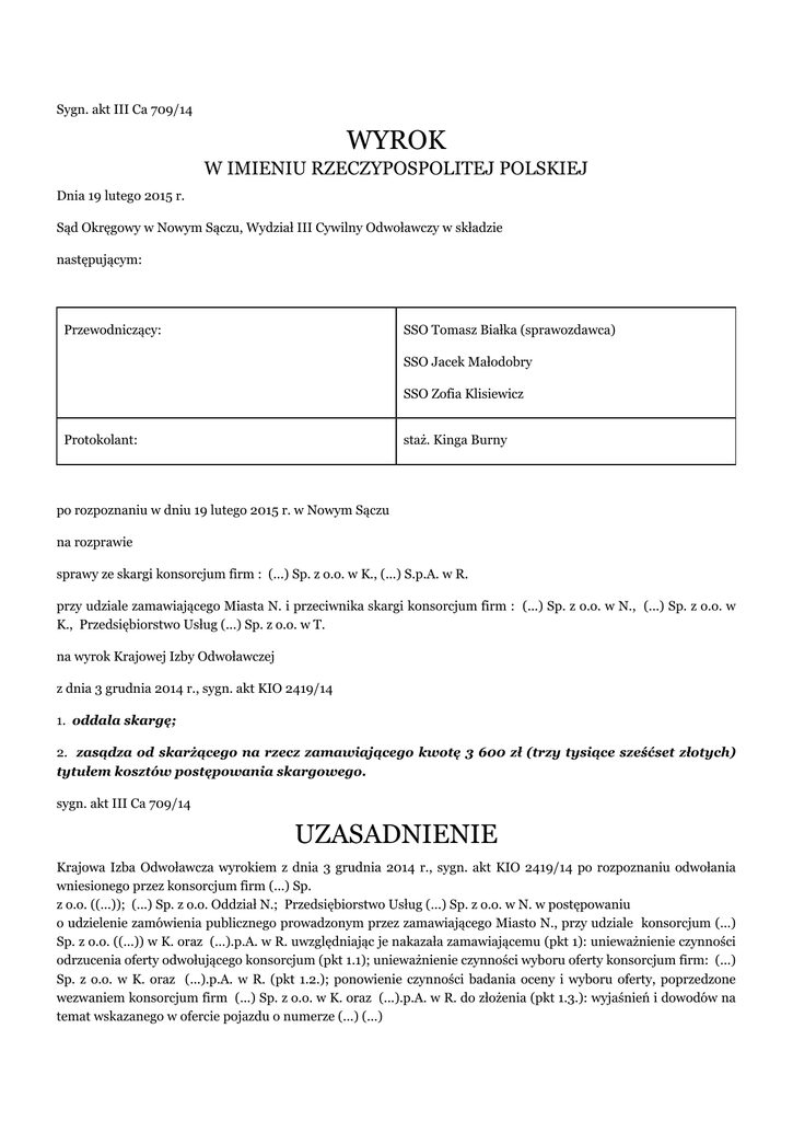 Sygn. akt III Ca 709/14 WYROK W IMIENIU RZECZYPOSPOLITEJ POLSKIEJ Dnia 19 lutego 2015 r. Sąd Okręgowy w Nowym Sączu, Wydział III Cywilny Odwoławczy w składzie następującym: Przewodniczący: SSO Tomasz Białka (sprawozdawca) SSO Jacek Małodobry SSO Zofia Klisiewicz Protokolant: staż. Kinga Burny po rozpoznaniu w dniu 19 lutego 2015 r. w Nowym Sączu na rozprawie sprawy ze skargi konsorcjum firm : (...) Sp. z o.o. w K., (...) S.p.A. w R. przy udziale zamawiającego Miasta N. i przeciwnika skargi konsorcjum firm : (...) Sp. z o.o. w N., (...) Sp. z o.o. w K., Przedsiębiorstwo Usług (...) Sp. z o.o. w T. na wyrok Krajowej Izby Odwoławczej z dnia 3 grudnia 2014 r., sygn. akt KIO 2419/14 1. oddala skargę; 2. zasądza od skarżącego na rzecz zamawiającego kwotę 3 600 zł (trzy tysiące sześćset złotych) tytułem kosztów postępowania skargowego. sygn. akt III Ca 709/14 UZASADNIENIE Krajowa Izba Odwoławcza wyrokiem z dnia 3 grudnia 2014 r., sygn. akt KIO 2419/14 po rozpoznaniu odwołania wniesionego przez konsorcjum firm (...) Sp. z o.o. ((...)); (...) Sp. z o.o. Oddział N.; Przedsiębiorstwo Usług (...) Sp. z o.o. w N. w postępowaniu o udzielenie zamówienia publicznego prowadzonym przez zamawiającego Miasto N., przy udziale konsorcjum (...) Sp. z o.o. ((...)) w K. oraz (...).p.A. w R. uwzględniając je nakazała zamawiającemu (pkt 1): unieważnienie czynności odrzucenia oferty odwołującego konsorcjum (pkt 1.1); unieważnienie czynności wyboru oferty konsorcjum firm: (...) Sp. z o.o. w K. oraz (...).p.A. w R. (pkt 1.2.); ponowienie czynności badania oceny i wyboru oferty, poprzedzone wezwaniem konsorcjum firm (...) Sp. z o.o. w K. oraz (...).p.A. w R. do złożenia (pkt 1.3.): wyjaśnień i dowodów na temat wskazanego w ofercie pojazdu o numerze (...) (...) i posiadanego napędu przez ten pojazd (pkt 1.3.a.); dokumentu potwierdzającego posiadanie na termin złożenia ofert - umowy z podmiotem właściwym do zagospodarowania odpadów obejmujących przetwarzanie pozostałości z sortowania odpadów komunalnych przeznaczonych do składowania (pkt 1.3.b.) i do uzupełnienia dokumentu Certyfikatu Jakości zgodnie z normą (...) (...) lub Certyfikatu (...) zgodnie z normą (...) (...) lub innego równoważnego potwierdzającego spełnianie wymogów standardów zarządzania jakościowego lub zarządzania środowiskowego w odniesieniu lidera konsorcjum, tj. (...) Sp. z o.o. w K. (pkt 1.3.c.). Kosztami postępowania obciążyła zamawiającego (pkt 2) i zaliczyła na poczet kosztów postępowania odwoławczego kwotę 15 000 zł uiszczoną przez odwołującego tytułem wpisu od odwołania (pkt 2.1.). Zasądziła także od zamawiającego kwotę 18 600 zł na rzecz odwołującego tytułem zwrotu kosztów poniesionego wpisu od odwołania oraz kosztów zastępstwa przez pełnomocnika (pkt 2.2.). W uzasadnieniu Krajowa izba Odwoławcza podała, że w postępowaniu o udzielenie zamówienia publicznego, prowadzonym w trybie przetargu nieograniczonego ogłoszonym w Dzienniku Urzędowym (...) z 12 sierpnia 2014 r., nr (...) na „Odbieranie odpadów komunalnych od właścicieli nieruchomości na terenie miasta N. oraz zagospodarowanie odpadów komunalnych", zostało złożone w odwołanie przez konsorcjum firm: (...) Sp. z o.o. ((...)); (...) Sp. z o.o. Oddział N.; Przedsiębiorstwo Usług (...) Sp. z o.o. w N., których oferta została odrzucona. Za najkorzystniejszą uznana została bowiem oferta konsorcjum (...) Sp. z o.o. ((...)) z siedzibą w K. oraz (...).p.A. z siedzibą w R.. Podniesione w odwołaniu zarzuty w części uznała za uzasadnione. W odniesieniu do zarzutu odrzucenia oferty odwołującego, pomimo braku podstaw ku temu oraz wezwania go do uzupełnienia dokumentu, który znajdował się w ofercie, Izba wskazała, iż nie podzielała poglądów, że prowadzący regionalną instalację do przetwarzania odpadów komunalnych był obowiązany zawrzeć umowę na zagospodarowanie zmieszanych odpadów komunalnych odpadów zielonych lub pozostałości z sortowania odpadów komunalnych przeznaczonych do składowania ze wszystkimi podmiotami odbierającymi odpady komunalne od właścicieli nieruchomości, którzy wykonywali swoją działalność w ramach regionu gospodarki odpadami komunalnymi, zatem (...) jakim był (...) sp. z o.o. nie mógł odmówić przyjęcia odpadów na swoją instalację i dlatego żądanie przedmiotowej umowy w niniejszym postępowaniu było bezzasadne, zatem nie mogło wywoływać skutków prawnych. Izba nie uznała również za prawidłowe poglądów odwołującego, że wykonawca wezwany do uzupełnienia dokumentu, które uznaje za naruszające przepisy ustawy pzp, nie był uprawniony do zaskarżenia takiej czynności z braku legitymacji do wniesienia odwołania z racji rzekomej niemożliwości wykazania poniesienia chociażby potencjalnej szkody. Brak podporządkowania się wezwaniu zgodnie z art. 46 ust. 4a pzp mógł skutkować zatrzymaniem wadium, co było wystarczającą przesłanką wykazania szkody, nie mówiąc o dalszych następstwach - odrzucenia oferty. Izba przychyliła się natomiast do argumentacji odwołującego w świetle, której datą kluczową dla oceny, czy dany dokument potwierdza spełnianie przez oferowane usługi wymagań (...) była data upływu terminu składania ofert. Jako, że przedstawiona przez odwołującego umowa z 1 kwietnia 2014 r., potwierdzająca dostęp wykonawcy do instalacji regionalnej przetwarzającej odpady zielone była ważna w momencie upływu terminu składania ofert, zatem potwierdzała zgodność oferowanych usług z wymaganiami (...). Trafna była ponadto argumentacja odwołującego, że w treści uzasadnienia faktycznego odrzucenia oferty odwołującego nawet nie podano, że elementem niezgodnym jest brak obowiązywania tej umowy na okres realizacji zamówienia. Zarzut błędnego odrzucenia oferty odwołującego, był zatem zasadny. W odniesieniu do zarzutu zaniechania wykluczenia konsorcjum (.