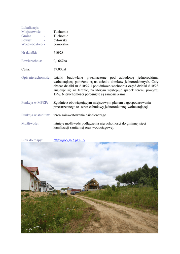 Lokalizacja: Miejscowość Gmina Powiat Województwo - Tuchomie Tuchomie bytowski pomorskie Nr działki: 610/28 Powierzchnia: 0,1667ha Cena: 37.000zł Opis nieruchomości: działki budowlane przeznaczone pod zabudowę jednorodzinną wolnostojącą, położone są na osiedlu domków jednorodzinnych. Cały obszar działki nr 610/27 i południowo-wschodnia część działki 610/28 znajduje się na terenie, na którym występuje spadek terenu powyżej 15%. Nieruchomości porośnięte są samosiejkami . Funkcja w MPZP: Zgodnie z obowiązującym miejscowym planem zagospodarowania przestrzennego to teren zabudowy jednorodzinnej wolnostojącej Funkcja w studium: teren zainwestowania osiedleńczego Możliwości: Istnieje możliwość podłączenia nieruchomości do gminnej sieci kanalizacji sanitarnej oraz wodociągowej. Link do mapy: http://goo.gl/XpFGPy