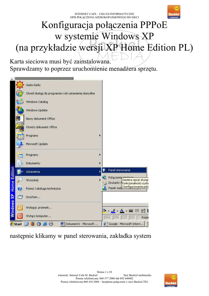 INTERNET CAFE – USŁUGI INFORMATYCZNE OPIS POŁĄCZENIA SZEROKOPASMOWEGO DO SIECI Konfiguracja połączenia PPPoE w systemie Windows XP (na przykładzie wersji XP Home Edition PL) Karta sieciowa musi być zainstalowana. Sprawdzamy to poprzez uruchomienie menadŜera sprzętu. następnie klikamy w panel sterowania, zakładka system Strona 1 z 10 własność: Internet Cafe M. Backiel Sieć Backiel multimedia Pomoc telefoniczna: 068 377 2006 lub 692 640482 Pomoc telefoniczna 068 410 2006 – bezpłatne połączenie z sieci Backiel.TEL INTERNET CAFE – USŁUGI INFORMATYCZNE OPIS POŁĄCZENIA SZEROKOPASMOWEGO DO SIECI otwieramy na zakładce sprzęt Strona 2 z 10 własność: Internet Cafe M. Backiel Sieć Backiel multimedia Pomoc telefoniczna: 068 377 2006 lub 692 640482 Pomoc telefoniczna 068 410 2006 – bezpłatne połączenie z sieci Backiel.TEL INTERNET CAFE – USŁUGI INFORMATYCZNE OPIS POŁĄCZENIA SZEROKOPASMOWEGO DO SIECI następnie klikamy w „MenedŜer urządzeń” i powinniśmy ujrzeć karte sieciową zainstalowaną, jeśli karta nie jest w tym momencie zainstalowana, zainstaluj ją. Poprawnie zainstalowana i w pełni sprawna karta sieciowa jest wymagana do korzystania z sieci Internet. Tak wygląda poprawnie zainstalowana karta sieciowa Strona 3 z 10 własność: Internet Cafe M. Backiel Sieć Backiel multimedia Pomoc telefoniczna: 068 377 2006 lub 692 640482 Pomoc telefoniczna 068 410 2006 – bezpłatne połączenie z sieci Backiel.TEL INTERNET CAFE – USŁUGI INFORMATYCZNE OPIS POŁĄCZENIA SZEROKOPASMOWEGO DO SIECI uwaga: zamiast SiS 900 pojawić się moŜe dowolna nazwa karty sieciowej, jest to zaleŜne od karty sieciowej zainstalowanej w Twoim komputerze. (np. Nvidia Network Controller lub Realtek Ethernet Controller lub Intel LAN Adapter etc.). WaŜne: Brak zainstalowanej/uruchomionej karty sieciowej to najczęstszy błąd w konfiguracji połączenia. konfigurowanie połączenia klikamy w internet Explorer, tak aby go uruchomić nastepnie wybieramy opcje internetowe. Strona 4 z 10 własność: Internet Cafe M. Backiel Sieć Backiel multimedia Pomoc telefoniczna: 068 377 2006 lub 692 640482 Pomoc telefoniczna 068 410 2006 – bezpłatne połączenie z sieci Backiel.TEL INTERNET CAFE – USŁUGI INFORMATYCZNE OPIS POŁĄCZENIA SZEROKOPASMOWEGO DO SIECI wybieramy zakładkę połączenia a następnie klikamy dodaj Strona 5 z 10 własność: Internet Cafe M. Backiel Sieć Backiel multimedia Pomoc telefoniczna: 068 377 2006 lub 692 640482 Pomoc telefoniczna 068 410 2006 – bezpłatne połączenie z sieci Backiel.TEL INTERNET CAFE – USŁUGI INFORMATYCZNE OPIS POŁĄCZENIA SZEROKOPASMOWEGO DO SIECI wybieramy połącz z siecią za pomocą komunikacji szerokopasmowej proszę kliknąć dalej następnie nazywamy jakoś nasze połączenie (nazwa jest dowolna) po kliknięciu zakończ, wpisujemy dane do logowania Strona 6 z 10 własność: Internet Cafe M. Backiel Sieć Backiel multimedia Pomoc telefoniczna: 068 377 2006 lub 692 640482 Pomoc telefoniczna 068 410 2006 – bezpłatne połączenie z sieci Backiel.TEL INTERNET CAFE – USŁUGI INFORMATYCZNE OPIS POŁĄCZENIA SZEROKOPASMOWEGO DO SIECI po kliknięciu ok., połączenie zostało utworzone moŜna wydobyć skrót do połączenia, np. z połączeń sieciowych w tym celu wchodzimy w menu start, ustawienia, połączenia sieciowe Strona 7 z 10 własność: Internet Cafe M. Backiel Sieć Backiel multimedia Pomoc telefoniczna: 068 377 2006 lub 692 640482 Pomoc telefoniczna 068 410 2006 – bezpłatne połączenie z sieci Backiel.TEL INTERNET CAFE – USŁUGI INFORMATYCZNE OPIS POŁĄCZENIA SZEROKOPASMOWEGO DO SIECI otwieramy połączenia sieciowe i widzimy utworzone połączenie moŜna przenieść skrót na pulpit bądź w dowolne miejsce połączenie jest utworzone, po kliknięciu w nie widzimy: Strona 8 z 10 własność: Internet Cafe M. Backiel Sieć Backiel multimedia Pomoc telefoniczna: 068 377 2006 lub 692 640482 Pomoc telefoniczna 068 410 2006 – bezpłatne połączenie z sieci Backiel.TEL INTERNET CAFE – USŁUGI INFORMATYCZNE OPIS POŁĄCZENIA SZEROKOPASMOWEGO DO SIECI gdy klikniemy połącz, przez chwile widoczne jest takie okno (czas widocznosci jest zaleŜny od wydajność komputera z którego następuje połaczenie) po połączeniu się, powinniśmy zobaczyć taki znak połączenie zostało nawiązane aby się rozłączyć, klikamy prawym przyciskiem myszy nad tymi dwoma „komuterkami (terminalami). Strona 9 z 10 własność: Internet Cafe M. Backiel Sieć Backiel multimedia Pomoc telefoniczna: 068 377 2006 lub 692 640482 Pomoc telefoniczna 068 410 2006 – bezpłatne połączenie z sieci Backiel.TEL INTERNET CAFE – USŁUGI INFORMATYCZNE OPIS POŁĄCZENIA SZEROKOPASMOWEGO DO SIECI po kliknięciu Odłącz, nie jesteśmy połączeni z siecią Internet Cafe. W razie jakichkolwiek pytań, prosimy o kontakt z naszym administratorem: Przemysław Backiel e-mail: [email protected] tel 068 410 2006 – połączenie bezpłatne z sieci Backiel.TEL tel. 068 377 2006 fax. 068 377 2006 tel. kom. 692-640-482 gg: 118744 skype: pbackiel Strona 10 z 10 własność: Internet Cafe M. Backiel Sieć Backiel multimedia Pomoc telefoniczna: 068 377 2006 lub 692 640482 Pomoc telefoniczna 068 410 2006 – bezpłatne połączenie z sieci Backiel.TEL