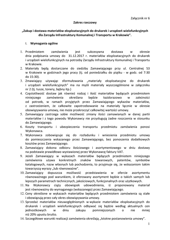 Załącznik nr 6 Zakres rzeczowy „Zakup i dostawa materiałów eksploatacyjnych do drukarek i urządzeń wielofunkcyjnych dla Zarządu Infrastruktury Komunalnej i Transportu w Krakowie”. I. Wymagania ogólne 1. Przedmiotem zamówienia jest sukcesywna dostawa w okresie dnia podpisania umowy do 31.12.2017 r. materiałów eksploatacyjnych do drukarek i urządzeń wielofunkcyjnych na potrzeby Zarządu Infrastruktury Komunalnej i Transportu w Krakowie. 2. Materiały będą dostarczane do siedziby Zamawiającego przy ul. Centralnej 53 w Krakowie w godzinach jego pracy (tj. od poniedziałku do piątku - w godz. od 7:30 do 15:30). 3. Zmawiający używając sformułowania „materiały eksploatacyjne do drukarek i urządzeń wielofunkcyjnych” ma na myśli materiały wyszczególnione w załączniku nr 2 (tj. tusze, tonery, bębny itp.) 4. Częstotliwość dostaw jak również rodzaj i ilość materiałów będących przedmiotem niniejszego zamówienia określana będzie każdorazowo w zależności od potrzeb, w ramach przyjętych przez Zamawiającego wykazów materiałów, z zastrzeżeniem, że całkowite zapotrzebowanie na materiały łącznie w okresie obowiązywania umowy, nie może przekroczyć całkowitej wartości umowy. 5. Zamawiający zastrzega sobie możliwość zmiany ilości zamawianych w danej partii materiałów i z tego powodu Wykonawcy nie przysługują żadne roszczenia w stosunku do Zamawiającego. 6. Koszty transportu i ubezpieczenia transportu przedmiotu zamówienia ponosi Wykonawca. 7. Wykonawca zobowiązuje się do rozładunku i wniesienia przedmiotu umowy do pomieszczenia wskazanego przez Zamawiającego, bez ponoszenia dodatkowych kosztów przez Zamawiającego. 8. Zamawiający dokona odbioru ilościowego i asortymentowego w dniu dostawy na podstawie prawidłowo wystawionej przez Wykonawcę faktury VAT. 9. Jeżeli Zamawiający w wykazach materiałów będących przedmiotem niniejszego zamówienia używa konkretnych znaków towarowych, patentów, symbolów katalogowych, nazw własnych lub pochodzenia, to przyjmuje się, że wskazaniom takim towarzyszą wyrazy „lub równoważne”. 10. Zamawiający dopuszcza możliwość przedstawienia w ofercie asortymentu równoważnego pod warunkiem, iż oferowany asortyment będzie o takich samych lub lepszych parametrach technicznych, jakościowych, funkcjonalnych oraz użytkowych. 11. Na Wykonawcy ciąży obowiązek udowodnienia, iż proponowany materiał jest równoważny do wymaganego (wskazanego) przez Zamawiającego. 12. Ceny określone w wykazach materiałów będących przedmiotem zamówienia są stałe i obowiązują przez cały okres obowiązywania umowy. 13. Sprzedaż materiałów nieuwzględnionych w wykazie materiałów eksploatacyjnych do drukarek i urządzeń wielofunkcyjnych odbywać się będzie według aktualnych cen jednostkowych w dniu zakupu pomniejszonych o nie mniej niż 20% upustu brutto. 14. Szczegółowe warunki realizacji zamówienia określają „Istotne postanowienia umowy”. 1 II. Wymagania dotyczące materiałów eksploatacyjnych do drukarek i urządzeń wielofunkcyjnych: 1. Wykonawca dostarczy produkty „fabrycznie nowe” tj. nieregenerowane, pochodzące z bieżącej produkcji, wytworzone seryjnie w cyklu produkcyjnym, wykonane z nowych elementów lub pełnowartościowych komponentów z odzysku, bez żadnych śladów uszkodzenia w oryginalnych opakowaniach producenta z widocznym logo, symbolem produktu i terminem przydatności do użytku, posiadające wszelkie zabezpieczenia szczelności zbiorników z tonerem. W przypadku tonerów do drukarek laserowych Zamawiający wymaga, aby elementy takie jak: bęben światłoczuły, listwa zbierająca, chip, jeśli jest wymagany oraz wszystkie inne elementy mające wpływ, na jakość wydruku, były w 100% fabrycznie nowe. 2. Przez produkt równoważny Zamawiający rozumie produkt, który jest w 100% kompatybilny ze sprzętem, do którego jest zamówiony, o parametrach takich samych lub lepszych (pojemność tuszu/tonera, wydajność, jakość wydruku) w stosunku do produktu oryginalnego produkowanego przez producenta urządzenia. 3. Wykonawca gwarantuje, że dostarczone tusze i tonery drukujące będą wysokiej jakości oraz zapewniają kompatybilność pracy z urządzeniami Zamawiającego, zapewniają należyte bezpieczeństwo oraz posiadają właściwe opakowanie i oznakowanie. 4. Wykonawca gwarantuje, że zamontowanie i używanie dostarczonych przez niego materiałów eksploatacyjnych, nie spowoduje utraty przez Zamawiającego przysługujących mu praw gwarancyjnych producenta urządzenia, do którego są przeznaczone. Dotyczy to szczególnie urządzeń XEROX i HP, dla których należy zastosować materiały eksploatacyjne, które nie mogą spowodować przeprogramowania urządzenia na inny region użytkowania niż Polska lub/i zablokowania urządzeń. W przypadku zastosowania wadliwego materiału eksploatacyjnego, powodującego zmianę regionu użytkowania urządzeń lub/i zablokowanie urządzeń, Wykonawca na własny koszt, zobowiązany jest do przywrócenia pierwotnej konfiguracji każdego urządzenia, dla którego autoryzowany serwis potwierdzi wprowadzenie zmian, poprzez użytkowanie dostarczonych materiałów eksploatacyjnych. Serwis urządzeń musi być realizowany przez autoryzowany serwis producenta urządzeń oraz odbywać się w siedzibie Zamawiającego w terminie do 5 dni roboczych od momentu zgłoszenia Wykonawcy. Koszty serwisu urządzeń oraz wymiany wadliwych materiałów eksploatacyjnych pokrywa w całości Wykonawca. 5. Zamawiający wymaga, aby oferowane materiały eksploatacyjne posiadały gwarancję na minimum 12 miesięcy od daty dostawy do Zamawiającego. 6. Jeżeli w trakcie trwania umowy, Zamawiający stwierdzi, iż wydajność, jakość lub niezawodność dostarczonych materiałów eksploatacyjnych niekorzystnie odbiega od wymagań producenta urządzeń, Wykonawca zobowiązuje się do gwarancyjnej wymiany produktu na nowy. Zgłoszen