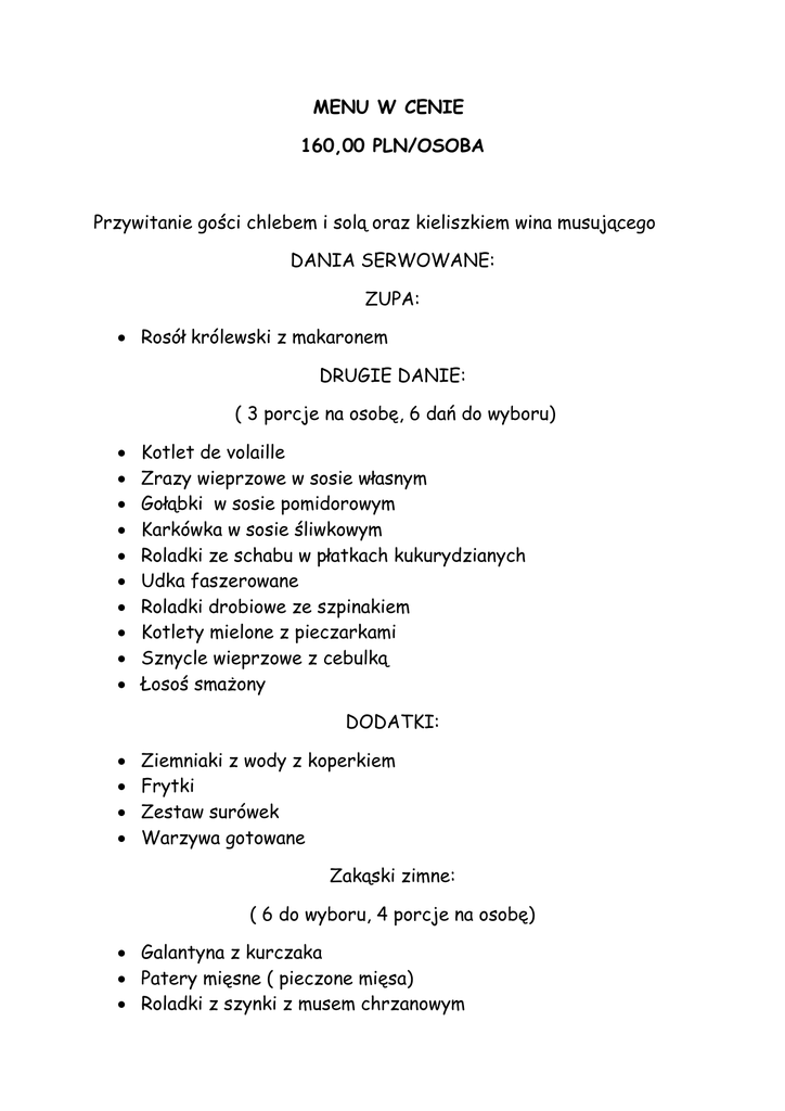 MENU W CENIE 160,00 PLN/OSOBA Przywitanie gości chlebem i solą oraz kieliszkiem wina musującego DANIA SERWOWANE: ZUPA: Rosół królewski z makaronem DRUGIE DANIE: ( 3 porcje na osobę, 6 dań do wyboru) Kotlet de volaille Zrazy wieprzowe w sosie własnym Gołąbki w sosie pomidorowym Karkówka w sosie śliwkowym Roladki ze schabu w płatkach kukurydzianych Udka faszerowane Roladki drobiowe ze szpinakiem Kotlety mielone z pieczarkami Sznycle wieprzowe z cebulką Łosoś smażony DODATKI: Ziemniaki z wody z koperkiem Frytki Zestaw surówek Warzywa gotowane Zakąski zimne: ( 6 do wyboru, 4 porcje na osobę) Galantyna z kurczaka Patery mięsne ( pieczone mięsa) Roladki z szynki z musem chrzanowym Galaretki drobiowe Zimne nóżki wieprzowe Klopsiki w occie Rolada szpinakowa z łososiem i serkiem ziołowym Ryba po grecku Śledzik w oleju Śledź na pomidorze Sałatka grecka Sałatka jarzynowa Sałatka makaronowa z szynką i ogórkiem świeżym POTRAWY NA CIEPŁO PODAWANE NOCĄ: ( 2 potrawy do wyboru) Barszcz czerwony z pasztecikiem Żurek z kuleczkami z białej kiełbasy i jajkiem Flaki Szaszłyki drobiowo-warzywne podawane z ryżem Karkówka pieczona z cebulą i serem podawana z pieczonymi ziemniakami Polędwiczki wieprzowe w sosie leśnym podawane z kluseczkami Bigos staropolski z mięsem i grzybami KOLACJA PODAWANA OKOŁO GODZINY 1:00 Pieczona golonka wieprzowa podawana na kapuście zasmażanej DODATKI: Pieczywo mieszane, masło Kawa, herbata b/ogr Woda mineralna niegazowana z cytryną b/ogr Soki owocowe