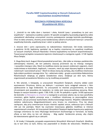 Parafia NMP Częstochowskiej w Starych Żukowicach OGŁOSZENIA DUSZPASTERSKIE ROCZNICA POŚWIĘCENIA KOŚCIOŁA 30 październik 2016 r. 1. „Kościół to nie tylko dom z kamieni i złota, Kościół żywy i prawdziwy to jest serc wspólnota” – śpiewamy w jednej z pieśni. W sposób szczególny tę prawdę pragniemy sobie uświadomić obchodząc uroczystość rocznicy poświęcenia naszego kościoła parafialnego. Choć to data umowna, chcemy przez każdorazowy udział w Eucharystii tworzyć i umacniać wspólnotę Kościoła, wspólnotę braci i sióstr w jednej wierze. 2. Jeszcze dziś i jutro zapraszamy na nabożeństwa różańcowe. Od środy natomiast, o godzinie 16.30, będziemy spotykać się w kaplicy cmentarnej na wspólnej modlitwie za naszych zmarłych, których Nazwiska i Imiona wypisaliśmy na kartach wspominkowych. Towarzyszyć jej będzie rozważanie tajemnic różańcowych a następnie o godz. 17.00 będzie Msza Święta. 3. Sługa Boży kard. August Hlond powiedział przed laty: „Nie tylko w miesiącu październiku odmawiajmy różaniec, ale ten pobożny zwyczaj przeniesie się na miesiąc następny i wszystkie miesiące roku. Niech ta modlitwa stanie się naszym ulubionym zajęciem, niech rozbrzmiewa w kościołach, kaplicach, i owszem, niech jej szept słyszany będzie w domach rodzinnych i warsztatach pracy”. Niech te słowa staną się zachętą, aby modlitwa różańcowa była stałym punktem naszego dnia. Tej – właściwie stałej - grupie uczestników Nabożeństw Różańcowych dziękuję za piękne świadectwo wiary. Dziękuje już dziś tym, którzy organizowali prowadzenie Różańca czy tę modlitwę prowadzili. 4. We wtorek, 1 listopada, w uroczystość Wszystkich Świętych, chcemy oddać cześć wyznawcom Chrystusa, którzy po dobrym i uczciwym życiu osiągnęli wieczne z Nim zjednoczenie w Jego królestwie. Ta uroczystość to również przypomnienie, że każdy chrześcijanin jest powołany do świętości, że niebo jest naszą prawdziwą ojczyzną. Msze Święte w naszym kościele o godz: 7.00; 9.00; 11.00. Po południu o godz: 14.00 zapraszam do kościoła na Nieszpory za zmarłych a następnie w procesji udamy się na nasz parafialny cmentarz, gdzie będzie procesja wraz z modlitwa różańcową za poszczególne stany zmarłych, zaś po procesji wysłuchamy okolicznościowego kazania. Wspólne nabożeństwo żałobne zakończymy błogosławieństwem przy krzyżu na cmentarzu. Przy tej okazji zachęcam, aby przy cmentarnym krzyżu również zapalać znicze, zwłaszcza tym o których nikt już nie pamięta. Niech tej czynności towarzyszy głęboka modlitwa w intencji zapomnianych zmarłych. W Uroczystość Wszystkich Świętych będzie kwesta przy wejściach naszego cmentarza na rzecz Wyższego Seminarium Duchownego w Tarnowie. Za każdą ofiarę w tym dniu na ten cel złożoną - Bóg zapłać. Serdecznie proszę, aby chętni do kwestowania zgłosili się w zakrystii. 5. W środę 2 listopada, przypada wspomnienie Wszystkich Wiernych Zmarłych. Modlimy się w tym dniu za tych, którzy nas poprzedzili w drodze do wieczności. Modlimy się za zmarłych, a w sposób szczególny za tych, którzy przez proces oczyszczenia w czyśćcowym ogniu oczekują wiecznego zjednoczenia z Panem. W naszym kościele będzie następujący porządek Mszy Świętych : 7.00 ; 9.00 oraz po południu w kaplicy cmentarnej o 16.30 modlitwa różańcowa połączona z wypominkami, a następnie o godz. 17.00 Msza Święta. 6. Na te listopadowe dni modlitwy i zadumy przygotujmy groby naszych bliskich, zatroszczmy się o porządek na cmentarzu. Śmieci, różne odpadki, zużyte znicze, stare kwiaty proszę składać tylko w wyznaczonych miejscach. Jutro – przy – sprzyjającej pogodzie zostanie wywieziona część śmieci z kontenera. 7. Od 1 do 8 listopada, każdorazowo odwiedzając cmentarz i odmawiając modlitwę za zmarłych, możemy uzyskać dla nich odpust zupełny, czyli darowanie doczesnej kary za grzechy odpuszczone już co do winy. Dla zyskania odpustu należy być w stanie łaski uświęcającej, przyjąć Komunię Świętą, wzbudzić akt wyzbycia się jakiegokolwiek przywiązania do grzechu oraz pomodlić się w intencjach papieskich. Nawiedzić cmentarz i wzbudzić sobie intencję za kogo chcemy odpust ofiarować Nie zaniedbujmy tej pobożnej praktyki – dzięki niej możemy pomóc tym, którzy poprzedzili nas w drodze do Domu Ojca. 8. W tym tygodniu przypadają: pierwszy czwartek, pierwszy piątek i pierwsza sobota miesiąca w następujący sposób: w czwartek poza modlitwą za zmarłych polecanych w wypominkach pomodlimy się za zmarłych kapłanów, zwłaszcza tych, którzy towarzyszyli nam na drogach wiary, przygotowywali i udzielali sakramentów oraz o nowe powołania do służby Bożej; w piątek dodatkowa Msza Św. o godz. 7.00 a po Niej Nabożeństwo ku czci Serca Pana Jezusa; Tradycyjnie odwiedzimy chorych po domach i w Domu Opieki z Komunia Świętą. w sobotę różańcowa modlitwa za zmarłych przed wieczorną Mszą Świętą stanowić będzie w tym miesiącu nasze pierwszosobotnie nabożeństwo. 9. W tym tygodniu patronują nam: 1 XI – Wszyscy Święci 4 XI – św. Karol Boromeusz, arcybiskup Mediolanu, wprowadzający gorliwie reformy Soboru Trydenckiego. 11. Życzymy wielu Bożych łask wszystkim obchodzącym urodziny i imieniny. Zmarłych, szczególnie zmarłego ostatnio + Marka Małek - pragniemy teraz polecać Bożemu miłosierdziu. Dobry Jezu… Ks. Stanisław Kita