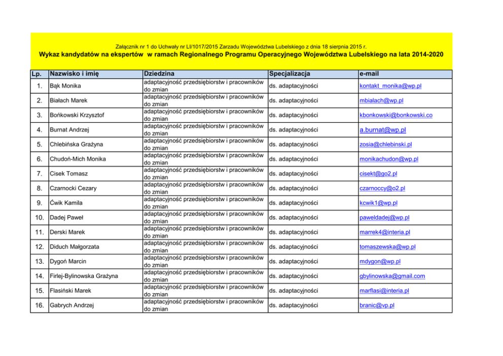 Załącznik nr 1 do Uchwały nr LI/1017/2015 Zarzadu Województwa Lubelskiego z dnia 18 sierpnia 2015 r. Wykaz kandydatów na ekspertów w ramach Regionalnego Programu Operacyjnego Województwa Lubelskiego na lata 2014-2020 Lp. Nazwisko i imię 1. Bąk Monika 2. Białach Marek 3. Bońkowski Krzysztof 4. Burnat Andrzej 5. Chlebińska Grażyna 6. Chudoń-Mich Monika 7. Cisek Tomasz 8. Czarnocki Cezary 9. Ćwik Kamila 10. Dadej Paweł 11. Derski Marek 12. Diduch Małgorzata 13. Dygoń Marcin 14. Firlej-Bylinowska Grażyna 15. Flasiński Marek 16. Gabrych Andrzej Dziedzina adaptacyjność przedsiębiorstw i pracowników do zmian adaptacyjność przedsiębiorstw i pracowników do zmian adaptacyjność przedsiębiorstw i pracowników do zmian adaptacyjność przedsiębiorstw i pracowników do zmian adaptacyjność przedsiębiorstw i pracowników do zmian adaptacyjność przedsiębiorstw i pracowników do zmian adaptacyjność przedsiębiorstw i pracowników do zmian adaptacyjność przedsiębiorstw i pracowników do zmian adaptacyjność przedsiębiorstw i pracowników do zmian adaptacyjność przedsiębiorstw i pracowników do zmian adaptacyjność przedsiębiorstw i pracowników do zmian adaptacyjność przedsiębiorstw i pracowników do zmian adaptacyjność przedsiębiorstw i pracowników do zmian adaptacyjność przedsiębiorstw i pracowników do zmian adaptacyjność przedsiębiorstw i pracowników do zmian adaptacyjność przedsiębiorstw i pracowników do zmian Specjalizacja e-mail ds. adaptacyjności [email protected] ds. adaptacyjności [email protected] ds. adaptacyjności [email protected] ds. adaptacyjności [email protected] ds. adaptacyjności [email protected] ds. adaptacyjności [email protected] ds. adaptacyjności [email protected] ds. adaptacyjności [email protected] ds. adaptacyjności [email protected] ds. adaptacyjności [email protected] ds. adaptacyjności [email protected] ds. adaptacyjności [email protected] ds. adaptacyjności [email protected] ds. adaptacyjności [email protected] ds. adaptacyjności [email protected] ds. adaptacyjności [email protected] 17. Gajda Witold 18. Gedyk Krzysztof 19. Giszczak Anna 20. Głasek Arkadiusz 21. Gola Arkadiusz 22. Grąciak-Makowska Anna 23. Grodowska Barbara 24. Kaczmarczyk Agnieszka 25. Kaczorowski Artur 26. Kalandyk Magdalena 27. Kocot Damian 28. Korczyńska Dorota 29. Korzeniak Jacek 30. Kubiak Dorota 31. Kuźniar-Pelc Agnieszka 32. Kwiatuszewska-Czerwonka Monika 33. Leśniewska Jolanta 34. Lewandowska Marta 35. Majchrzak Piotr adaptacyjność przedsiębiorstw i pracowników do zmian adaptacyjność przedsiębiorstw i pracowników do zmian adaptacyjność przedsiębiorstw i pracowników do zmian adaptacyjność przedsiębiorstw i pracowników do zmian adaptacyjność przedsiębiorstw i pracowników do zmian adaptacyjność przedsiębiorstw i pracowników do zmian adaptacyjność przedsiębiorstw i pracowników do zmian adaptacyjność przedsiębiorstw i pracowników do zmian adaptacyjność przedsiębiorstw i pracowników do zmian adaptacyjność przedsiębiorstw i pracowników do zmian adaptacyjność przedsiębiorstw i pracowników do zmian adaptacyjność przedsiębiorstw i pracowników do zmian adaptacyjność przedsiębiorstw i pracowników do zmian adaptacyjność przedsiębiorstw i pracowników do zmian adaptacyjność przedsiębiorstw i pracowników do zmian adaptacyjność przedsiębiorstw i pracowników do zmian adaptacyjność przedsiębiorstw i pracowników do zmian adaptacyjność przedsiębiorstw i pracowników do zmian adaptacyjność przedsiębiorstw i pracowników do zmian ds. adaptacyjności [email protected] ds. adaptacyjności [email protected] ds. adaptacyjności [email protected] ds. adaptacyjności [email protected] ds. adaptacyjności [email protected] ds. adaptacyjności [email protected] ds. adaptacyjności [email protected] ds. adaptacyjności [email protected] ds. adaptacyjności [email protected] ds. adaptacyjności [email protected] ds. adaptacyjności [email protected] ds. adaptacyjności [email protected] ds. adaptacyjności [email protected] ds. adaptacyjności [email protected] ds. adaptacyjności [email protected] ds. adaptacyjności MONIKAKWIATUSZEWSKA@ ZRWDORADZTWO.PL ds. adaptacyjności [email protected] ds. adaptacyjności [email protected] ds. adaptacyjności piotr.majchrzak@akademiarozwoj u.eu 36. Mączka Halina 37. Mich Kamil 38. Michna Kacper 39. Mirońska Justyna 40. Napierała Jarosław 41. Oleksiak Dariusz 42. Osowiecki Tadeusz 43. Ośka Tomasz 44. Paszko Przemysław 45. Pawłowska Małgorzata 46. Pietrzykowska Katarzyna 47. Polanowska Katarzyna 48. Posyniak Dorota 49. Proć Artur 50. Radwańska Paulina 51. Rokicki Tomasz 52. Rutka Antoni 53. Sarwa Ewa 54. Sawicki Kamil adaptacyjność przedsiębiorstw i pracowników do zmian adaptacyjność przedsiębiorstw i pracowników do zmian adaptacyjność przedsiębiorstw i pracowników do zmian adaptacyjność przedsiębiorstw i pracowników do zmian adaptacyjność przedsiębiorstw i pracowników do zmian adaptacyjność przedsiębiorstw i pracowników do zmian adaptacyjność przedsiębiorstw i pracowników do zmian adaptacyjność przedsiębiorstw i pracowników do zmian adaptacyjność przedsiębiorstw i pracowników do zmian adaptacyjność przedsiębiorstw i pracowników do zmian adaptacyjność przedsiębiorstw i pracowników do zmian adaptacyjność przedsiębiorstw i pracowników do zmian adaptacyjność przedsiębiorstw i pracowników do zmian adaptacyjność przedsiębiorstw i pracowników do zmian adaptacyjność przedsiębiorstw i pracowników do zmian adaptacyjność przedsiębiorstw i pracowników do zmian adaptacyjność przedsiębiorstw i pracowników do zmian adaptacyjność przedsiębiorstw i pracowników do zmian adaptacyjność przedsiębiorstw i pracowników do zmian ds. adaptacyjności [email protected] ds. adaptacyjności [email protected] ds. adaptacyjności [email protected] ds. adaptacyjności [email prote