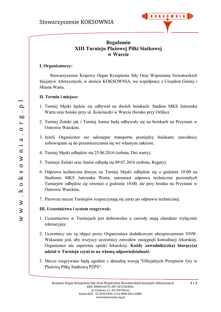 Stowarzyszenie KOKSOWNIA Regulamin XIII Turnieju Plażowej Piłki Siatkowej w Warcie I. Organizatorzy: Stowarzyszenie Krajowy Organ Krzepienia Siły Oraz Wspierania Nowatorskich Inicjatyw Atletycznych, w skrócie KOKSOWNIA, we współpracy z Urzędem Gminy i Miasta Warta. w w w . k o k s o w n i a . o r g . p l II. Termin i miejsce: 1. Turniej Męski będzie się odbywał na dwóch boiskach: Stadion MKS Jutrzenka Warta oraz boisko przy ul. Kościuszki w Warcie (boisko przy Orliku). 2. Turniej Żeński jak i Turniej Junior będą odbywały się na boiskach na Przystani w Ostrowie Warckim. 3. Jeżeli Organizator nie udostępni transportu pomiędzy boiskami zawodnicy zobowiązani są do przemieszczania się we własnym zakresie. 4. Turniej Męski odbędzie się 25.06.2016 (sobota, Dni warty). 5. Turnieje Żeński oraz Junior odbędą się 09.07.2016 (sobota, Regaty). 6. Odprawa techniczna drużyn na Turniej Męski odbędzie się o godzinie 10:00 na Stadionie MKS Jutrzenka Warta, natomiast odprawa techniczna pozostałych Turniejów odbędzie się również o godzinie 10:00, ale przy boisku na Przystani w Ostrowie Warckim. 7. Pierwsze mecze Turniejów rozpoczynają się zaraz po odprawie technicznej. III. Uczestnictwo i system rozgrywek: 1. Uczestnictwo w Turniejach jest dobrowolne a zawody mają charakter wyłącznie rekreacyjny. 2. Uczestnicy nie są objęci przez Organizatora dodatkowym ubezpieczeniem NNW. Wskazane jest, aby wszyscy uczestnicy zawodów zasięgnęli konsultacji lekarskiej. Organizator nie zapewnia opieki lekarskiej. Każdy zawodnik(czka) biorący(a) udział w Turnieju czyni to na własną odpowiedzialność. 3. Mecze rozgrywane będą zgodnie z aktualną wersją "Oficjalnych Przepisów Gry w Plażową Piłkę Siatkową PZPS": Krajowy Organ Krzepienia Siły Oraz Wspierania Nowatorskich Inicjatyw Atletycznych KRS: 0000416575, NIP: 8272303842 ul. Parkowa 11, 98-290 Warta Konto BGŻ - 32 2030 0045 1110 0000 0261 6880 www.koksownia.org.pl 1z3 Stowarzyszenie KOKSOWNIA (http://www.pzps.pl/Siatkowka-plazowa/Przepisy/Przepisy-FIVB-2013-2016Siatkowka-Plazowa.html), z wyłączeniem przepisów dotyczących zapisu punktów, oraz procedur. Jeżeli Organizator nie zapewni profesjonalnej obsługi sędziowskiej, mecze będą sędziowane przez osoby wyznaczone przez Organizatora. w w w . k o k s o w n i a . o r g . p l 4. Mecze będą rozgrywane systemem brazylijskim (Turniej Męski). W przypadku Turniejów Żeńskiego oraz Junior o systemie rozgrywek będzie decydowała ilość zgłoszonych par. Wielkość drabinki brazylijskiej w Turnieju Męskim jest uzależniona od liczby zgłoszonych par. 5. Nieobecność, bądź niekompletność zwycięskich drużyn (pierwsze cztery miejsca) z poprzedniego Turnieju Męskiego spowoduje rozstawienie zespołów w brazylijskim układzie poprzez losowanie na odprawie technicznej. Losowanie odbędzie się bez względu na obecność/nieobecność drużyn zgłoszonych do Turnieju. 6. W Turnieju Żeńskim udział mogą brać wyłącznie kobiety/dziewczęta bez względu na wiek. 7. W Turnieju Junior udział mogą brać wyłącznie chłopcy urodzeni w roku 1997 lub późniejszym. 8. Pary kategorii Junior oraz pary kategorii Mix mogą również zgłaszać swoje uczestnictwo do Turnieju Męskiego (mimo nazwy jest to kategoria Open), jednakże będą one dopisywane do listy głównej tylko wówczas, gdy będzie brakowało par męskich (do 16). Dopisywanie par Junior oraz mieszanych do Turnieju Męskiego będzie odbywało się zgodnie z kolejnością zgłoszeń tych par. IV. Zgłoszenia: 1. W Turniejach mogą uczestniczyć pary, które zgłoszą swój udział Organizatorowi, tzn. poprzez przesłanie zgłoszenia na adres e-mail: [email protected], lub też osobiście u jednego z Organizatorów (www.koksownia.org.pl). 2. W przypadku większej niż 16 liczby zgłoszonych par na Turniej Męski, obowiązuje bezwzględna kolejność zgłoszeń. Pozostali zostają wpisani na listę rezerwową, z której będą brane w kolejności zgłoszeń drużyny, w przypadku niestawienia się na Turniej par z listy głównej. 3. Jeżeli liczba zgłoszonych par będzie niewystarczająca zapisy będą obowiązywały również w dniu Turniejów. Krajowy Organ Krzepienia Siły Oraz Wspierania Nowatorskich Inicjatyw Atletycznych KRS: 0000416575, NIP: 8272303842 ul. Parkowa 11, 98-290 Warta Konto BGŻ - 32 2030 0045 1110 0000 0261 6880 www.koksownia.org.pl 2z3 Stowarzyszenie KOKSOWNIA V. Nagrody 1. Zawodnicy i zawodniczki drużyn, którzy zajmą miejsca I-III otrzymają nagrody rzeczowe. Uzyskane miejsce będzie określało kolejność wyboru nagród, począwszy od miejsca I, a skończywszy na miejscu III. Zawodnicy zgłoszeni do Turnieju Męskiego otrzymają koszulki do gry. VI. Prawa i obowiązki drużyn: w w w . k o k s o w n i a . o r g . p l 1. Każda drużyna przystępując do rozgrywek wyraża zgodę na warunki uczestnictwa określone niniejszym regulaminem. 2. Każda drużyna powinna posiadać własne piłki do rozgrzewki. Organizator zapewnia jedynie piłki meczowe. 3. Za zniszczenia obiektów lub jego wyposażenia wszelkie koszty związane z jego naprawą ponoszą zawodnicy zespołu. 4. Drużyny w trakcie trwania zawodów odpowiedzialne są za osoby towarzyszące im oraz zobowiązane są do niesienia czynnej pomocy w jawnych przypadkach naruszenia porządku publicznego. 5. Zawodnicy zgłoszeni do Turnieju Męskiego mają obowiązek gry w otrzymanych od Organizatora koszulkach. VII. Postanowienia końcowe: 1. Organizator zastrzega sobie prawo wprowadzenia zmian w powyższym regulaminie. 2. Organizator zastrzega sobie prawo do upublicznienia wyników, zdjęć, imion i nazwisk uczestników oraz zamieszczania informacji o zawodach na stronach internetowych, w prasie, radiu i TV oraz wykorzystania zdjęć uczestników w wydawnictwach, gadżetach i innych materiałach promujących Stowarzyszenie KOKSOWNIA. 3. Organizator nie ponosi odpowiedzialności za rzeczy pozostawione lub zagubione. 