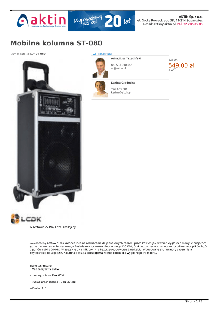Mobilna kolumna ST-080 Numer katalogowy:ST-080 Twój konsultant Arkadiusz Trzebiński tel. 503 030 555 [email protected] NOWOŚĆ W OFERCIE 549.00 zł 549.00 zł z VAT Karina Gładecka 796 603 606 [email protected] w zestawie 2x MIc/ Kabel zasilajacy. -==-Mobilny zestaw audio karaoke idealne rozwiazanie do plenerowych zabaw , przedstawien jak również wygłoszeń mowy w miejscach gdzie nie ma zasilania sieciowego.Posiada mocny wzmacniacz o mocy 150 Wat, 5 pkt equalizer oraz wbudowany odtwarzacz plików Mp3 z portów usb i SD/MMC. W zestawie dwa mikrofony :1 bezprzewodowy oraz 1 na kablu. Wbudowane akumulatory zapemniaja użytkowanie do 3 godzin. Kolumna posiada teleskopowa rączke i kółka dla wygodnego transportu. Dane techniczne: - Moc szczytowa 150W - moc wyjściowa:Max 80W - Pasmo przenoszenia 70 Hz-20kHz -Woofer 8`` Strona 1 / 2 -głośnik wysokotonowy 3 `` -Kabel mikrofonowy:3mtr -Zasilanie 220-240Vac/50Hz -Akumulator 12V -Wymiary 225x280x525 mm -Waga 8 kg Strona 2 / 2 Powered by TCPDF (www.tcpdf.org)