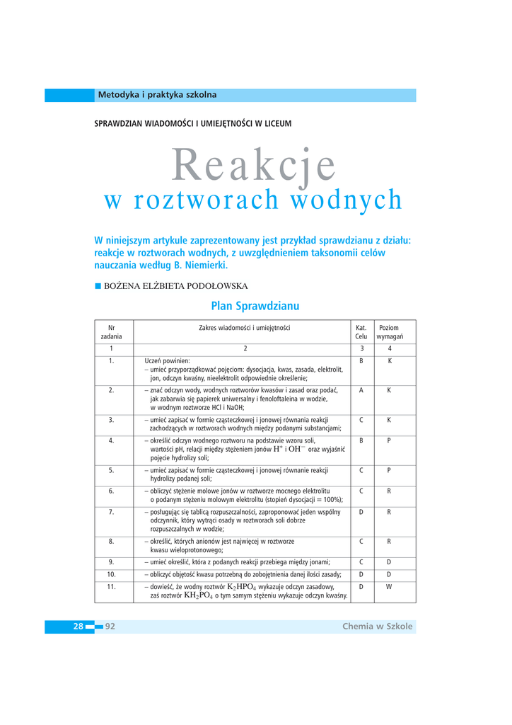Metodyka i praktyka szkolna SPRAWDZIAN WIADOMOÂCI I UMIEJ¢TNOÂCI W LICEUM Reakcje w roztworach wodnych W niniejszym artykule zaprezentowany jest przyk∏ad sprawdzianu z dzia∏u: reakcje w roztworach wodnych, z uwzgl´dnieniem taksonomii celów nauczania wed∏ug B. Niemierki. BO˚ENA EL˚BIETA PODO¸OWSKA Plan Sprawdzianu 28 Nr zadania Zakres wiadomoÊci i umiej´tnoÊci Kat. Celu Poziom wymagaƒ 1 2 3 4 1. Uczeƒ powinien: – umieç przyporzàdkowaç poj´ciom: dysocjacja, kwas, zasada, elektrolit, jon, odczyn kwaÊny, nieelektrolit odpowiednie okreÊlenie; B K 2. – znaç odczyn wody, wodnych roztworów kwasów i zasad oraz podaç, jak zabarwia si´ papierek uniwersalny i fenoloftaleina w wodzie, w wodnym roztworze HCl i NaOH; A K 3. – umieç zapisaç w formie czàsteczkowej i jonowej równania reakcji zachodzàcych w roztworach wodnych mi´dzy podanymi substancjami; C K 4. – okreÊliç odczyn wodnego roztworu na podstawie wzoru soli, wartoÊci pH, relacji mi´dzy st´˝eniem jonów H+ i OH− oraz wyjaÊniç poj´cie hydrolizy soli; B P 5. – umieç zapisaç w formie czàsteczkowej i jonowej równanie reakcji hydrolizy podanej soli; C P 6. – obliczyç st´˝enie molowe jonów w roztworze mocnego elektrolitu o podanym st´˝eniu molowym elektrolitu (stopieƒ dysocjacji = 100%); C R 7. – pos∏ugujàc si´ tablicà rozpuszczalnoÊci, zaproponowaç jeden wspólny odczynnik, który wytràci osady w roztworach soli dobrze rozpuszczalnych w wodzie; D R 8. – okreÊliç, których anionów jest najwi´cej w roztworze kwasu wieloprotonowego; C R 9. – umieç okreÊliç, która z podanych reakcji przebiega mi´dzy jonami; C D 10. – obliczyç obj´toÊç kwasu potrzebnà do zoboj´tnienia danej iloÊci zasady; D D 11. – dowieÊç, ˝e wodny roztwór K2 HPO4 wykazuje odczyn zasadowy, zaÊ roztwór KH2 PO4 o tym samym st´˝eniu wykazuje odczyn kwaÊny. D W 92 Chemia w Szkole Metodyka i praktyka szkolna TreÊç sprawdzianu Wymagania konieczne Zadanie 1. Poj´ciom z kolumny I przyporzàdkuj strza∏kami odpowiednie okreÊlenie z kolumny II I II 1. dysocjacja jonowa a) Substancja, której wodny roztwór przewodzi pràd. 2. kwas wed∏ug teorii Arrheniusa b) Substancja, która wprowadzona do wody zwi´ksza st´˝enie jonów wodorotlenkowych. 3. zasada wed∏ug teorii Arrheniusa c) Substancja, której wodny roztwór nie przewodzi pràdu. 4. elektrolit d) Substancja, która wprowadzona do wody zwi´ksza st´˝enie jonów wodorowych. 5. jon e) Rozpad kryszta∏ów jonowych oraz czàsteczek polarnych na jony pod wp∏ywem czàsteczek wody. 6. nieelektrolit f) NoÊnik ∏adunku w roztworze elektrolitu. 3 pkt. Zadanie 2. Uzupe∏nij tabelk´: 6 pkt. Wzór zwiàzku Odczyn wodnego roztworu tego zwiàzku Barwa fenoloftaleiny HCl NaOH H2 O kwaÊny bezbarwna Barwa papierka uniwersalnego bezbarwna Zadanie 3. Uzupe∏nij zapisy czàsteczkowe równaƒ reakcji zachodzàcych w roztworach wodnych mi´dzy podanymi substancjami. Nast´pnie zapisz je w formie jonowej pe∏nej i jonowej skróconej (odzwierciedlajàcej jony aktywne chemicznie). + NaOH −→ .................................... + .................................... ........................................................................................................................................................ ........................................................................................................................................................ a) HNO3 b) CuSO4 + KOH −→ .................................... + .................................... ........................................................................................................................................................ ................................................................................................................................. 2/2005 6 pkt. 93 29 Metodyka i praktyka szkolna Wymagania podstawowe Zadanie 4. Rozwià˝ logogryf. WyjaÊnij poj´cie stanowiàce rozwiàzanie logogryfu. 1. Zjawisko polegajàce na otaczaniu jonów elektrolitu, czàsteczek substancji rozpuszczonej przez czàsteczki wody. 2. Odczyn wodnego roztworu FeCl3 . 3. Odczyn wodnego roztworu Na2 CO3 . 4. Je˝eli st´˝enie: [H+ ] jest.......... [OH− ], to odczyn jest oboj´tny. 5. Odczyn wodnego roztworu NaCl. 6. Odczyn roztworu jest …………od ró˝nicy st´˝eƒ jonów H+ i OH− . 7. Je˝eli [H+ ] jest.......... od [OH− ], to odczyn jest zasadowy. 8. Odczyn wodnego roztworu o pH = 12. 9. Odczyn wodnego roztworu o pH = 3. ............................................................................................................................................. 10 pkt. Zadanie 5. Uzupe∏nij zapis czàsteczkowy równania reakcji hydrolizy azotanu(III) sodu a nast´pnie podaj zapis jonowy i jonowy skrócony: NaNO2 + H2 O ............ + ............. ......................................................................... ......................................................................... 3 pkt. Wymagania rozszerzajàce Zadanie 6. St´˝enie molowe jonów potasu w 0,1–molowym roztworze siarczku potasu (stopieƒ dysocjacji = 100%) wynosi: a) 10−1 mol/dm3 c) 2 · 10−1 mol/dm3 b) 10−2 mol/dm3 d) 2 · 10−2 mol/dm3 PodkreÊl prawid∏owà odpowiedê. 1 pkt. Zadanie 7. W dwóch zlewkach znajdujà si´ nast´pujàce roztwory soli: Majàc do dyspozycji tablic´ rozpuszczalnoÊci, znajdê jeden wspólny odczynnik, który wytràci osady w obu zlewkach. Napisz w formie czàsteczkowej, jonowej i jonowej skróconej równania odpowiednich reakcji. .................................................................................................................................................. .................................................................................................................................................. 6 pkt. 30 94 Chemia w Szkole Metodyka i praktyka szkolna Zadanie 8. W roztworze kwasu H3 PO4 oprócz kat