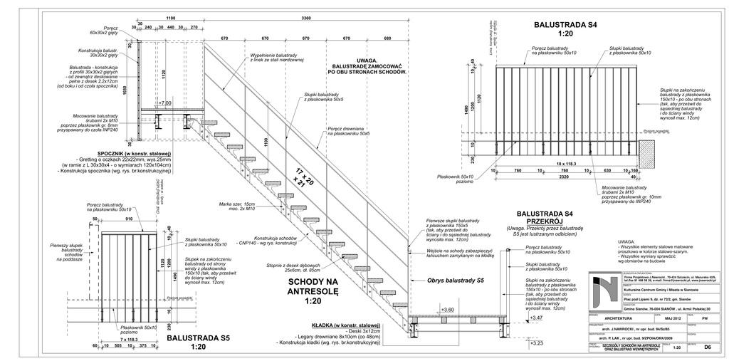 30 Poręcz 60x30x2 gięty 240 30 440 30 3360 270 670 670 680 1650 1120 Słupki balustrady z płaskownika 50x5 1490 1200 +7.00 Mocowanie balustrady śrubami 2x M10 poprzez płaskownik gr. 8mm przyspawany do czoła INP240 Słupki na zakończeniu balustrady z płaskownika 150x10 - po obu stronach (tak, aby prześwit do sąsiedniej balustrady i do ściany windy wynosił max. 12cm) Poręcz drewniana na płaskowniku 50x5 Poziom posadzki 230 17 x x2 21 0 Linia konstrukcji szybu windy - w widoku Poręcz balustrady na płaskowniku 50x10 10 1100 30 SPOCZNIK (w konstr. stalowej) - Gretting o oczkach 22x22mm, wys.25mm (w ramie z L 30x30x4 - o wymiarach 120x104cm) - Konstrukcja spocznika (wg. rys. br.konstrukcyjnej) 40 10 Słupki balustrady z płaskownika 50x10 1490 1200 1120 18 x 118.3 10 Słupek na zakończeniu balustrady od strony windy z płaskownika 150x10 (tak, aby prześwit do ściany windy wynosił max. 12cm) Pierwsze słupki balustrady z płaskownika 150x5 (tak, aby prześwit do ściany i do sąsiedniej balustrady wynosiła max. 12cm) 10 7 x 118.3 505 10 375 10 230 BALUSTRADA S5 1:20 630 10 160 40 (Uwaga. Przekrój przez balustradę S5 jest lustrzanym odbiciem) UWAGA. - Wszystkie elementy stalowe malowane proszkowo w kolorze stalowo-szarym. - Wszystkie wymiary sprawdzić wg obmiarów na budowie Poręcz balustrady na płaskowniku 50x10 JEDNOSTKA PROJEKTOWA: Obrys balustrady S5 +3.60 KŁADKA (w konstr. stalowej) - Deski 3x12cm - Legary drewniane 8x10cm (co 48cm) - Konstrukcja kładki (wg. rys. br.konstrukcyjnej) 10 BALUSTRADA S4 PRZEKRÓJ Firma Projektowa J.Nawrocki , 70-424 Szczecin, ul. Mazurska 42/6, tel./fax 91 488 58 26, e-mail: [email protected], www.jnawrocki.pl Słupki na zakończeniu balustrady z płaskownika 150x10 - po obu stronach (tak, aby prześwit do sąsiedniej balustrady i do ściany windy wynosił max. 12cm) +3.47 Płaskownik 50x10 poziomo 760 2320 Słupki balustrady z płaskownika 50x10 Stopnie z desek dębowych 25x6cm, dł. 85cm SCHODY NA ANTRESOLĘ 1:20 10 Mocowanie balustrady śrubami 2x M10 poprzez płaskownik gr. 10mm przyspawany do INP240 Wejście na schody zabezpieczyć łańcuchem zamykanym na kłódkę 10 Poziom posadzki Konstrukcja schodów - CNP140 - wg rys. konstrukcji 760 Płaskownik 50x10 poziomo Marka szer. 15cm moc. 2x M10 910 Pierwszy słupek balustrady schodów na poddasze 60 Słupki balustrady z płaskownika 50x10 40 UWAGA. BALUSTRADĘ ZAMOCOWAĆ PO OBU STRONACH SCHODÓW. Poręcz balustrady na płaskowniku 50x10 1120 Wypełnienie balustrady z linek ze stali nierdzewnej BALUSTRADA S4 1:20 10 Konstrukcja balustr. 30x30x2 gięty 50 670 30 670 Balustrada - konstrukcja z profili 30x30x2 giętych - od zewnątrz deskowanie pełne z desek 2,2x12cm (od boku i od czoła spocznika) Linia konstrukcji szybu windy - w widoku 1100 30 OBIEKT: Kulturalne Centrum Gminy i Miasta w Sianowie ADRES: Plac pod Lipami 9, dz. nr 72/2, gm. Sianów INWESTOR: Gmina Sianów, 76-004 SIANÓW , ul. Armii Polskiej 30 BRANŻA: FAZA: DATA: ARCHITEKTURA PW MAJ 2012 PROJEKTANT: PODPIS: arch. J.NAWROCKI , nr upr. bud. 94/Sz/85 WERYFIKATOR: PODPIS: arch. P. LAK , nr upr. bud. 9/ZPOIA/OKK/2009 +3.23 TREŚĆ RYSUNKU: SZCZEGÓŁY SCHODÓW NA ANTRESOLĘ ORAZ BALUSTRAD WEWNĘTRZNYCH NR RYS.: SKALA: 1:20 D6